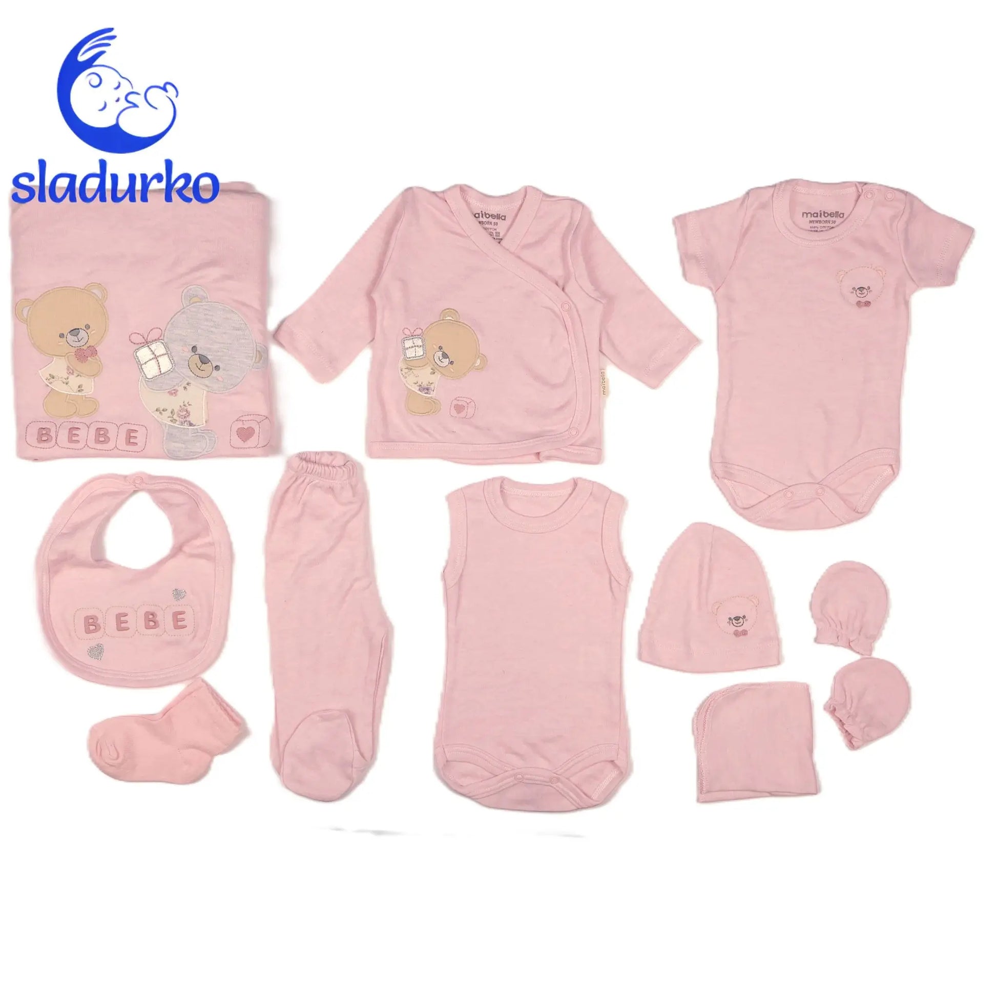 - Пълен Комплект за Новородено: Включва всичко необходимо, за да облечете вашето бебе от главата до петите: боди с къс ръкав, боди тип потник, горна блузка с прехлупване, панталонче с крачета (ританки), шапчица, лигавник, ръкавички против одраскване, чорапки, малка кърпичка/кърпа за лице и голяма пелена с щампа.