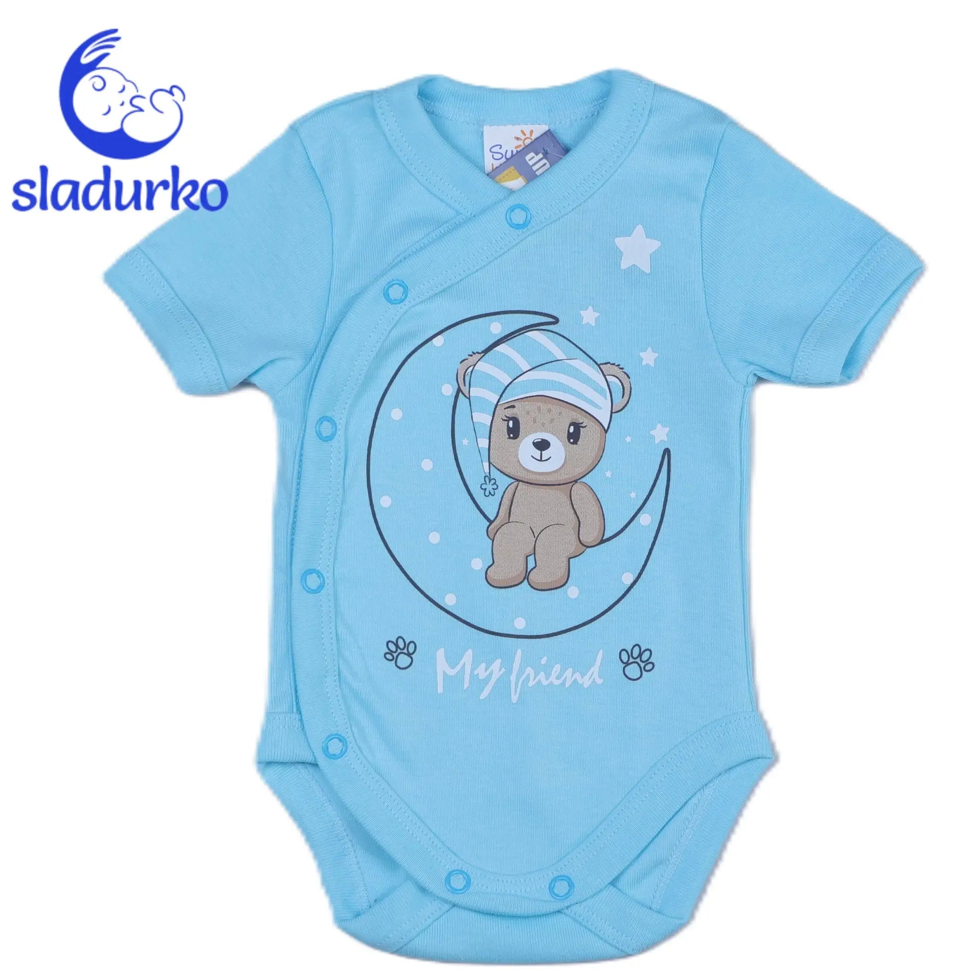 Синьо-зелено боди с къс ръкав със странично закопчаване "Моят приятел" е идеалното облекло за вашето бебе. Изработено от мека и дишаща материя, осигурява комфорт през целия ден. Страничното закопчаване улеснява обличането и събличането, дори и на най-малките бебета.