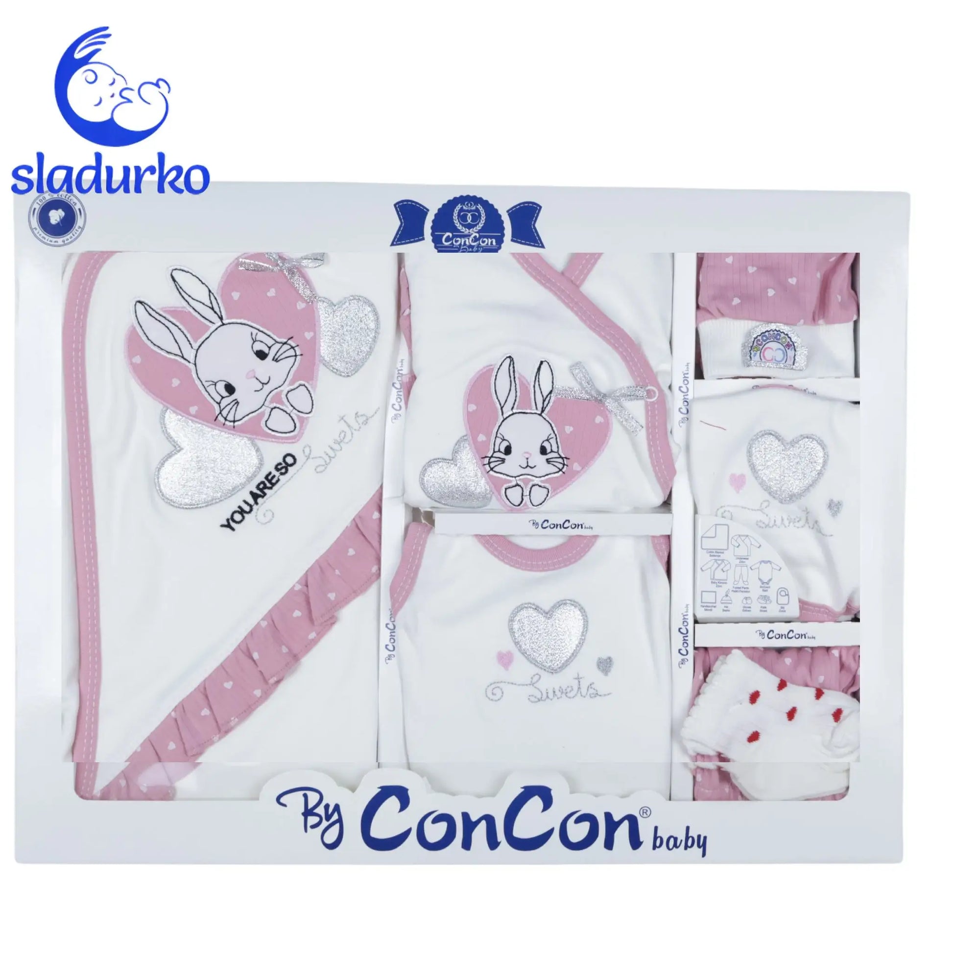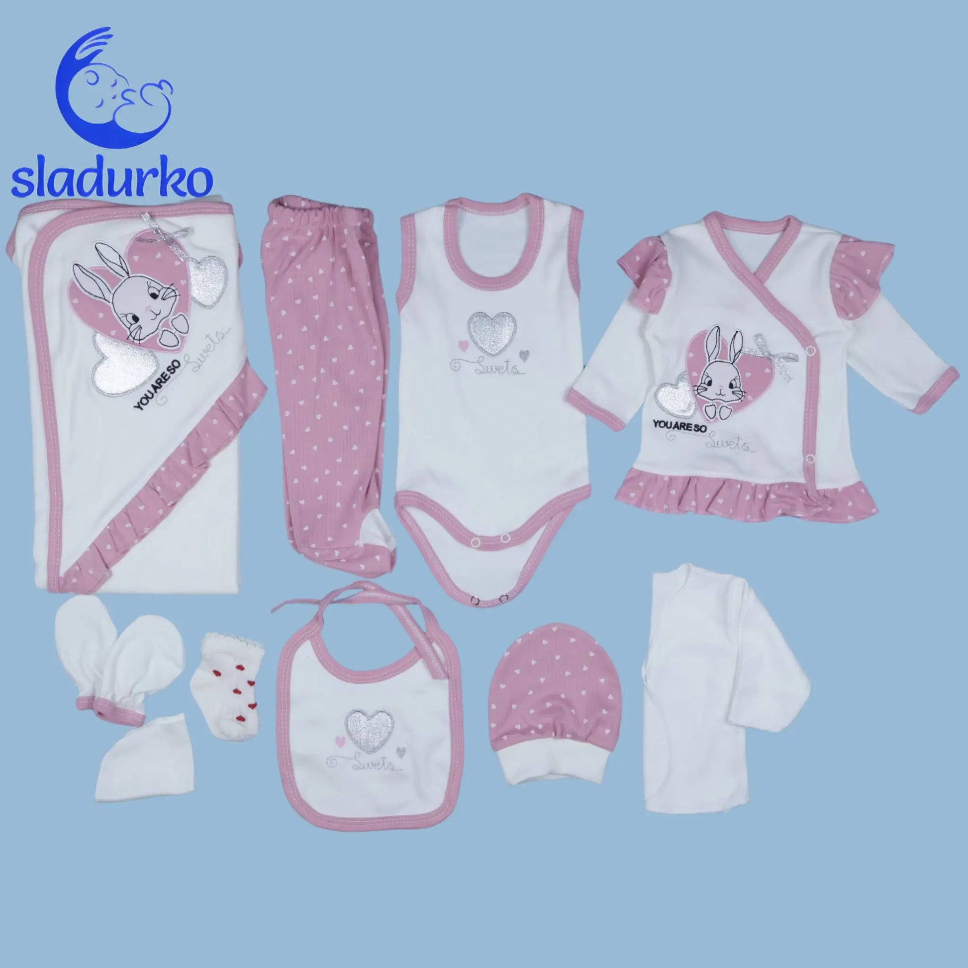 Посрещнете вашето малко момиченце с този очарователен и пъстър комплект за изписване от 10 части! Комбинирайки нежно розово с класическо бяло и сладки точки, този комплект осигурява комфорт и изключителна сладост за първите моменти на вашето бебе.