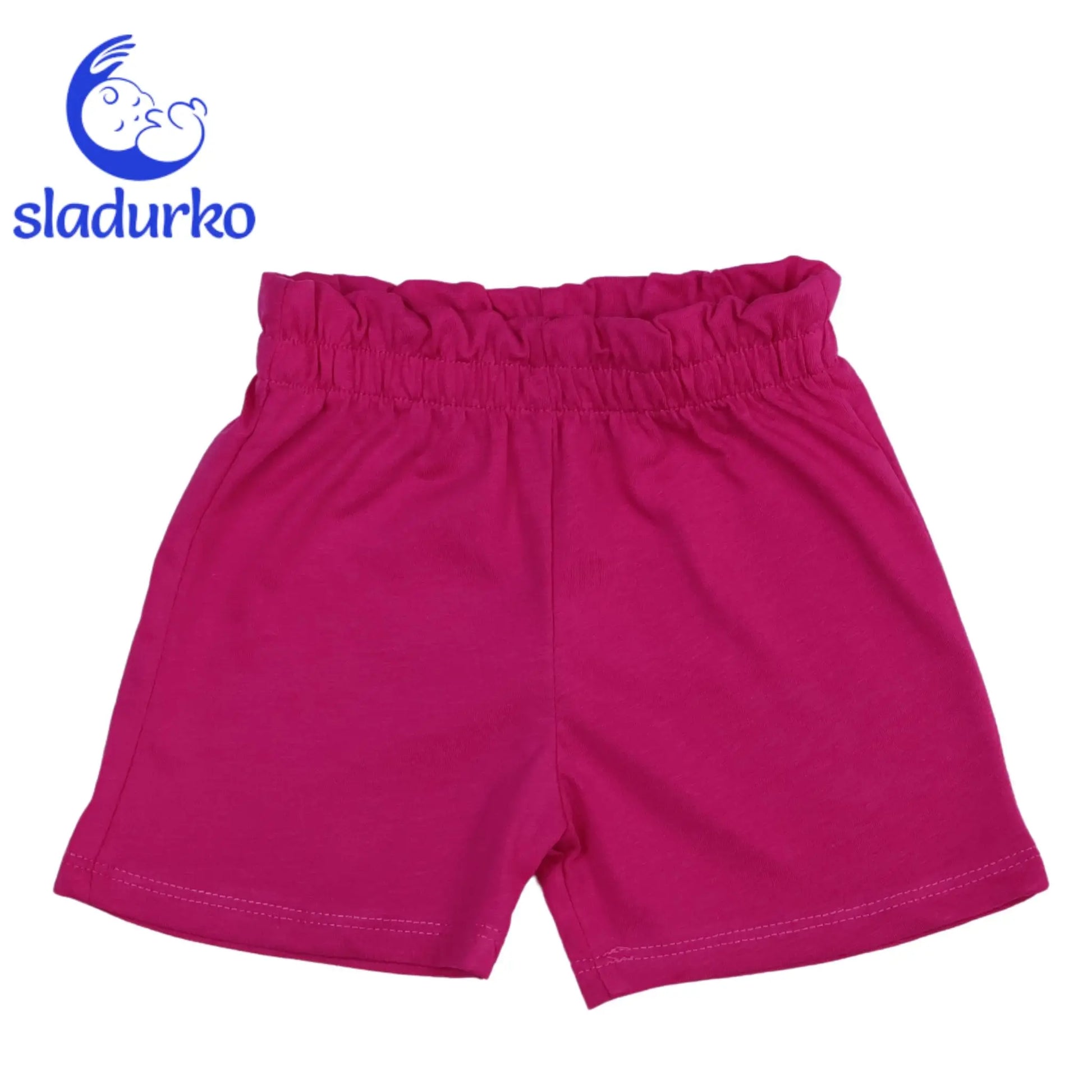 Очарователен детски комплект за момиче, състоящ се от удобна блузка с къдрички на ръкавите и сладки къси панталонки в ярък розов цвят. Блузката е с апликация