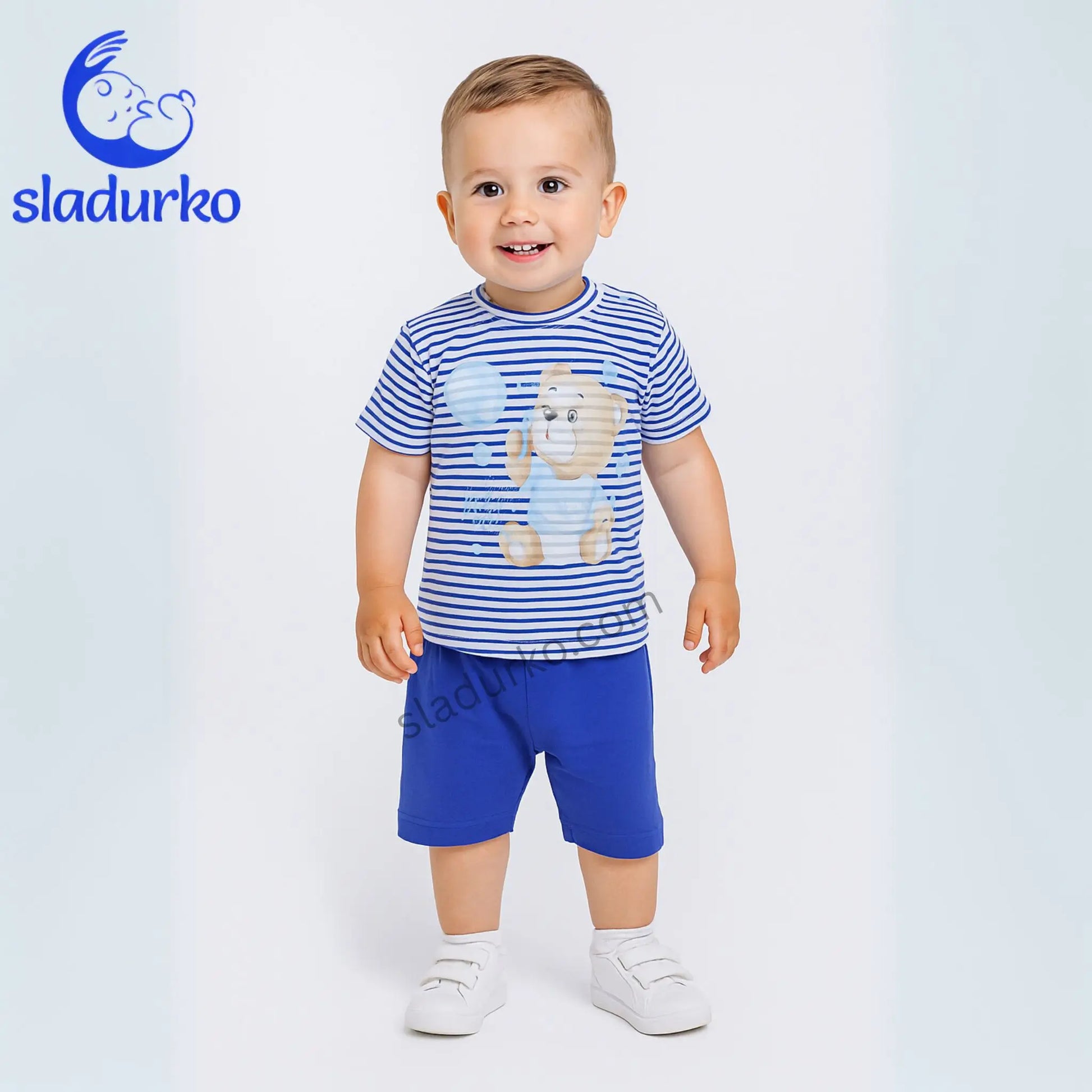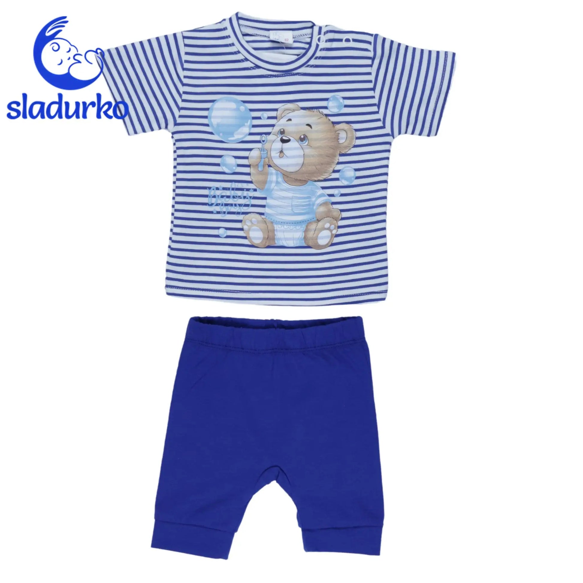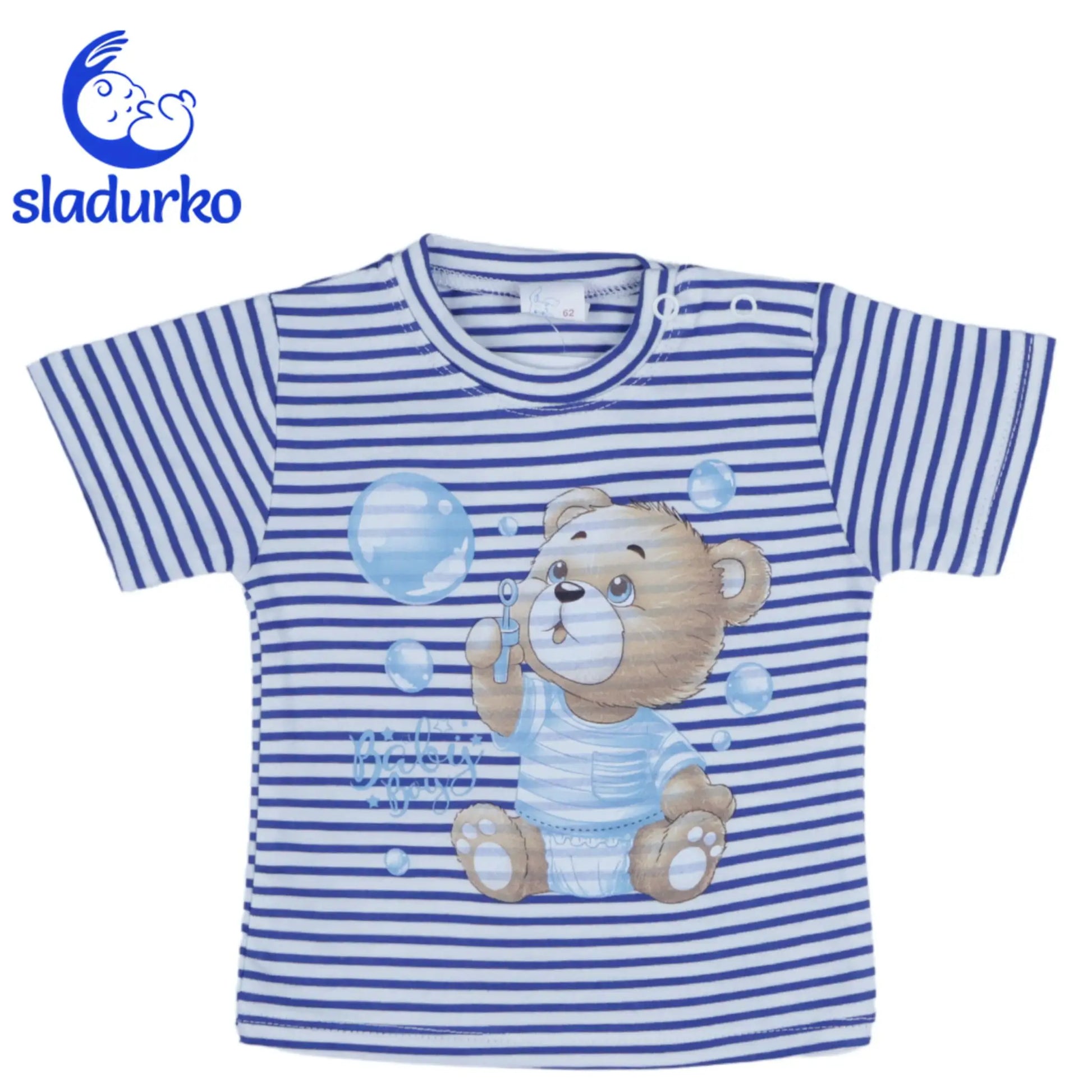 - Тениска: Бяла тениска на синьо райе с къс ръкав и апликация на сладко мече, духащо балончета. Закопчаване с копчета на рамото за лесно обличане.
