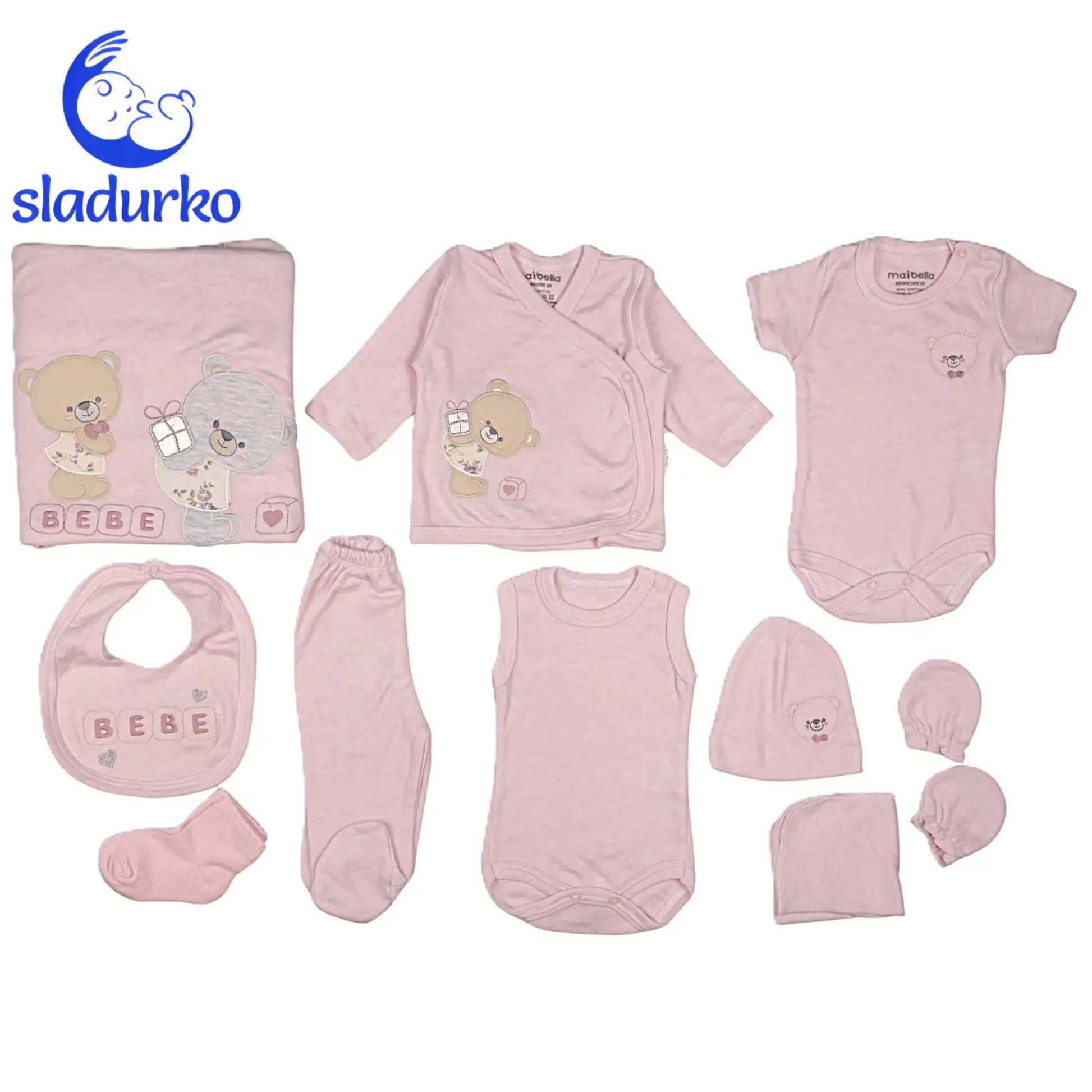 - Пълен Комплект за Новородено: Включва всичко необходимо, за да облечете вашето бебе от главата до петите: боди с къс ръкав, боди тип потник, горна блузка с прехлупване, панталонче с крачета (ританки), шапчица, лигавник, ръкавички против одраскване, чорапки, малка кърпичка/кърпа за лице и голяма пелена с щампа.