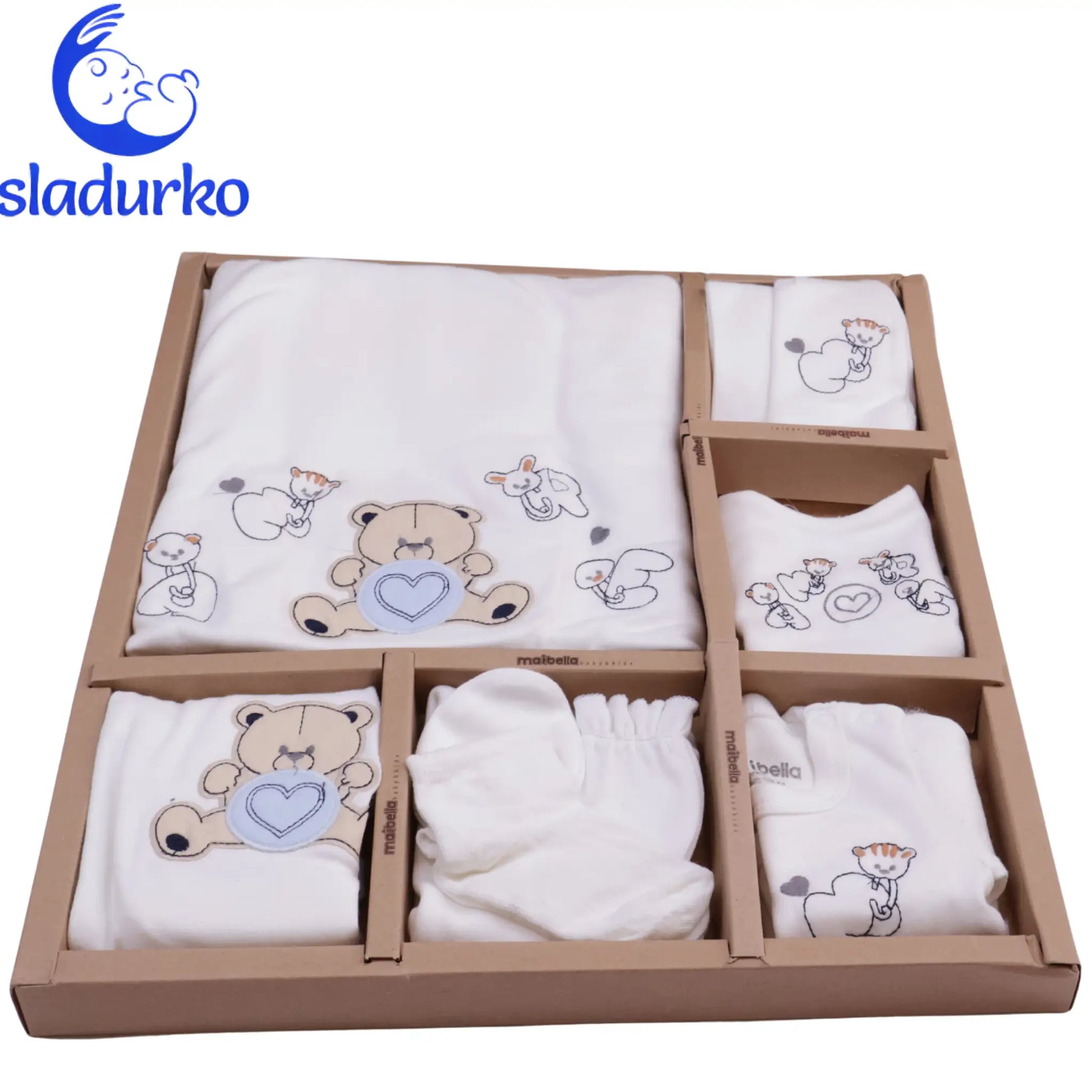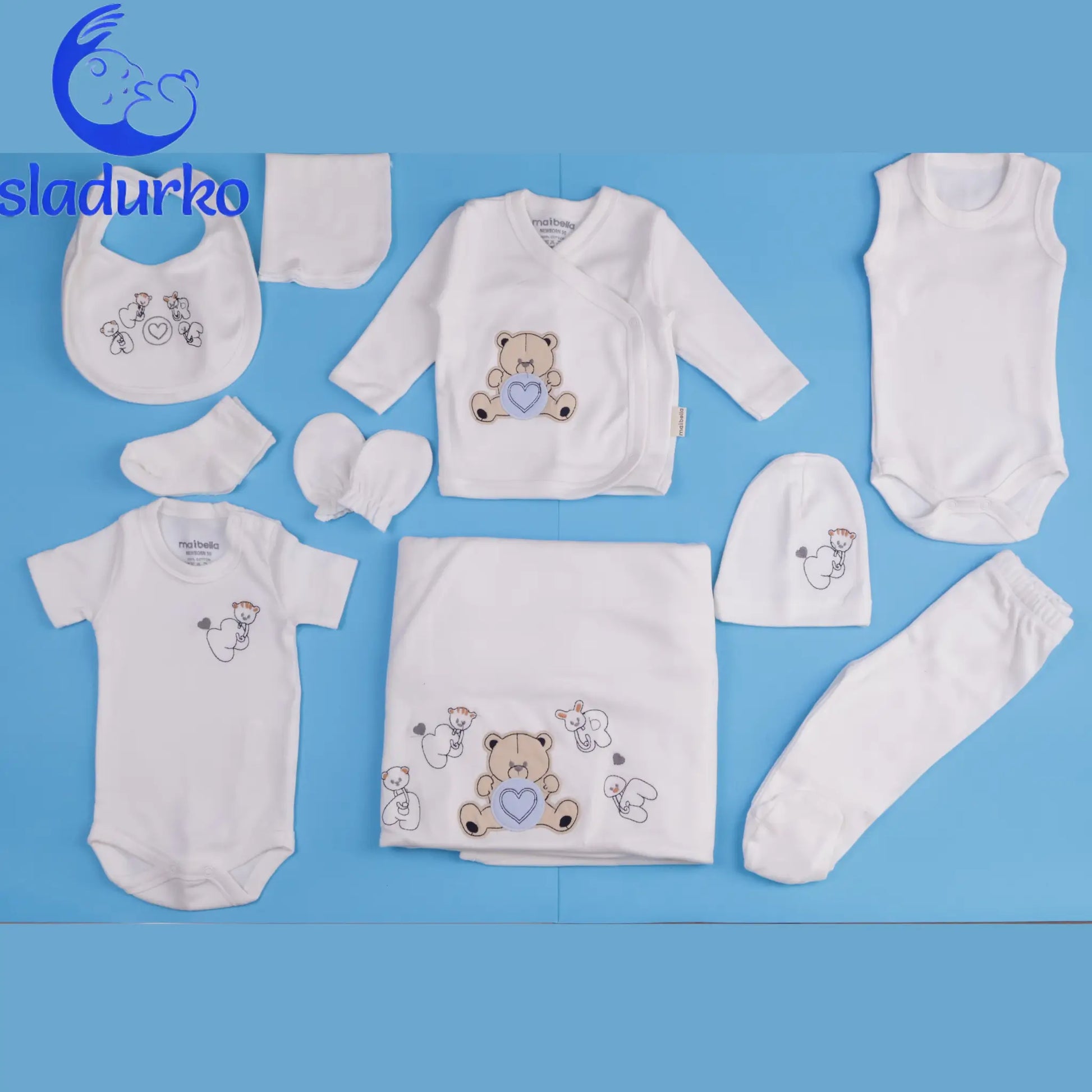 - Пълен Комплект за Новородено: Включва всички основни елементи, необходими за деня на изписването и първите дни у дома: боди с къс ръкав, боди без ръкав (тип потник), ританки с цяло стъпало, горна блузка с прехлупване, шапчица, лигавник, ръкавички против одраскване, чорапки, малка кърпичка за лице и мека пелена.