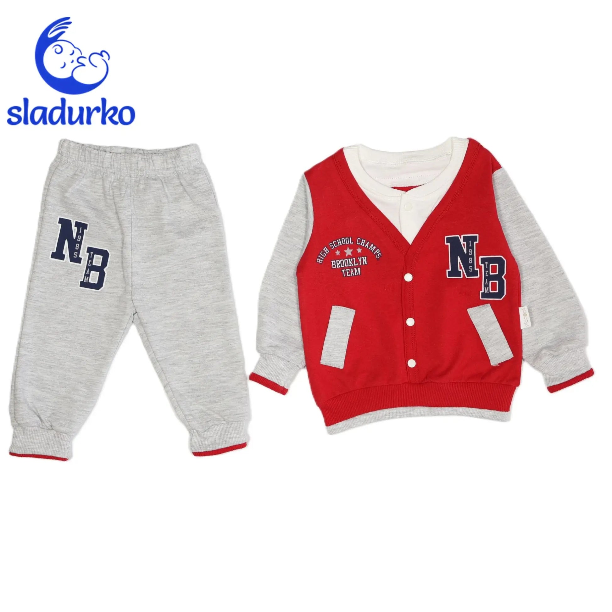 Купи сега на своя малчуган стилен комплект от две части за малки господа, състоящ се от меко сиво долнище и блузка, която имитира модерен елек с копчета и декоративни джобчета. Блузката впечатлява с контрастни червени и сиви цветове, дизайнът е със щампа както отпред така и на гърба. Идеален за ежедневието, комфортен и подходящ за активни деца. Перфектният избор за стил и удобство!