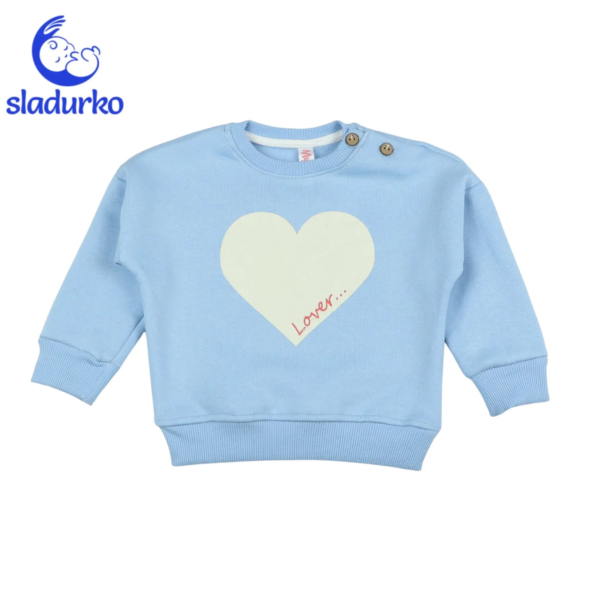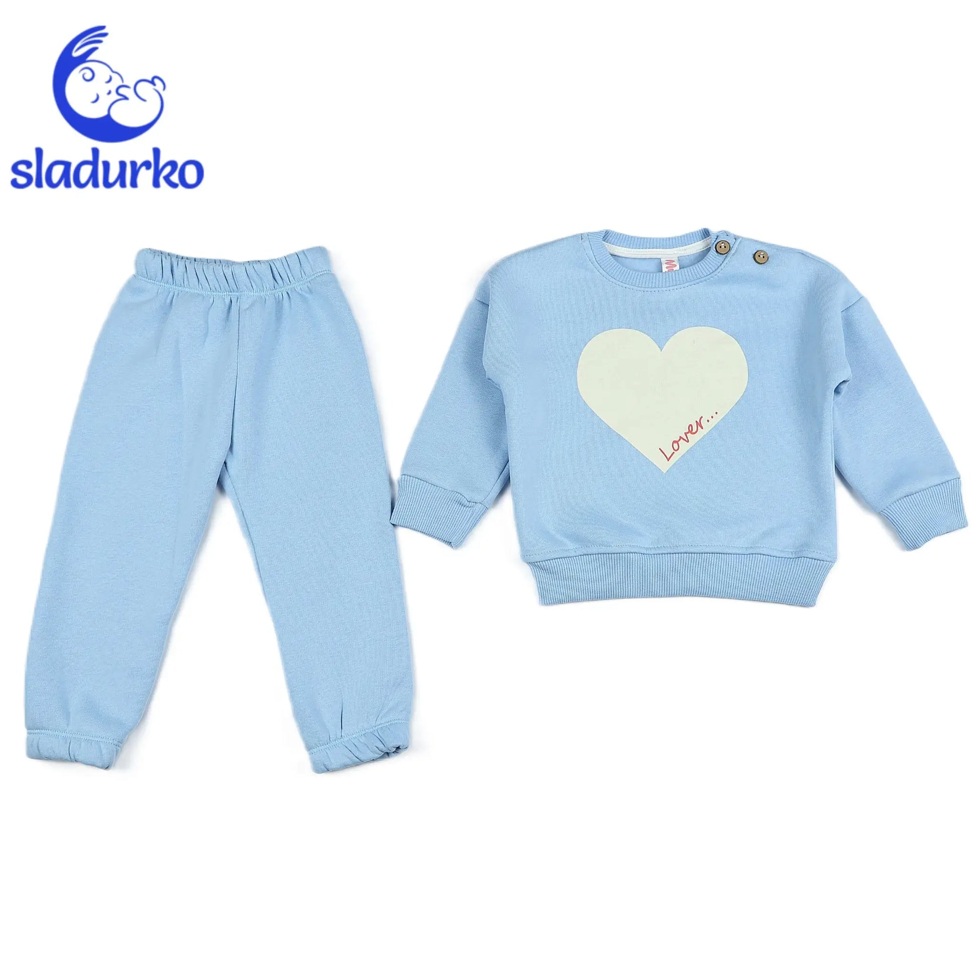 100% памук Ватиран комплект от две части. Блузка и панталонки . Принт сърце на блузката и надпис Lover.... Закопчаване с копчета на рамото. Произведено в Турция.