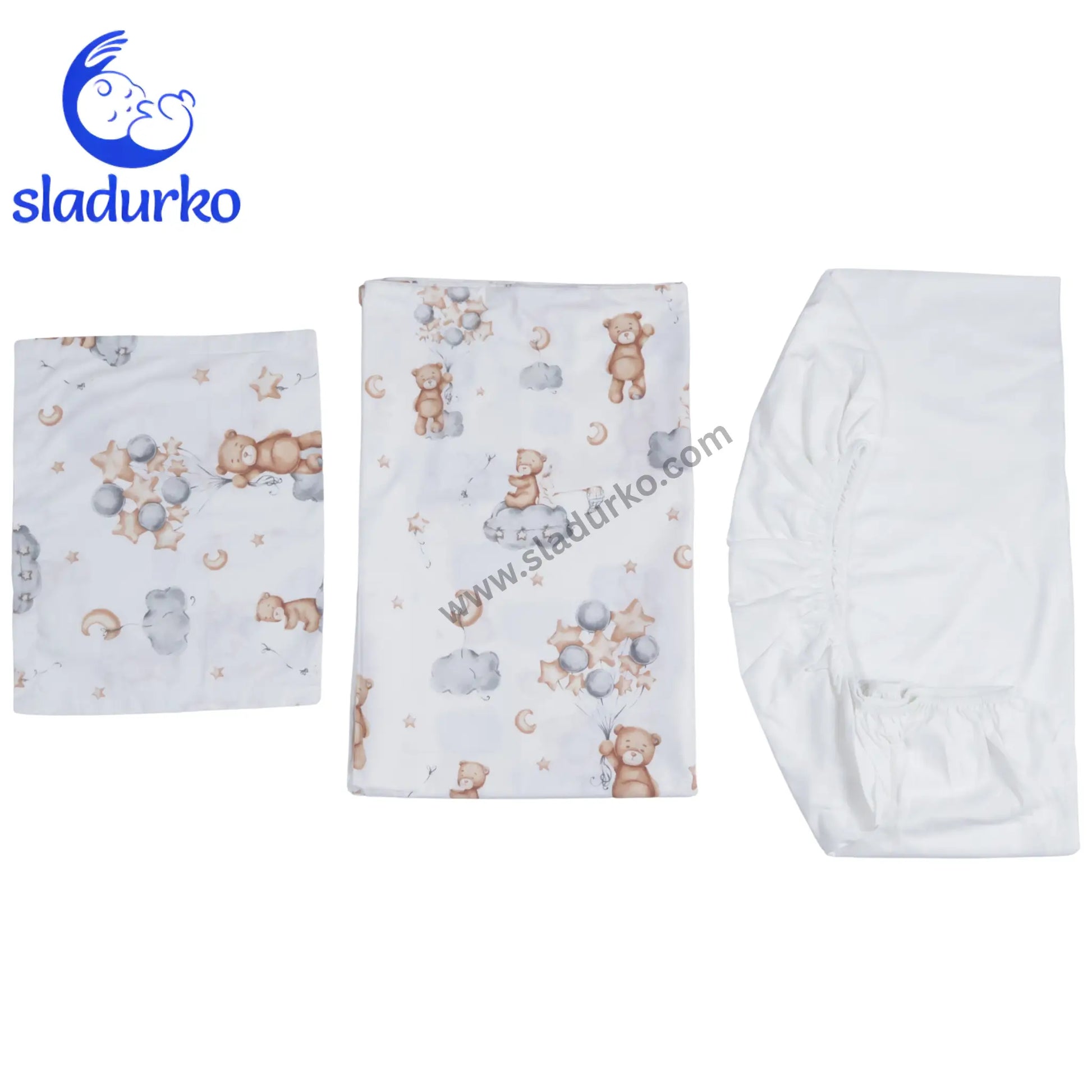 Нежен и практичен спален комплект от 100 % памучен ранфорс, включващ калъфка за възглавница, долен чаршаф с ластик и плик (горен чаршаф с джоб) за матрак 70×140 см.