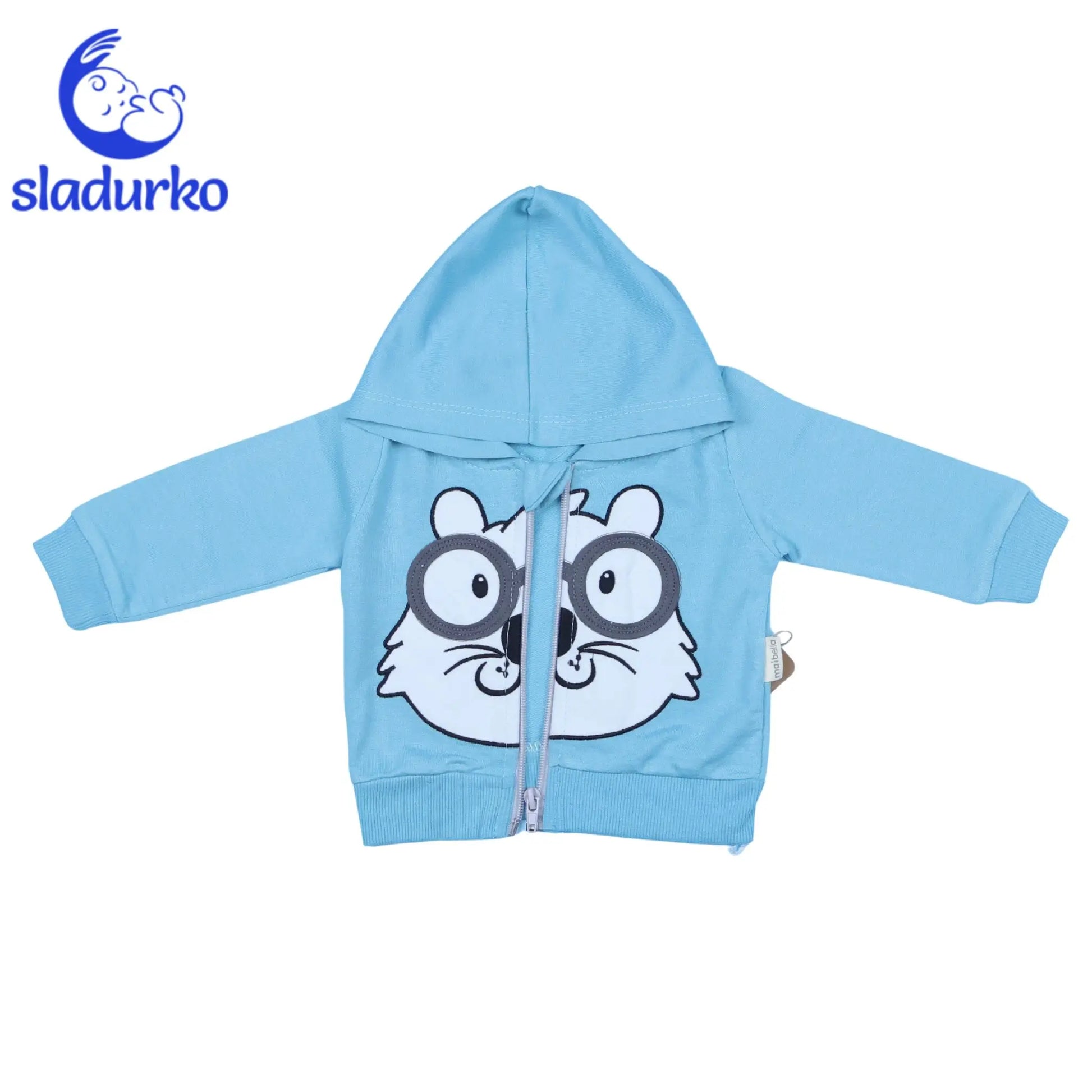 - Суичър: Светлосин суичър с качулка, с апликация на сладко животинче с очила отпред. Закопчава се с цип за лесно обличане.