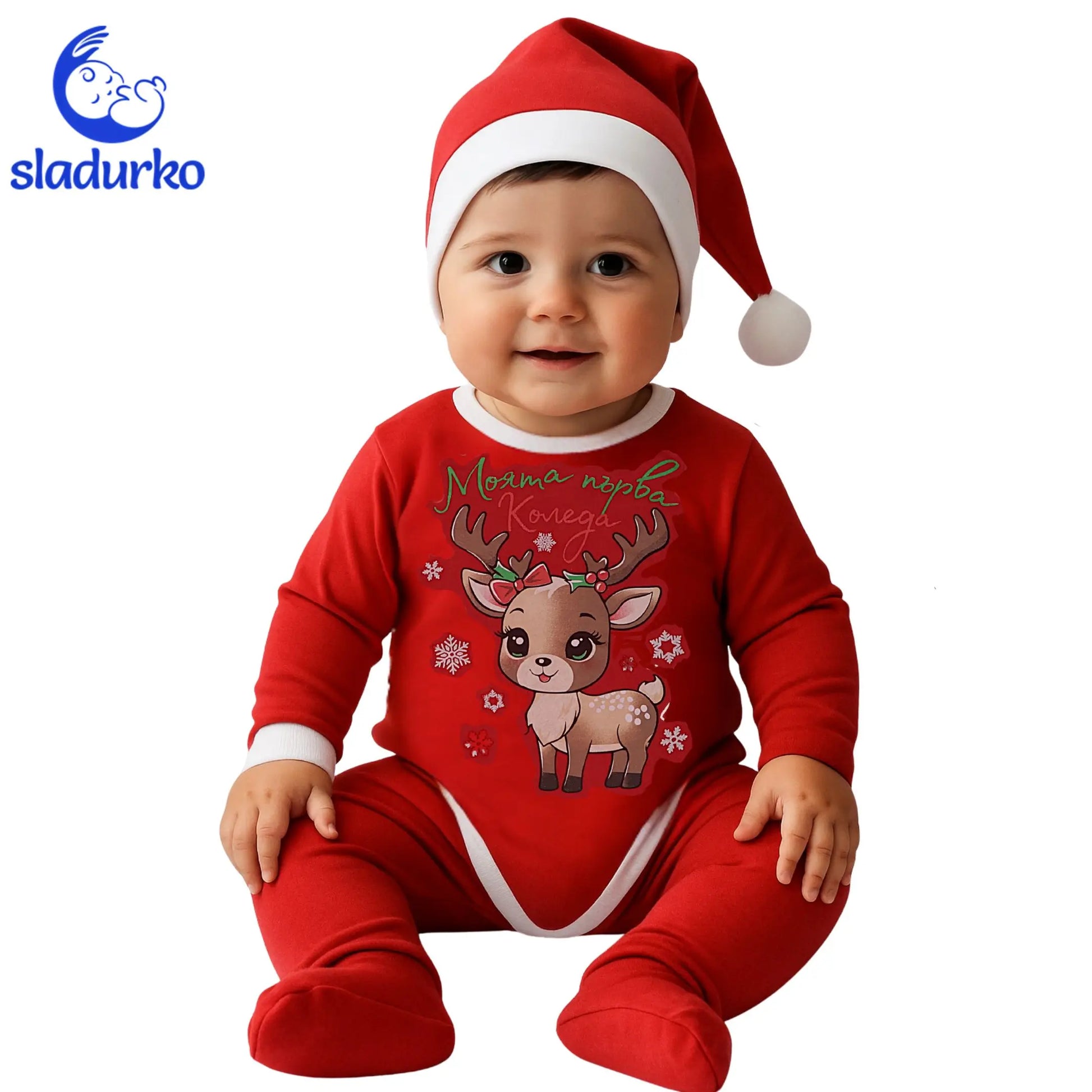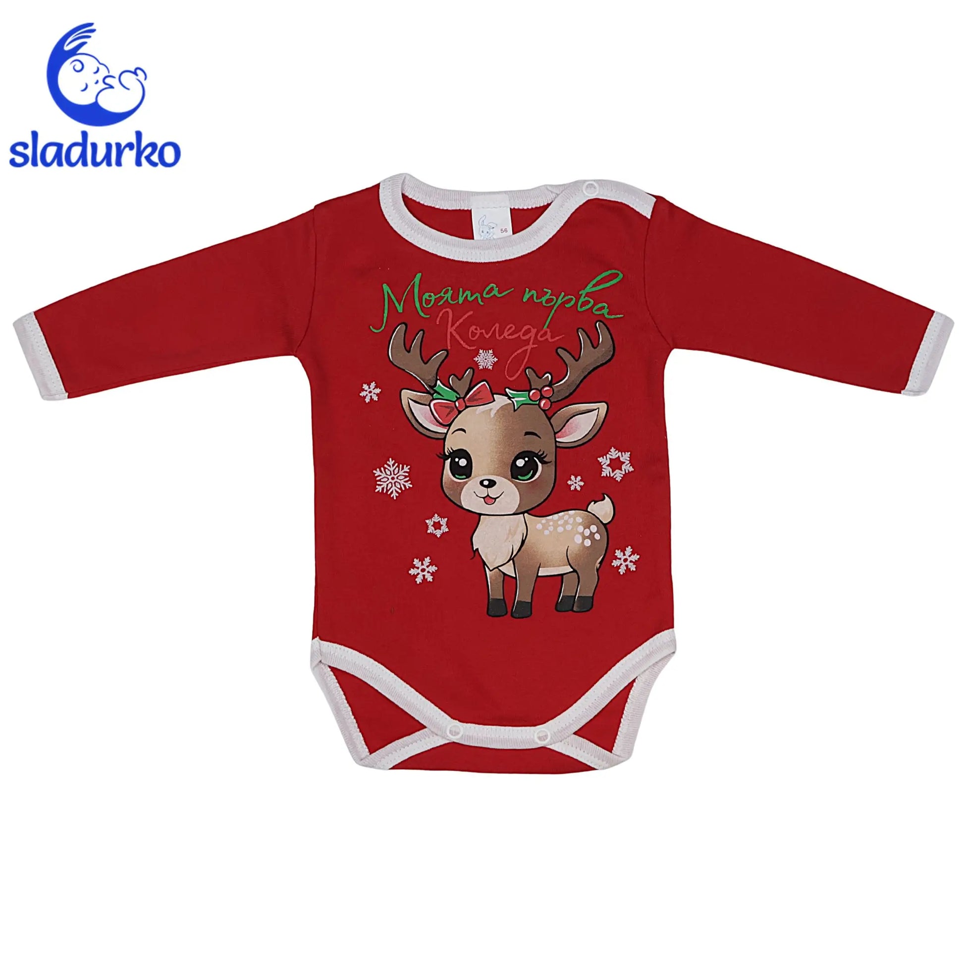 Боди с Послание: Бодито е украсено с принт на сладко коледно еленче с панделка и надпис "Моята Първа Коледа". Снежинките добавят фин зимен акцент.