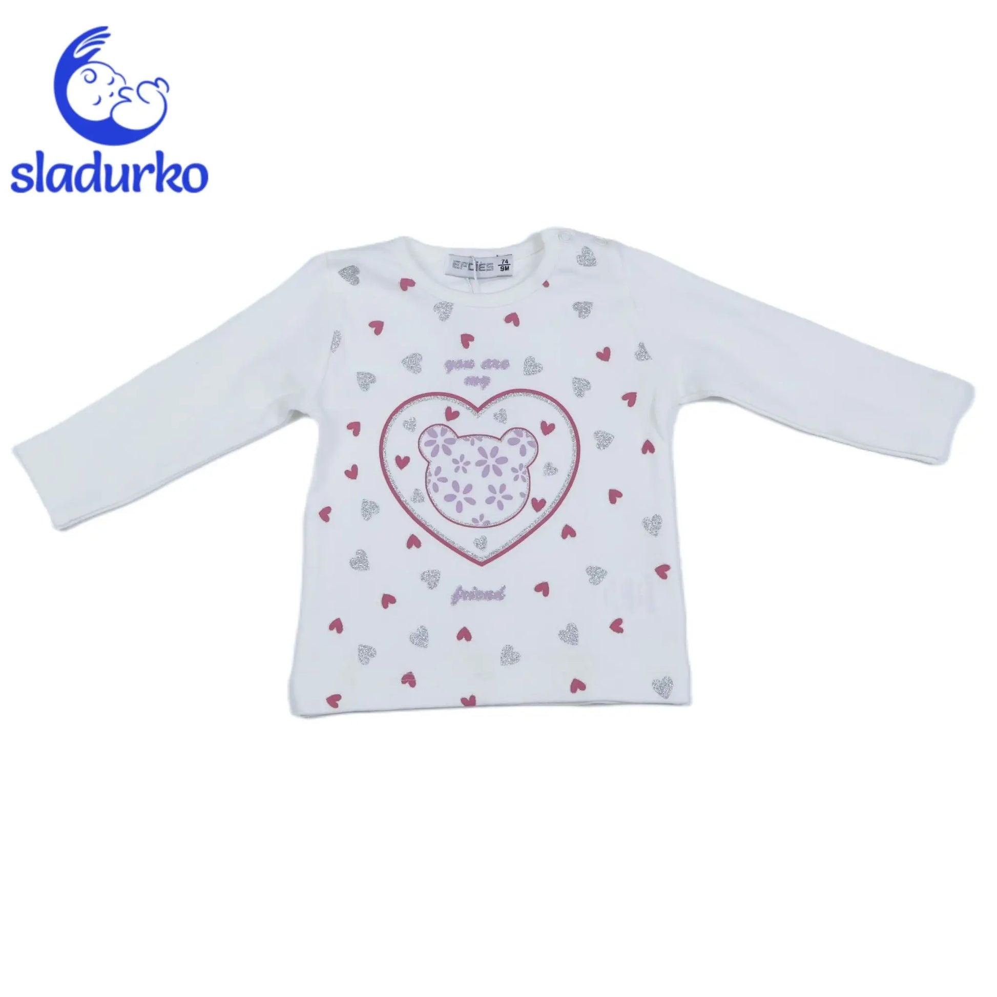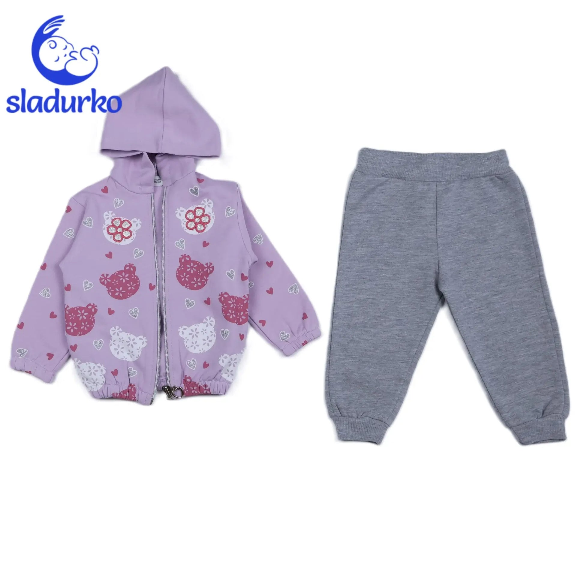 Комплектът включва супер мек, леко ватиран суитчър с качулка и цип, украсен с оригинален принт на мече от цветя. Памучната блузка с апликация на сърца и цветя е нежна и удобна за кожата, а светло сивите памучни панталончета осигуряват свобода на движение. Комплектът е изработен от висококачествени материали, които гарантират дълготрайност и лесна поддръжка.