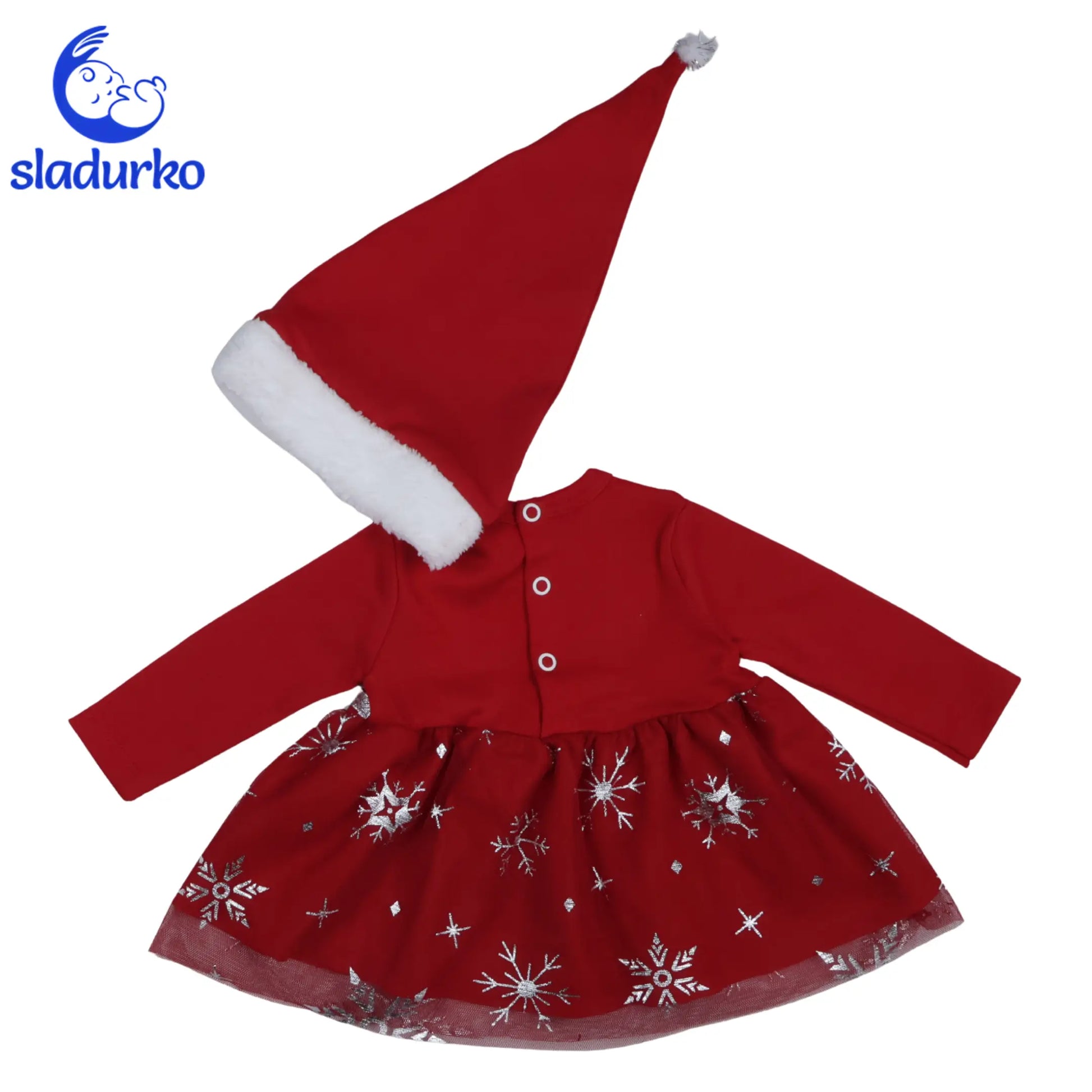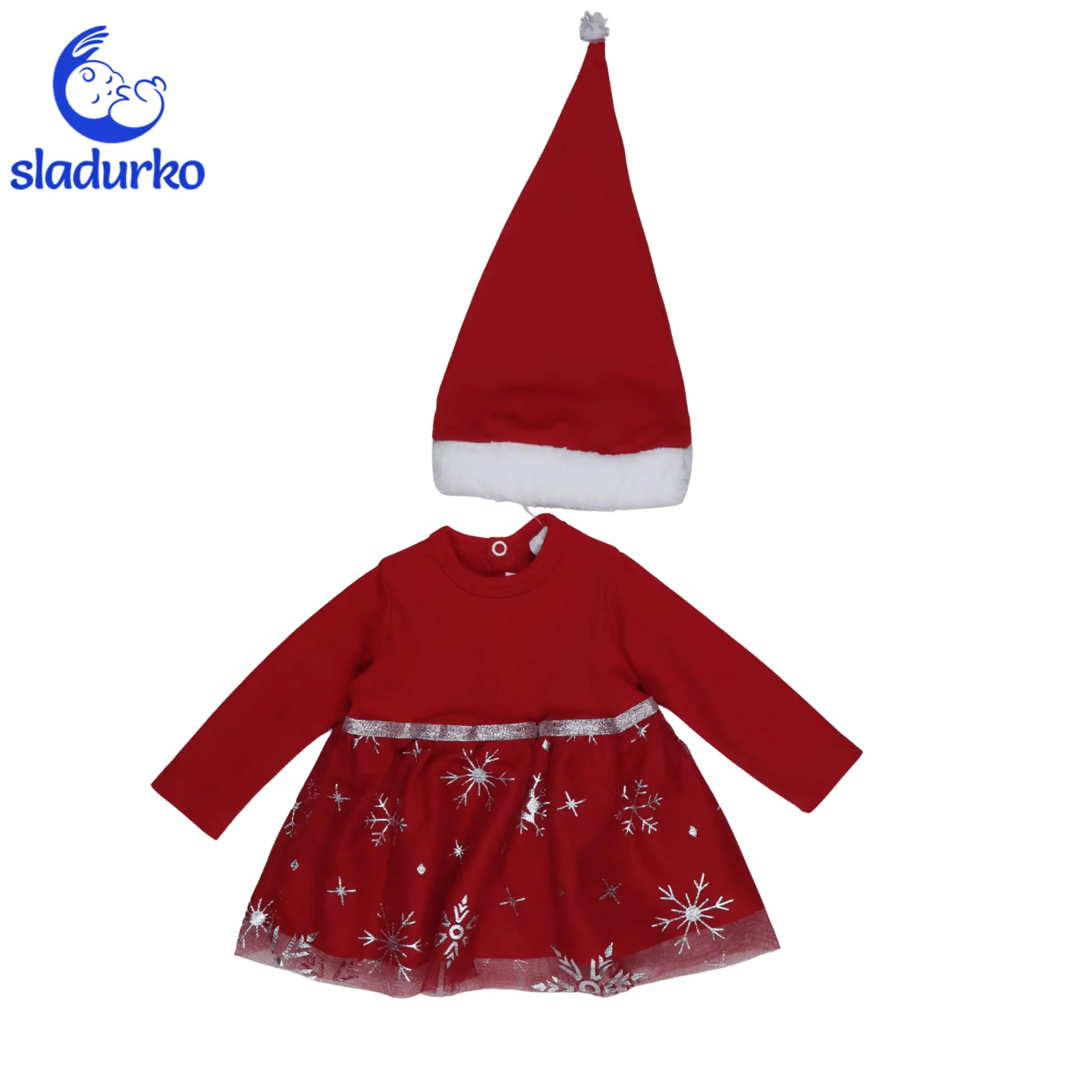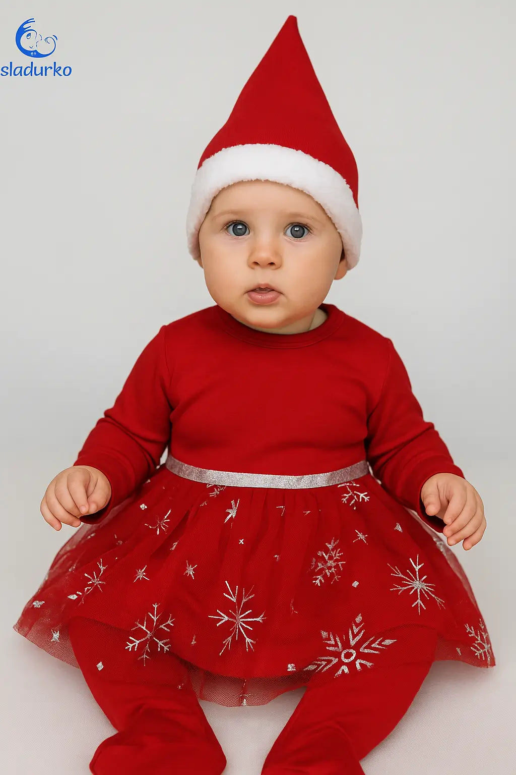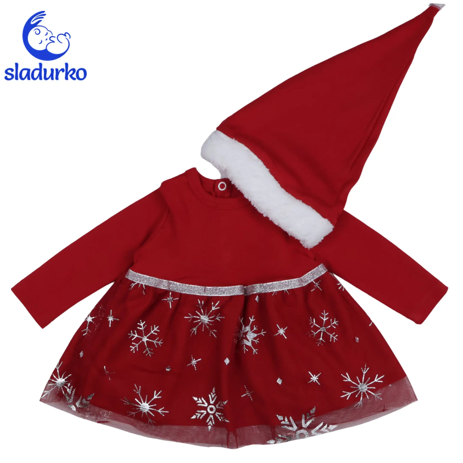 Дизайн: Горната част е от мек памук в класическо червено. Долната част е оформена като поличка с блестящ тюл, декориран със сребристи снежинки и сребрист кант на талията.