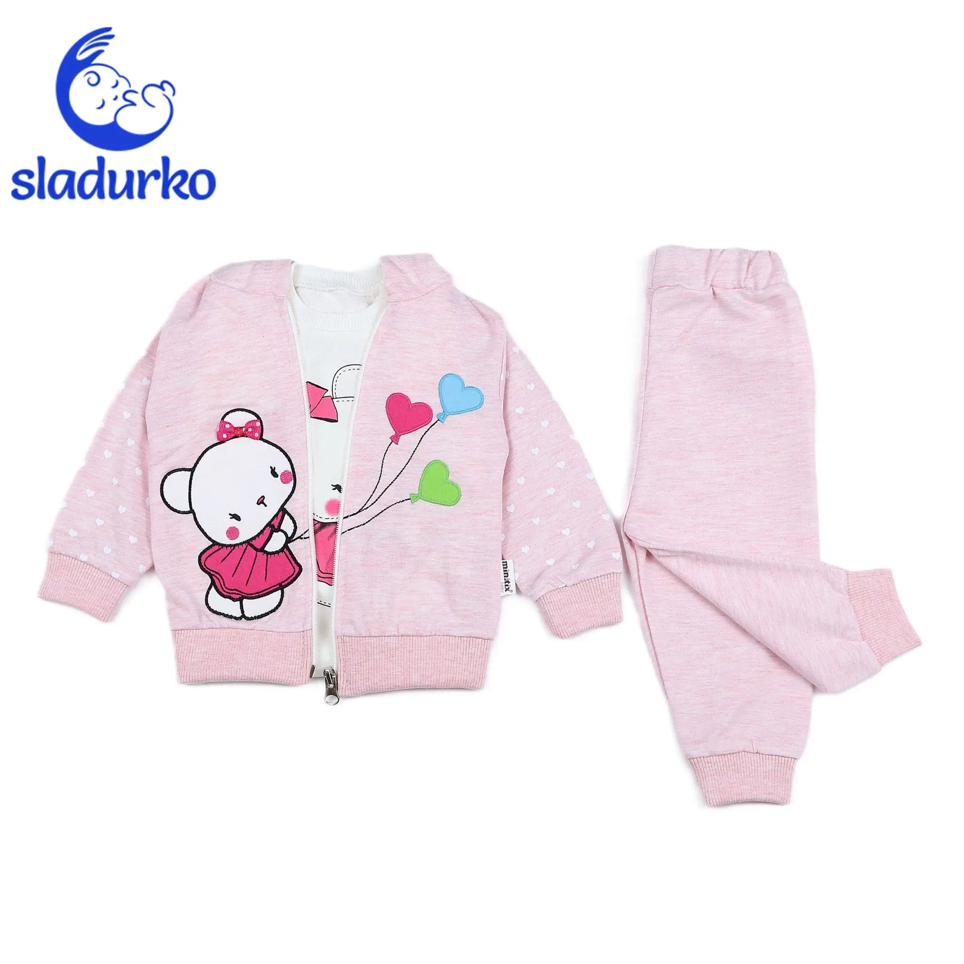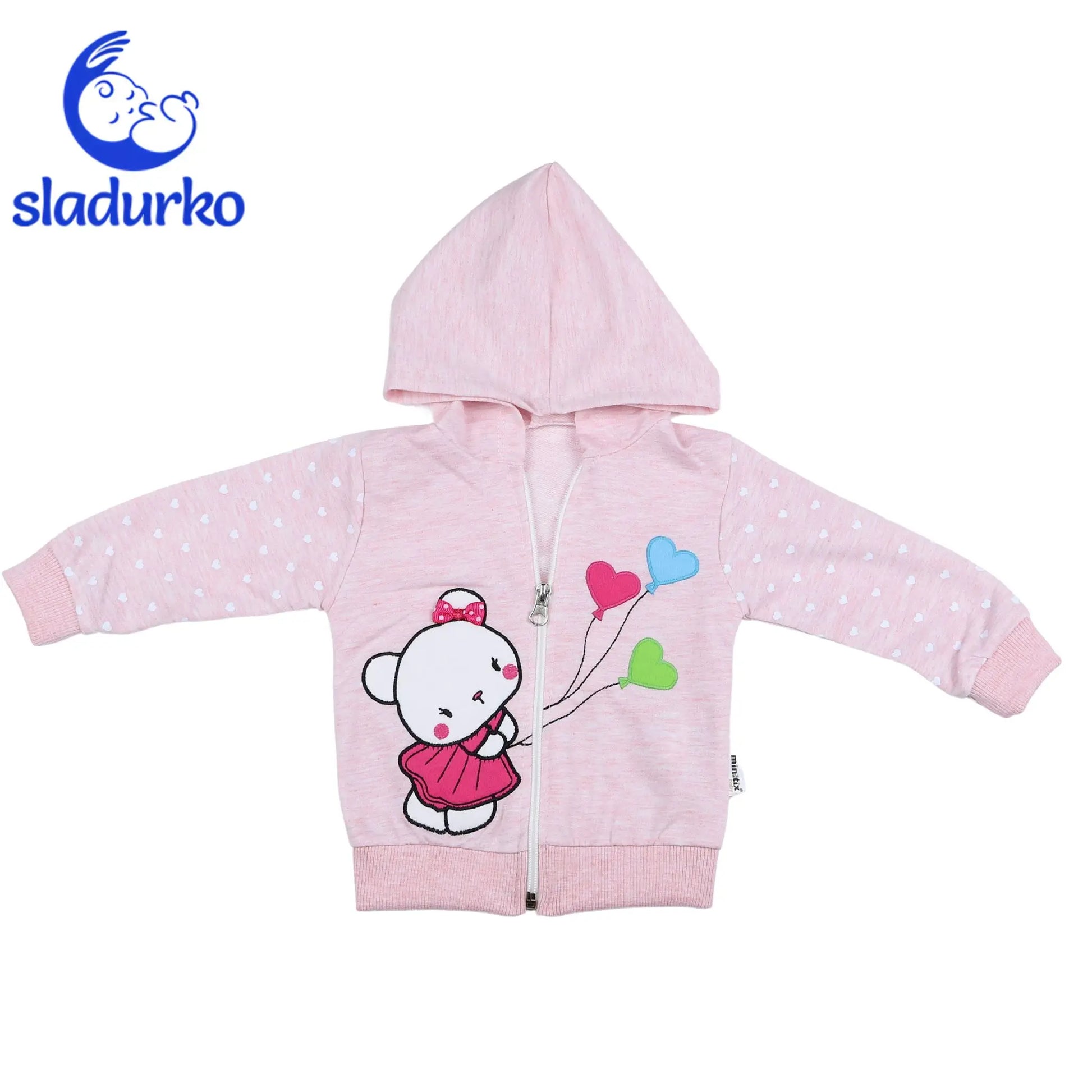 - Горна част (Суитшърт): Суитшърт с цип в нежно розов цвят, декориран с апликация на сладко мече с цветни балони. Ръкавите са украсени с малки бели сърчица, които добавят допълнителен чар. Еластичните маншети и талията осигуряват удобство и топлина.