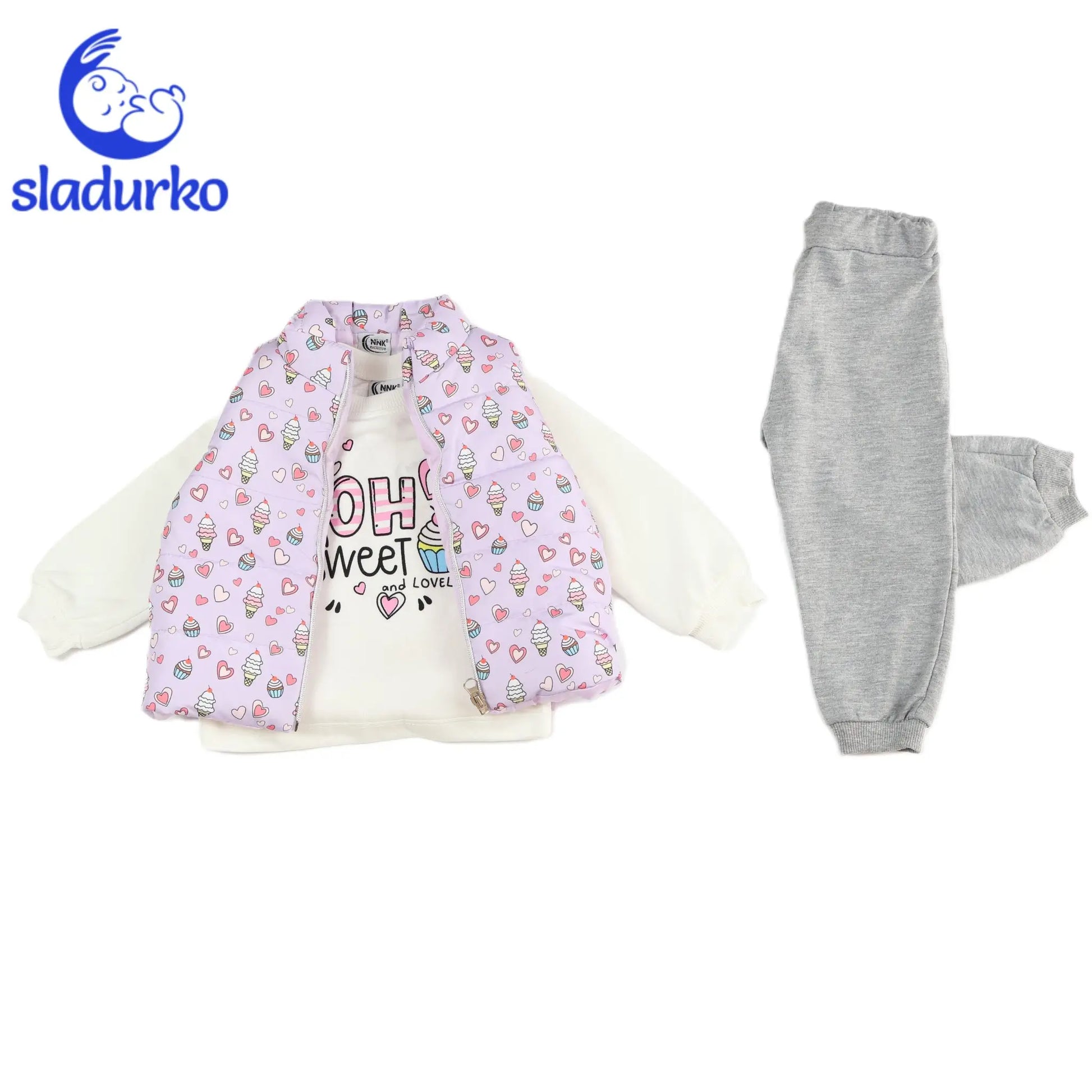 Този стилен и практичен комплект, състоящ се от шушляково елече, блузка и панталонки, е идеален за активни деца, които обичат да се движат и играят на открито. Съчетание от удобство и защита от вятър и студ, този комплект е подходящ за прохладните дни. Лекото, но топло шушляково елече предпазва детето от вятър и студ. С цип отпред за лесно обличане и събличане, то е идеално за разходки на открито. Блузката е с мека и дишаща материя, която осигурява комфорт през целия ден. Тя е идеалното допълнение към елечето, като предоставя топлина и стил, подходящ за всякакви активности. Удобните панталонки със свободна кройка са изработени от мека материя, осигуряваща пълна свобода на движение. С еластичен колан, те гарантират удобство и лесно обличане. Комплектът е изработен от 100% памук. Подходящ за всякакви ежедневни дейности – игри на открито, разходки или семейни срещи, този комплект ще държи детето ви топло и стилно през целия ден.