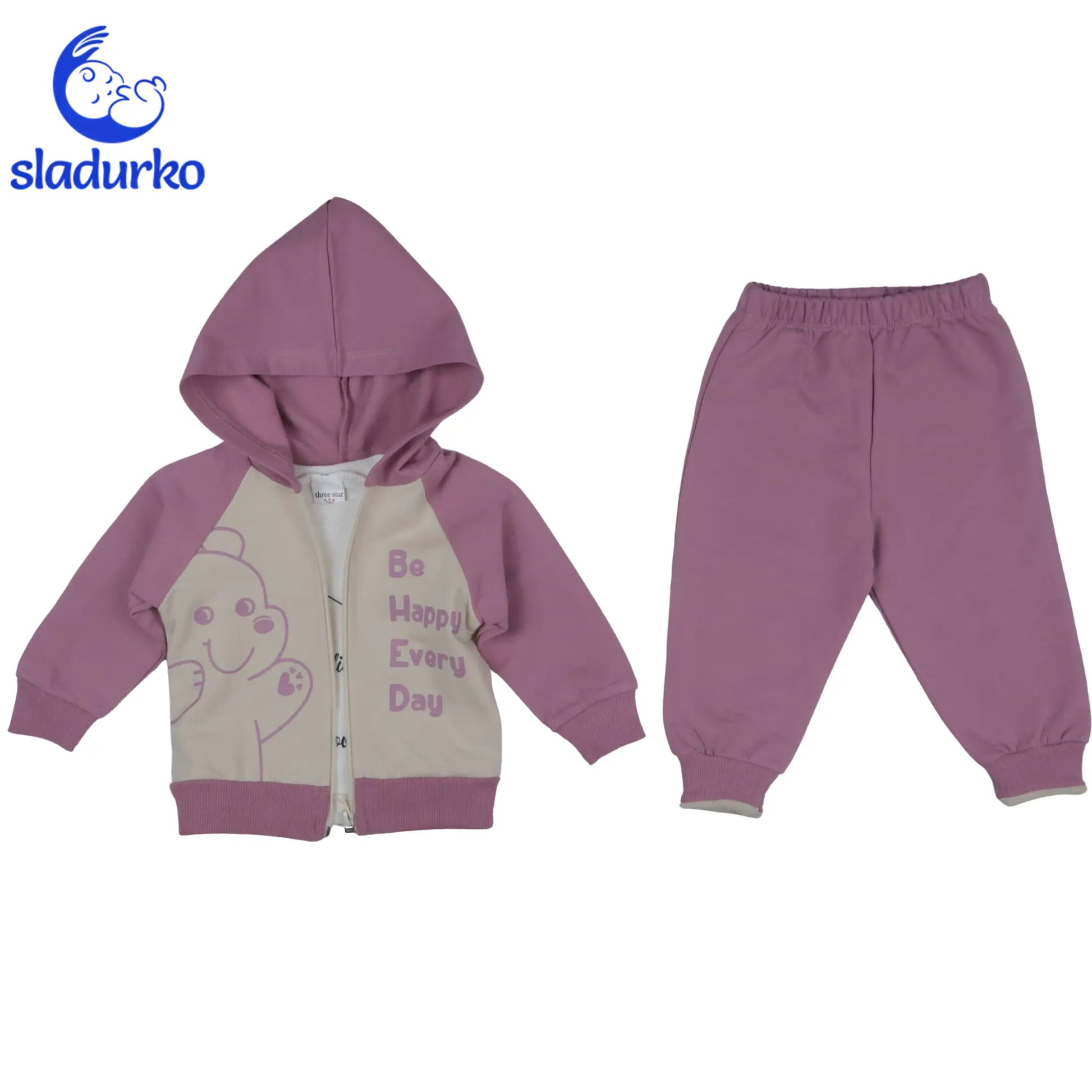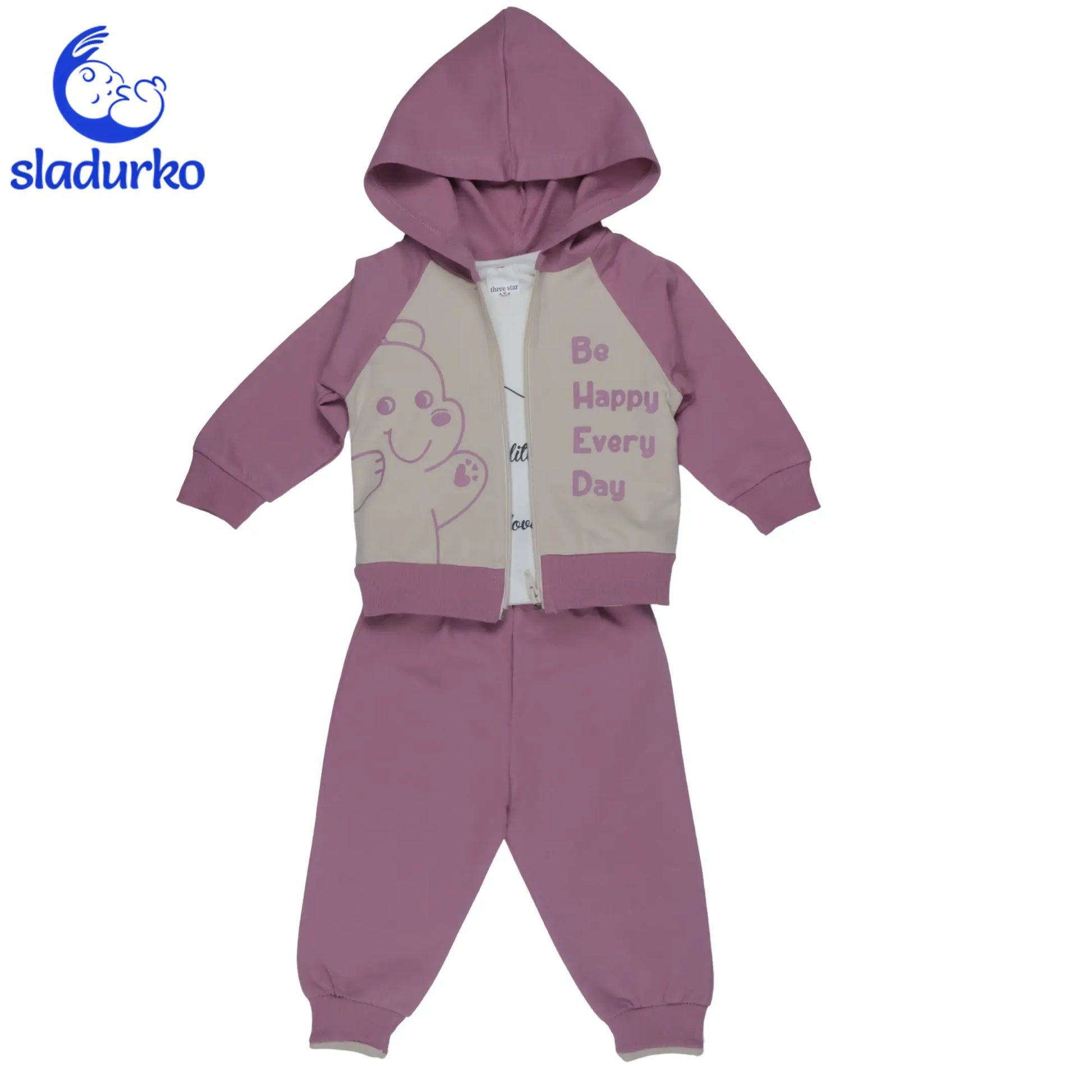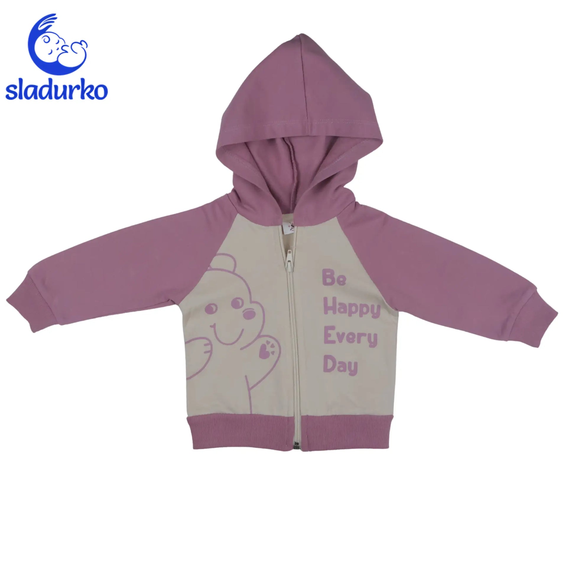 Суитшърт с цип и качулка, с весел надпис “Be Happy Every Day“ и усмихнато мече