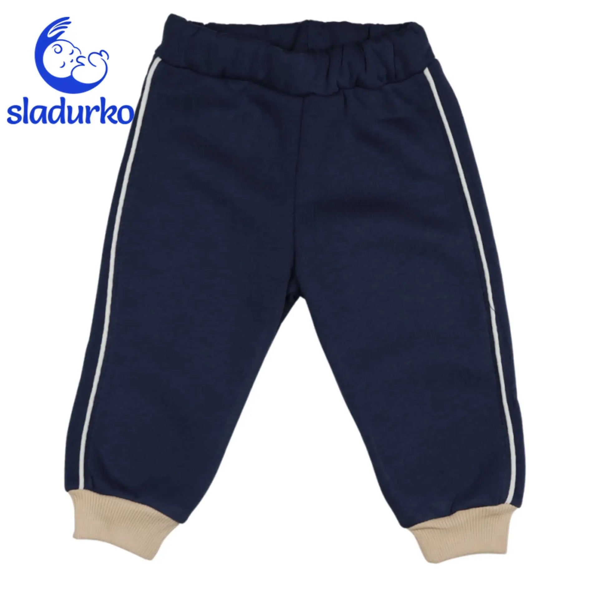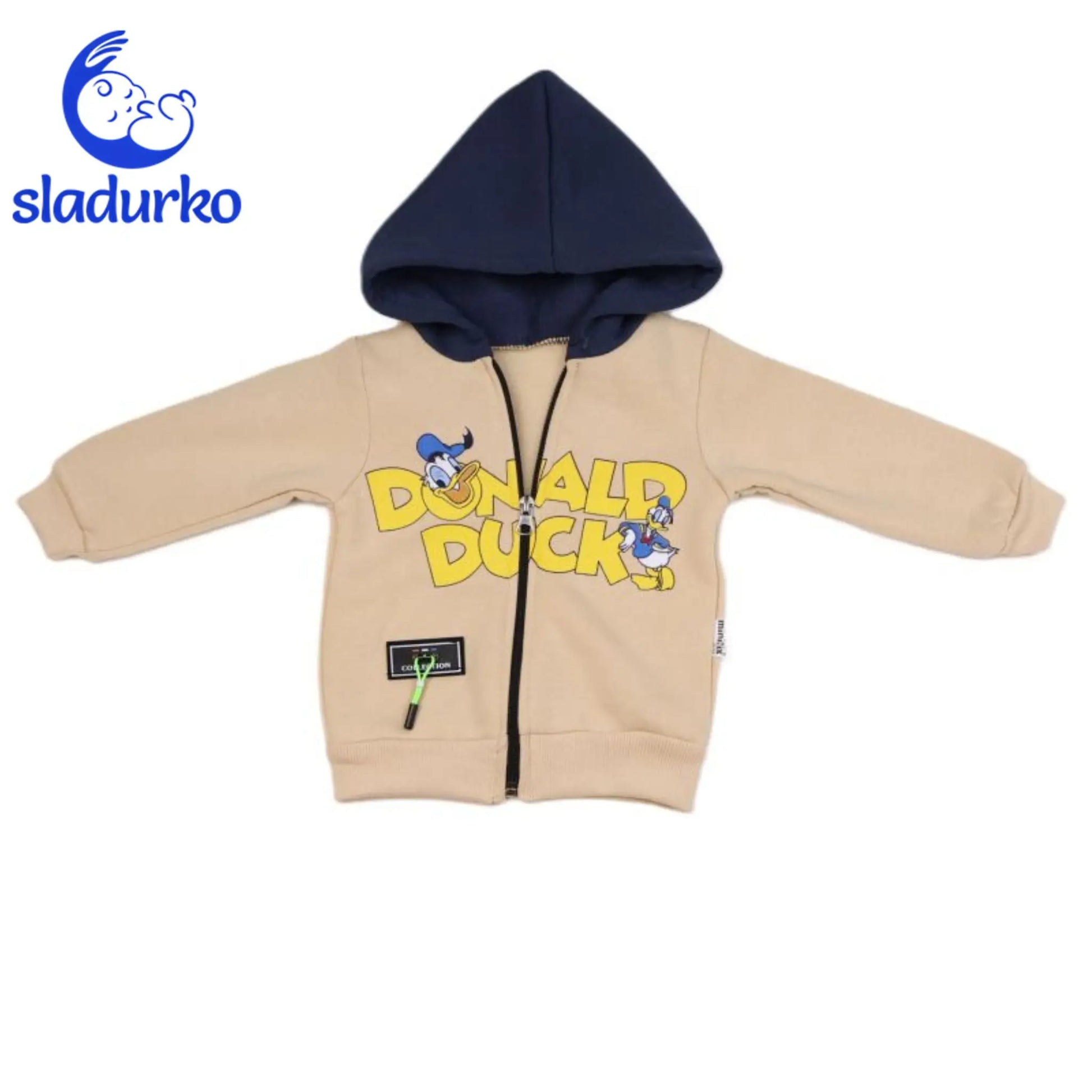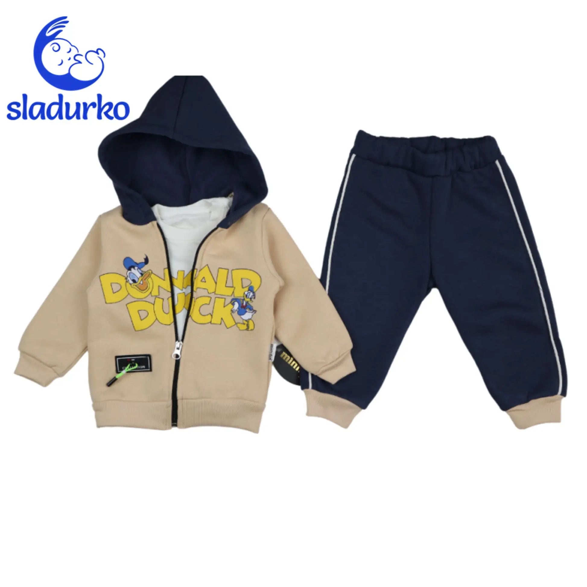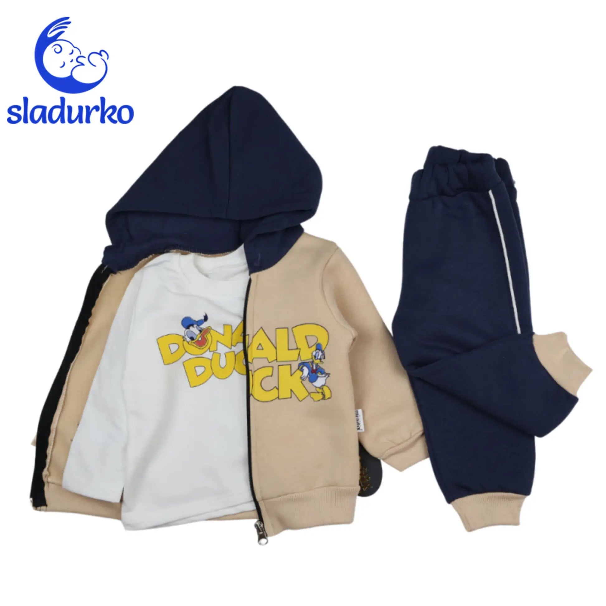 Ватиран комплект за момче от 3 части. Блузка, панталонки и суитчер с качулка и закопчаване с цип. 70% памук 30% полиестер.
