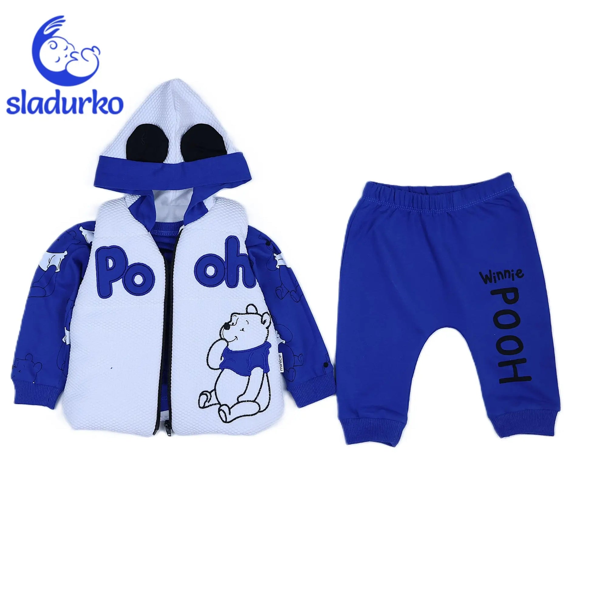 Детски комплект от 3 части с елек, идеален за есенно-зимния сезон. Съдържа стилна комбинация от блузка, елек и панталонки с тематичен дизайн на мечета.