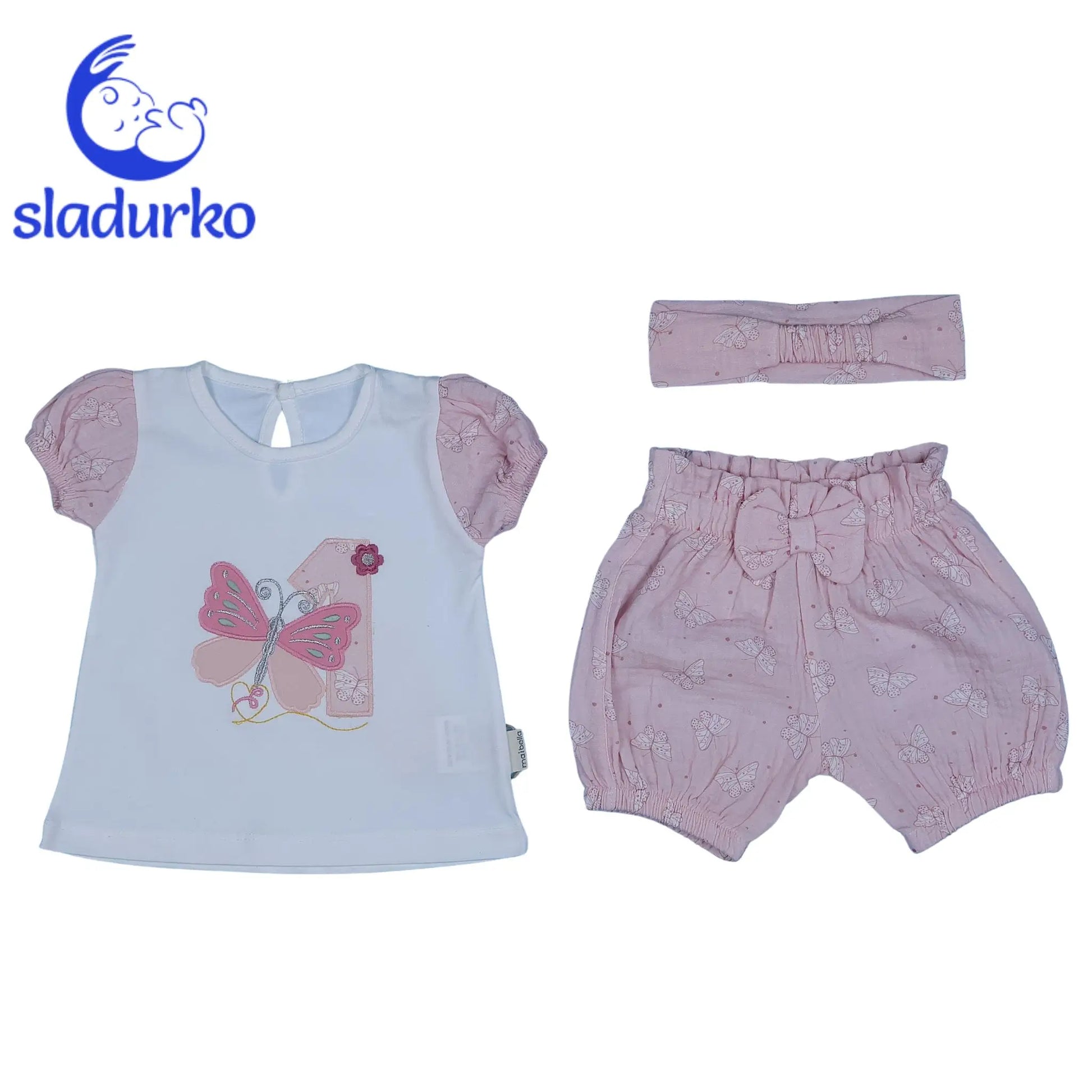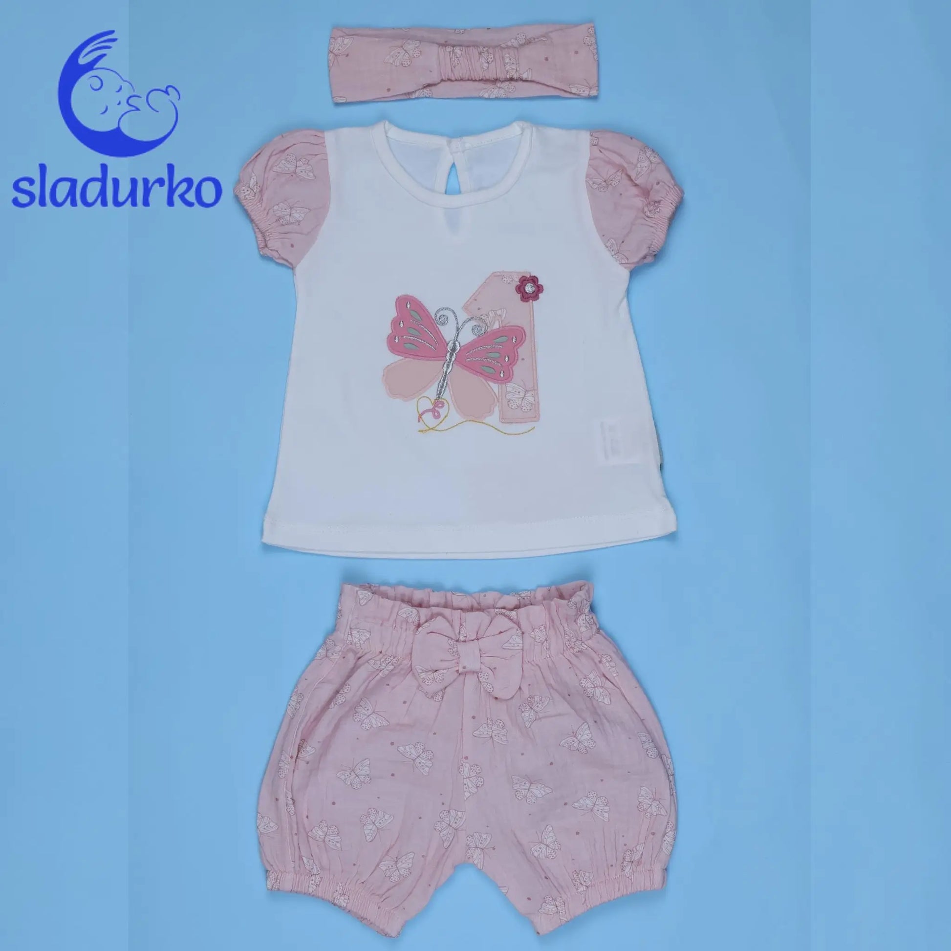 Комплекта включва блузка, къси панталони и лента за глава, които могат да се носят заедно или поотделно. Блузката е с копче на гърба, а късите панталоните са с еластична талия за максимален комфорт.