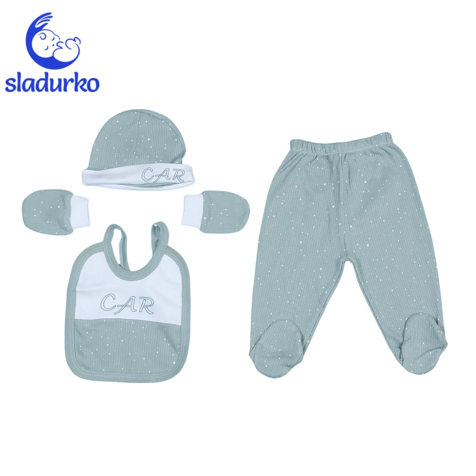 Комплект за новородено състои се от 4 части - Ританки, Лигавник, Шапка и Ръкавички. Всички части на комплекта са изработени от висококачествени, меки и хипоалергенни материи, които са деликатни към чувствителната кожа на новороденото. Комплектът е създаден с модерен и елегантен дизайн, който подчертава сладостта на вашето бебе.