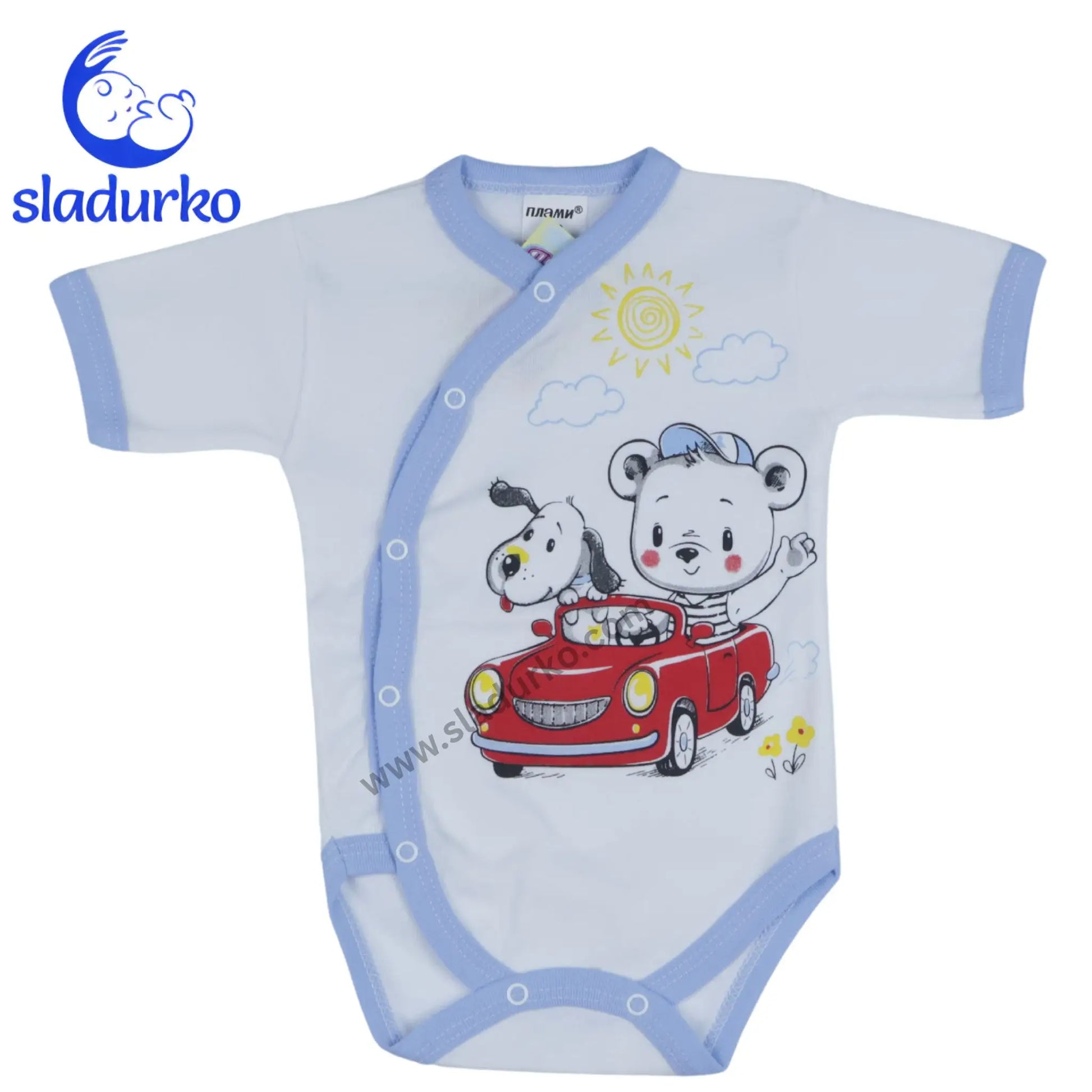 Меко и практично боди с къс ръкав, изработено от 100 % висококачествен памук, което обгръща нежно тялото на бебето. Диагоналното странично закопчаване с удобни тик-так копчета улеснява обличането и смяната на пелени, без да напряга детето. Яркият принт с меченце и кученце, които шофират червена кола под слънчеви лъчи, внася весело настроение във всеки ден.