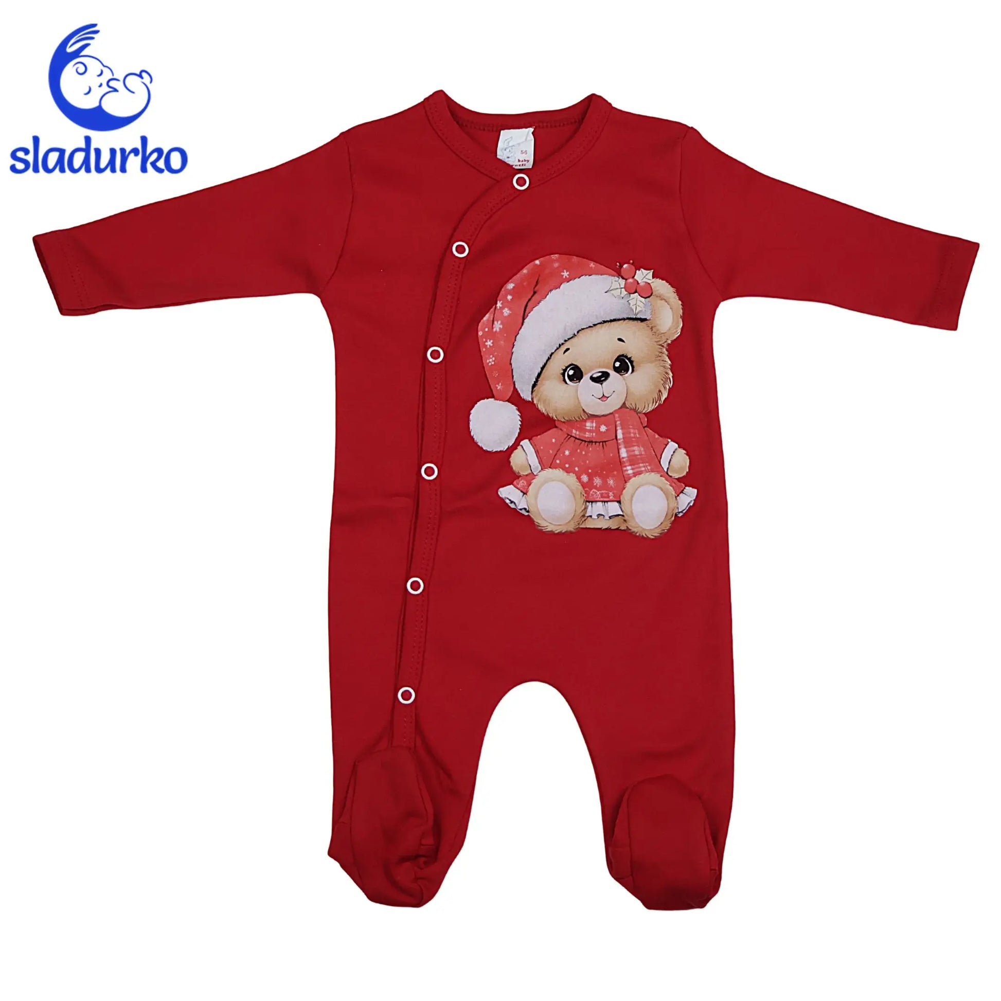 Празничен Дизайн: Гащеризонът е в наситен коледен червен цвят и е украсен с очарователна щампа на сладко мече с коледна шапка и шал. Идеалният тоалет за празнични снимки и подарък.