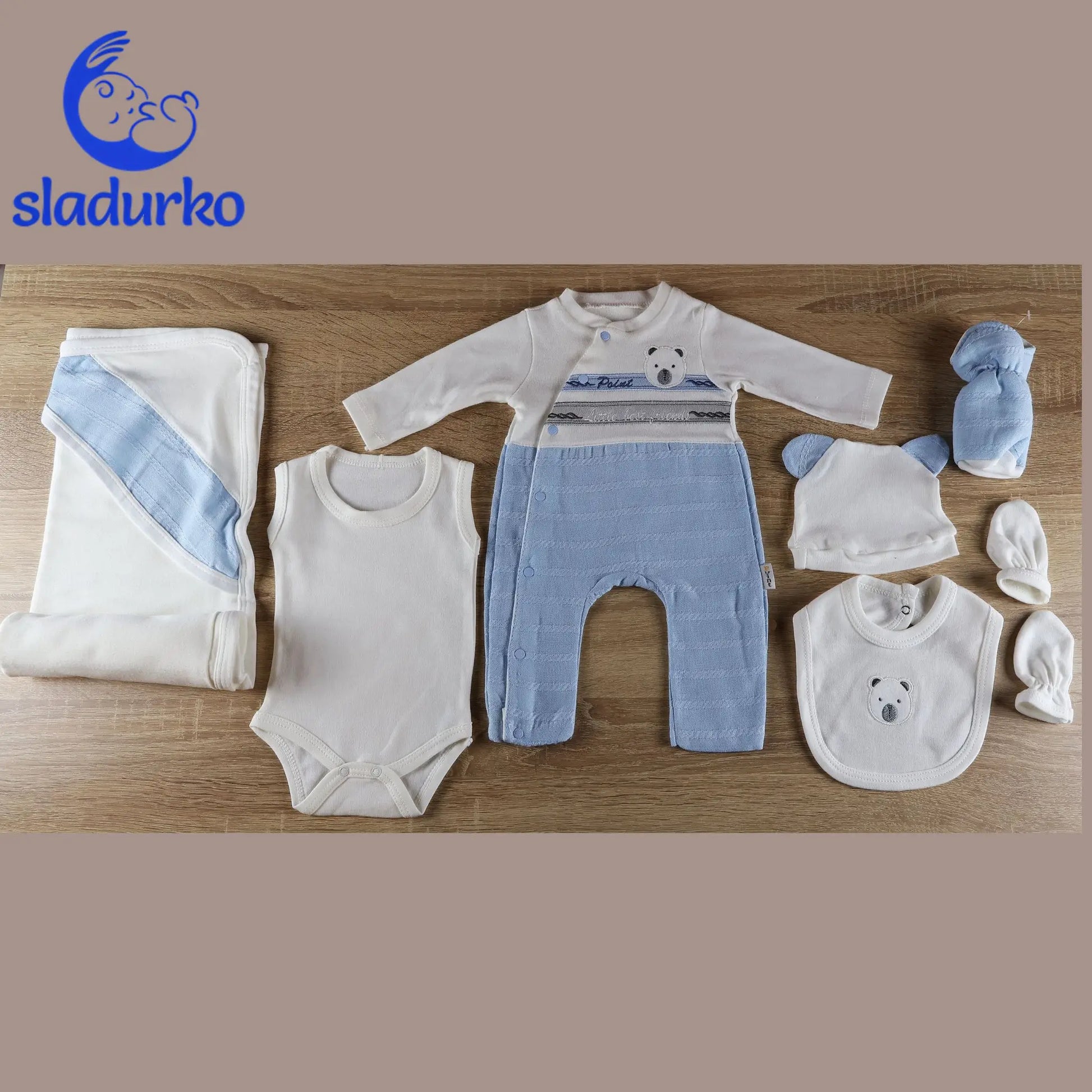 Комплекта е изработен от висококачествен памук. Подходящ за новородени с универсален размер, който осигурява комфорт и свобода на движенията. този комплект предлага всичко необходимо за да облечете вашето бебе при първото му появяване у дома. Комплекта съдържа бебешки ромпър със старанично закопчаване с тик так копчета, боди, лигавник и шапчица, ръкавички, пелена и кесийка.