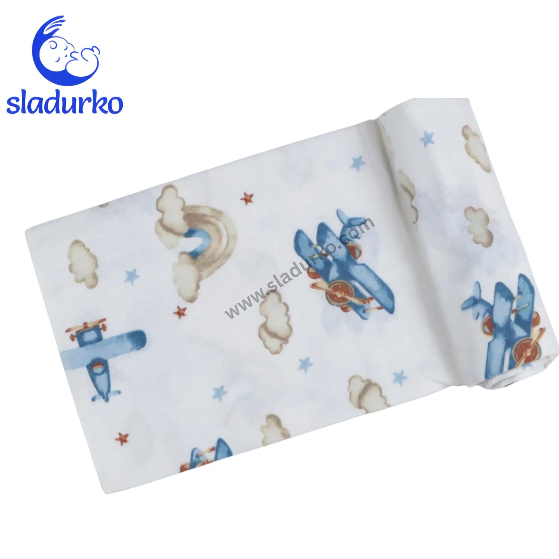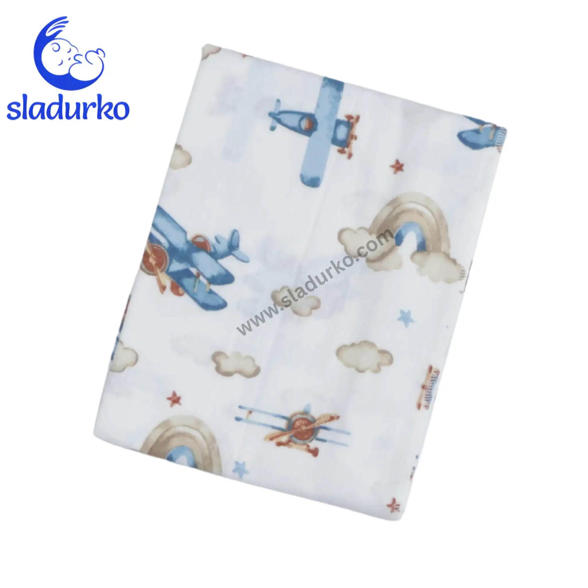 Дизайн: принт „самолети и дъги“ в пастелни нюанси, бяла основа