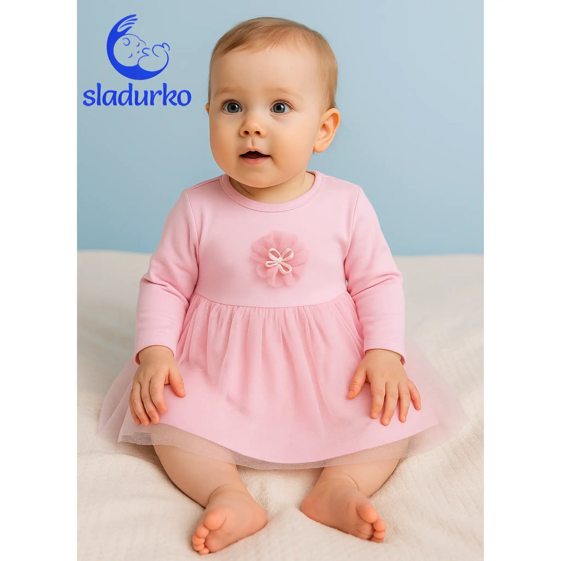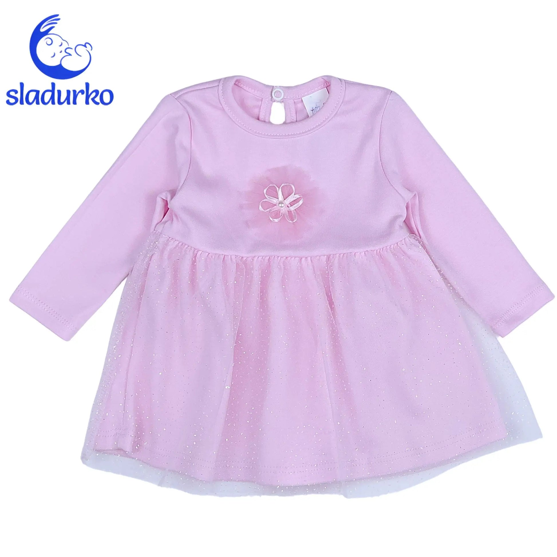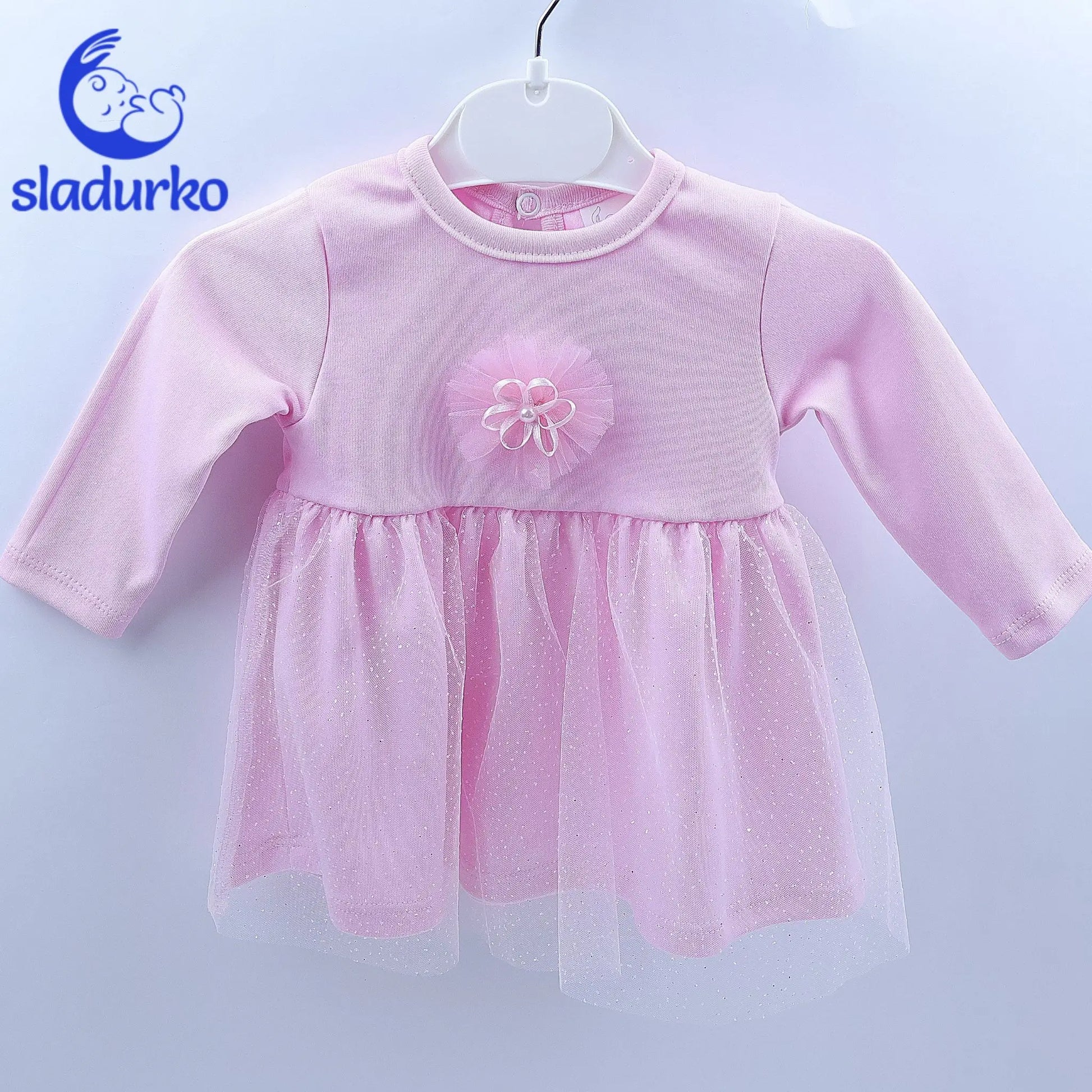 Удобна материя: Меката и дишаща материя осигурява комфорт през целия ден. Подходяща за различни поводи: Роклята е идеална за рождени дни, кръщенета, празници и други специални събития. Лесна за обличане: Удобният дизайн позволява лесно обличане и събличане. Налична в размери от 68 до 80: Подходяща за бебета на възраст от 3 до 12 месеца. Материал: Памук и полиестер Цвят: Розов Детайли: Тюлена пола, апликация на цвете Ръкави: Дълги Размери: 68, 74, 80