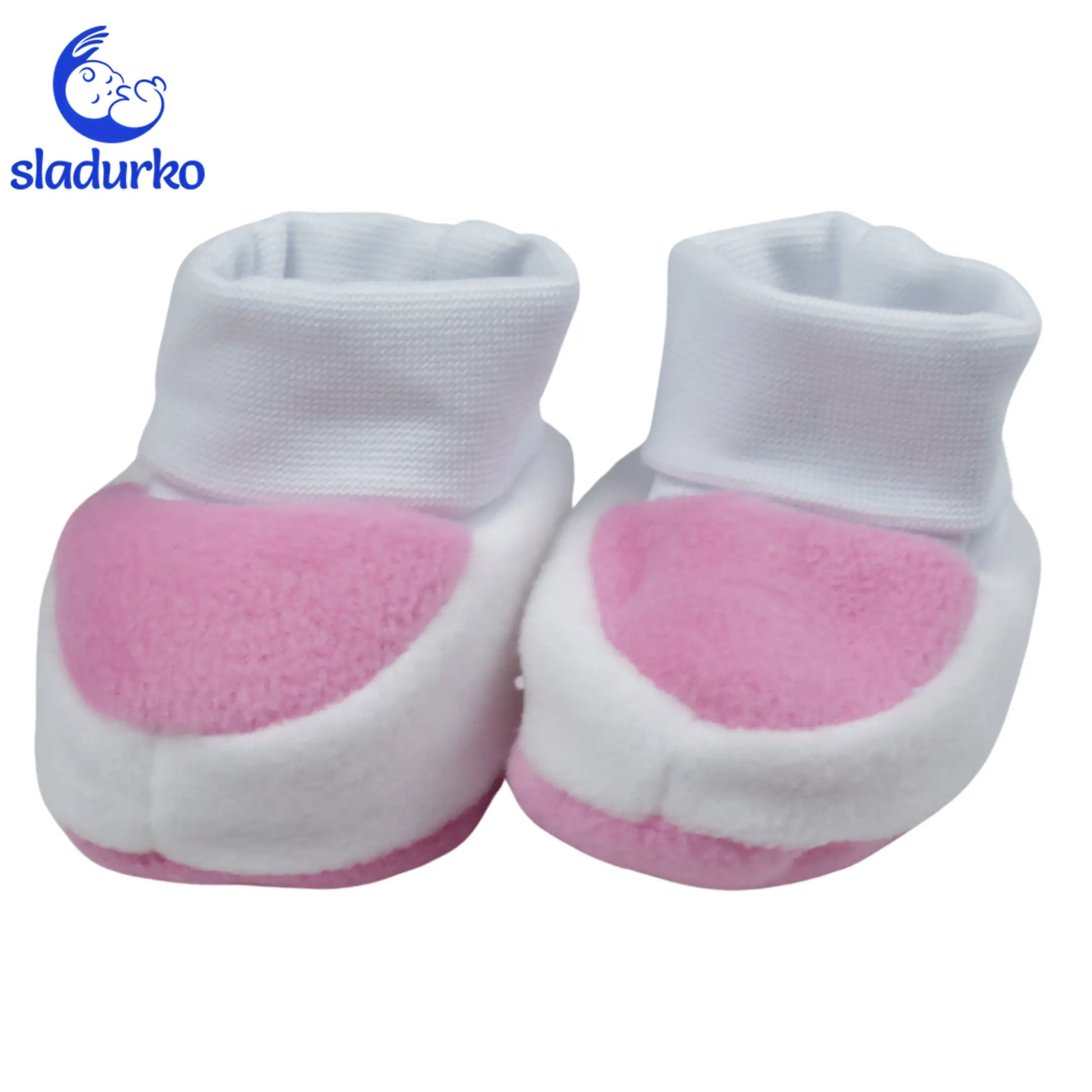 Памучни плюшени терлици с двоен ластик на глезена. 100% памук. Произведено в България. Размер 0-6 месеца. 9см. дължина на стелка.