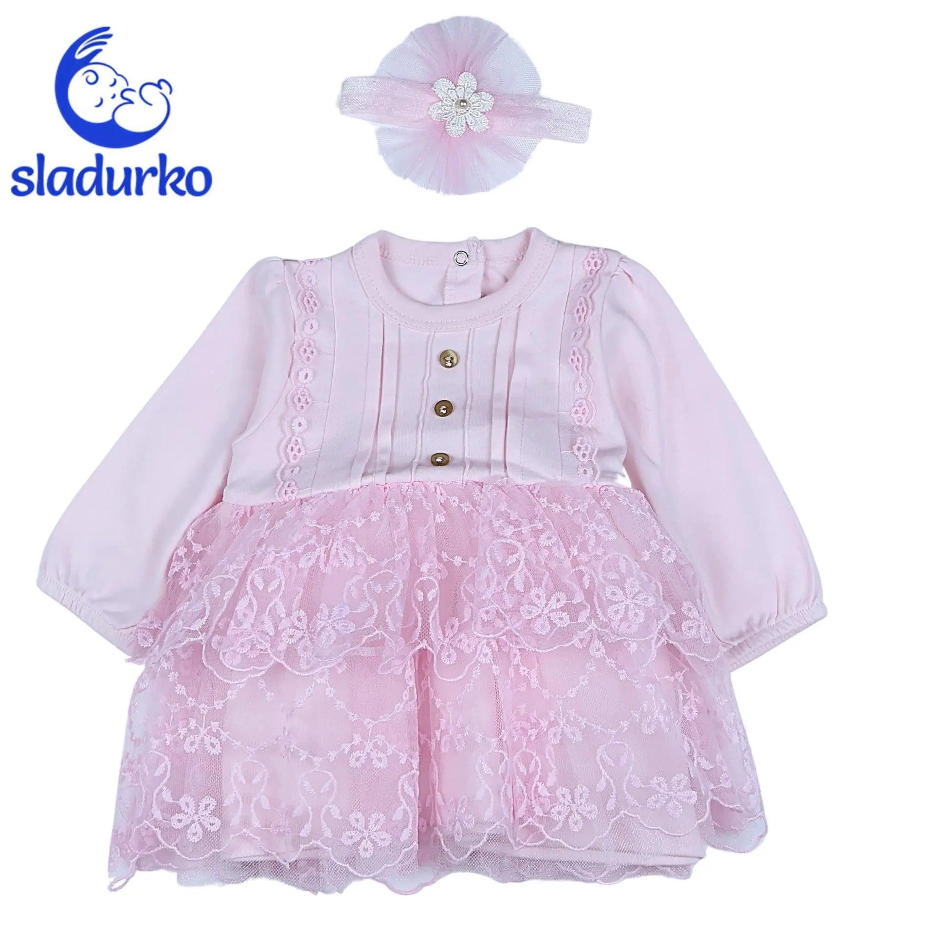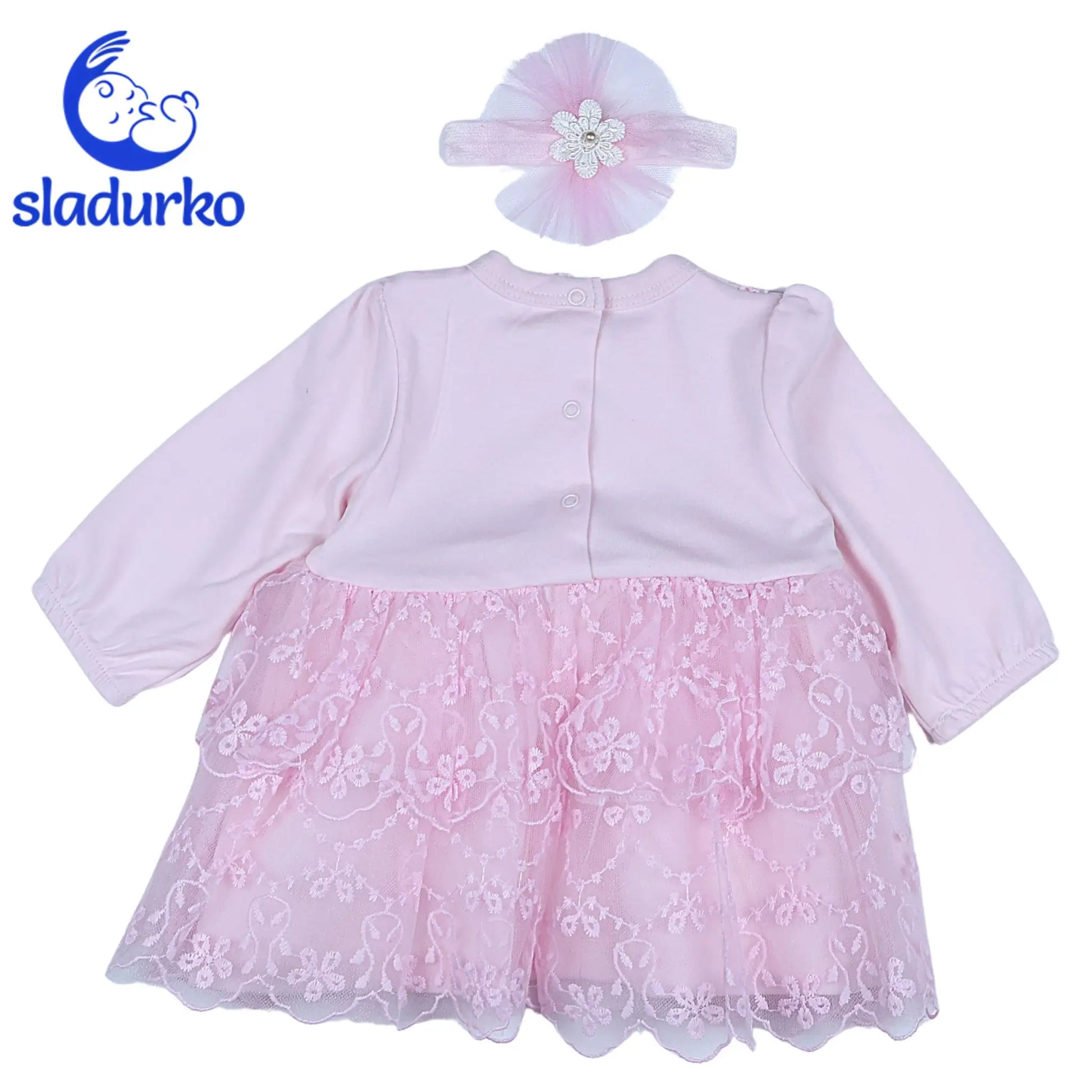 Розова рокля с лента за глава , с тюл и дантела.Роклята е от памук с тик так копчета на гърба и лек ластик на ръкавите.Производител Турция.Подходяща е за сватби ,рождени дни и официални поводи.