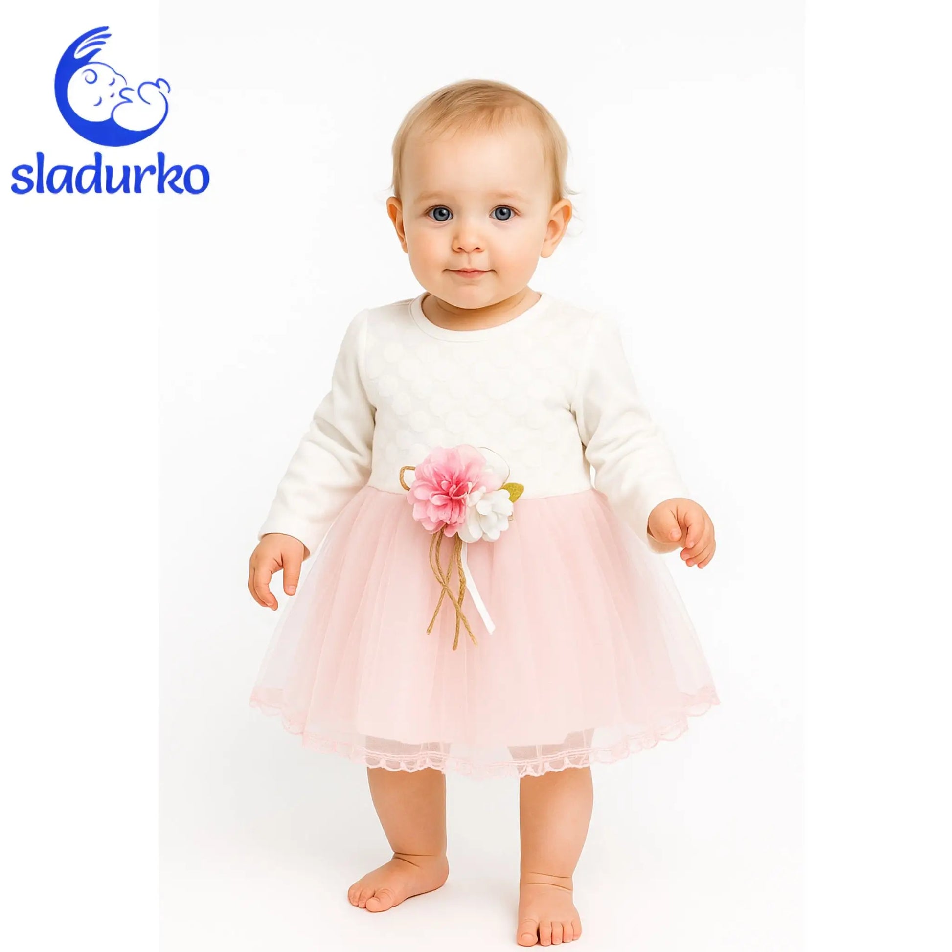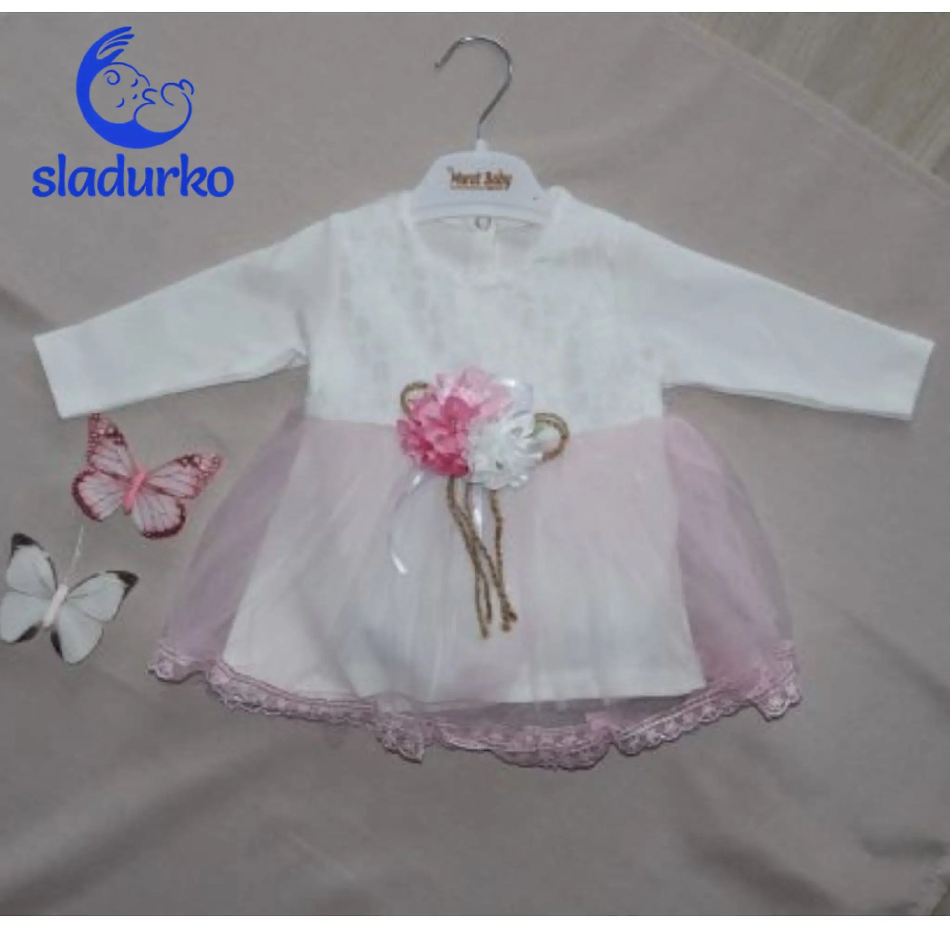 Очарователна бебешка рокля за момиченце - перфектна за специални поводи. С нежен дизайн и висококачествени материали, тя е много подходяща за рождени дни, семейни тържества или фотосесии. Изработена от мека и дишаща памучна материя, която ще осигури комфорт през целия ден на вашето дете. Кройката е елегантна с финна дантела и красива брошка-панделка на талията, която може да се сваля. Има удобно закопчаване на гърба за лесно събличане и обличане. Подарете на вашето мъниче комфорт и стил с тази очарователна бебешка рокля.