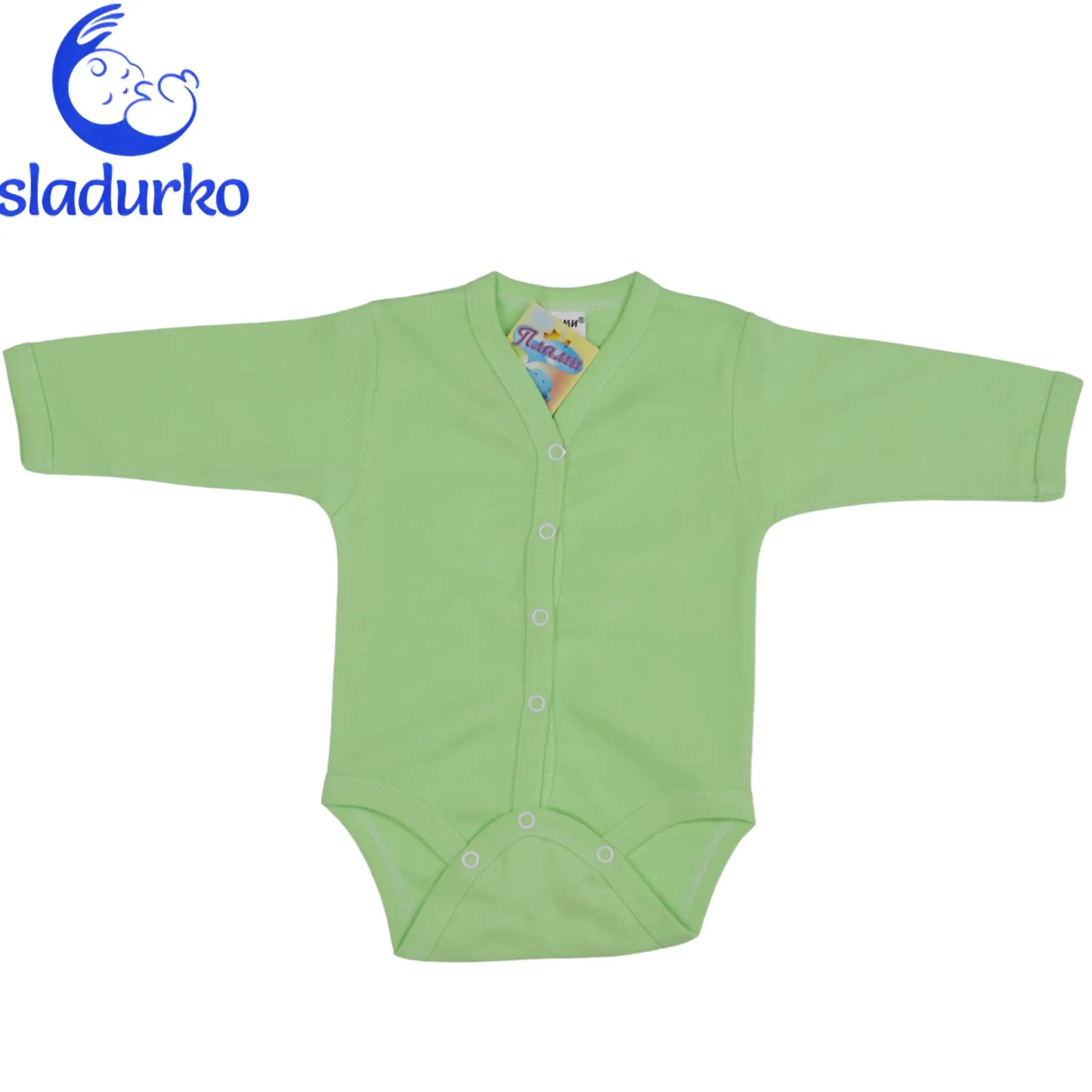 Зелено боди с дълъг ръкав и закопчаване отпред .Мека материя 100% памук.Подходящо за новородени бебета.Лесно за събличане и обличане. Инструкции за грижа: Пране в пералня на 30°C .Гладене на ниска температура .Да не се използва белина.