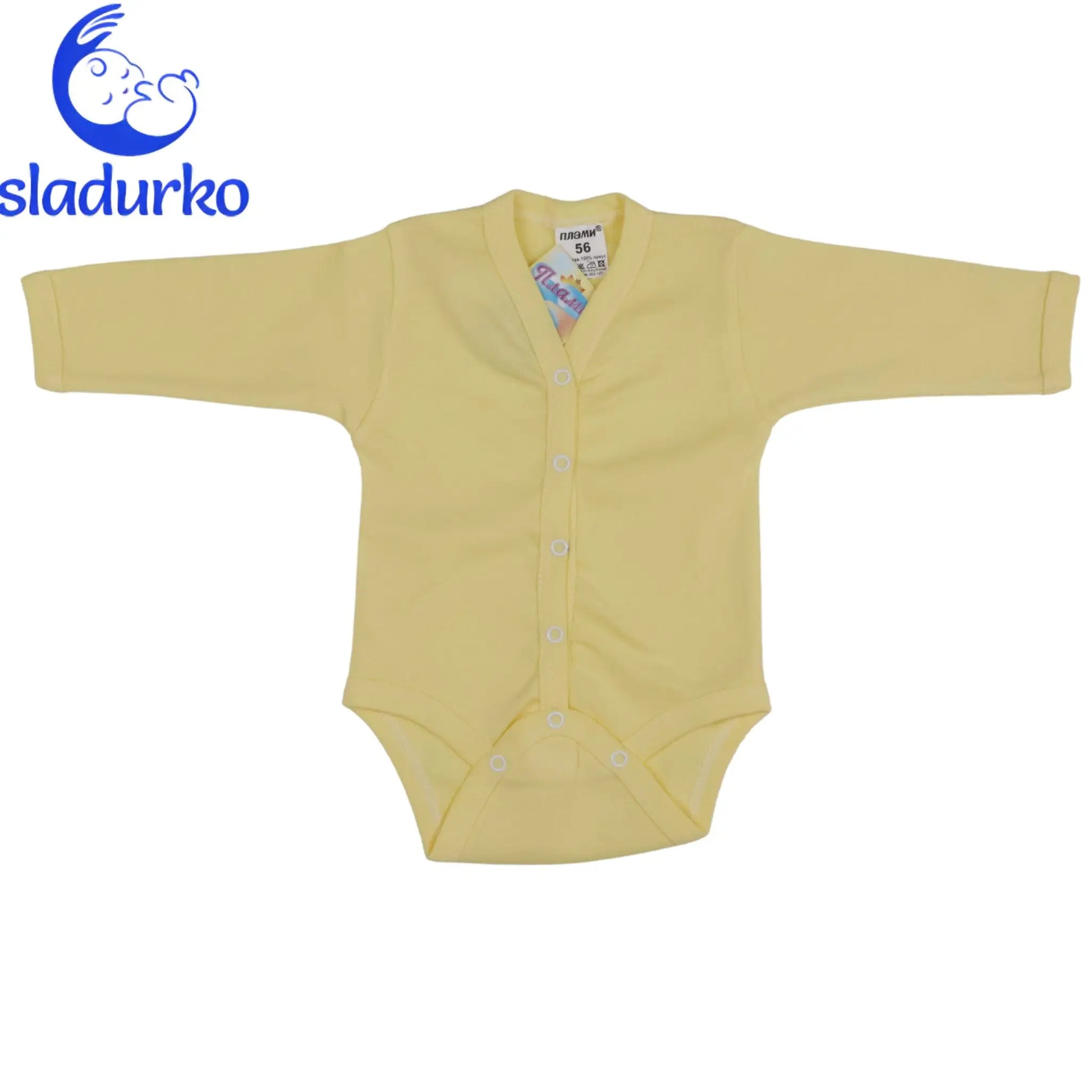 Жълто боди с дълъг ръкав и закопчаване отпред .Мека материя 100% памук.Подходящо за новородени бебета.Лесно за събличане и обличане. Инструкции за грижа: Пране в пералня на 30°C .Гладене на ниска температура .Да не се използва белина.