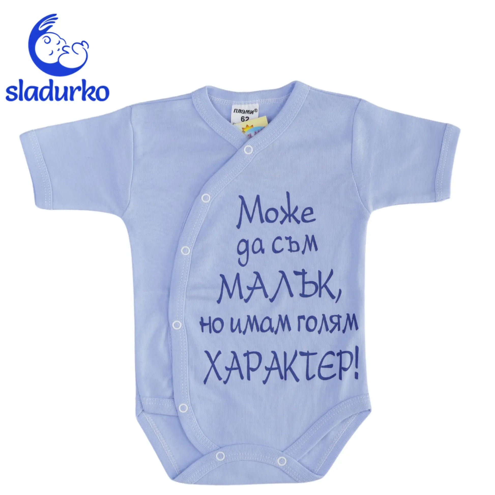Бебешко боди с къс ръкав, син цвят и надпис "Може да съм малък , но имам голям характер"