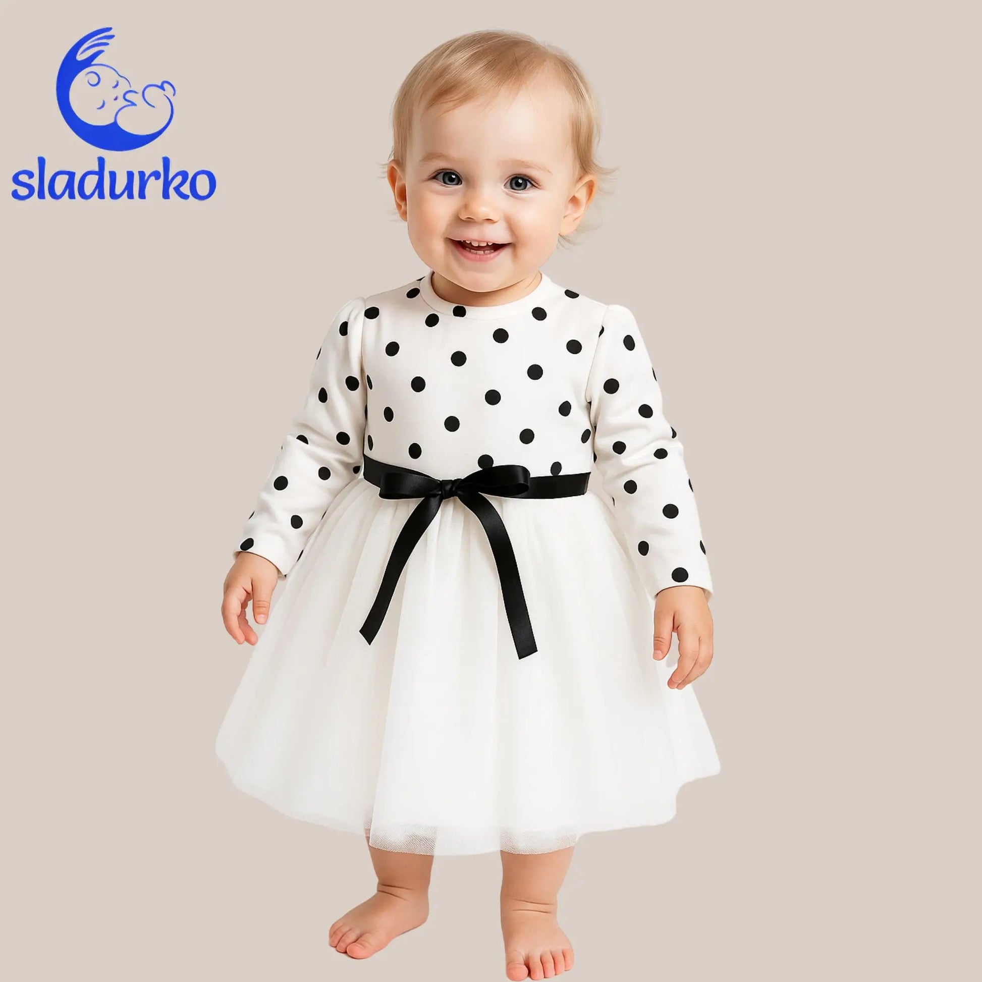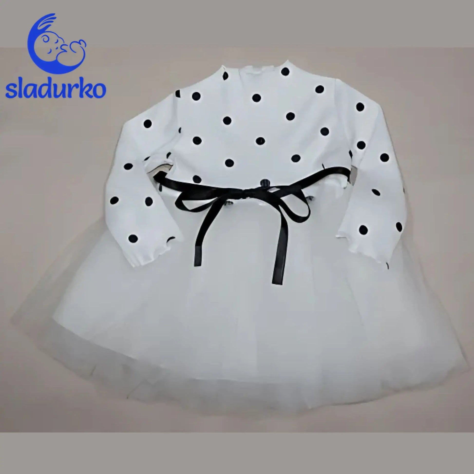 Горната част на рокличката е декорирана с класически точки, които придават игрив и стилен вид. Контрастът между точките и елегантната тюлена долна част създава уникален и модерен дизайн, подходящ за всяко малко момиченце.