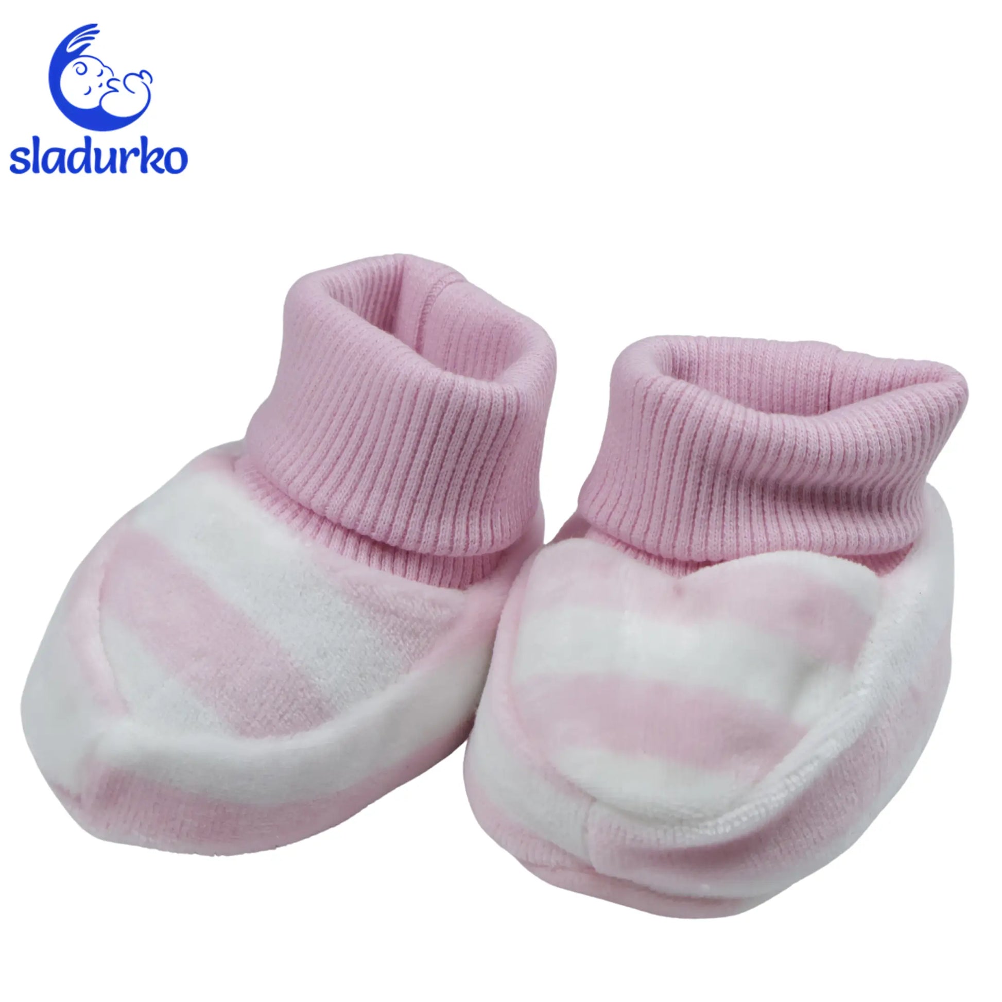 Памучни плюшени терлици с двоен ластик на глезена. 100% памук. Произведено в България. Размер 0-6 месеца. 9см. дължина на стелка.