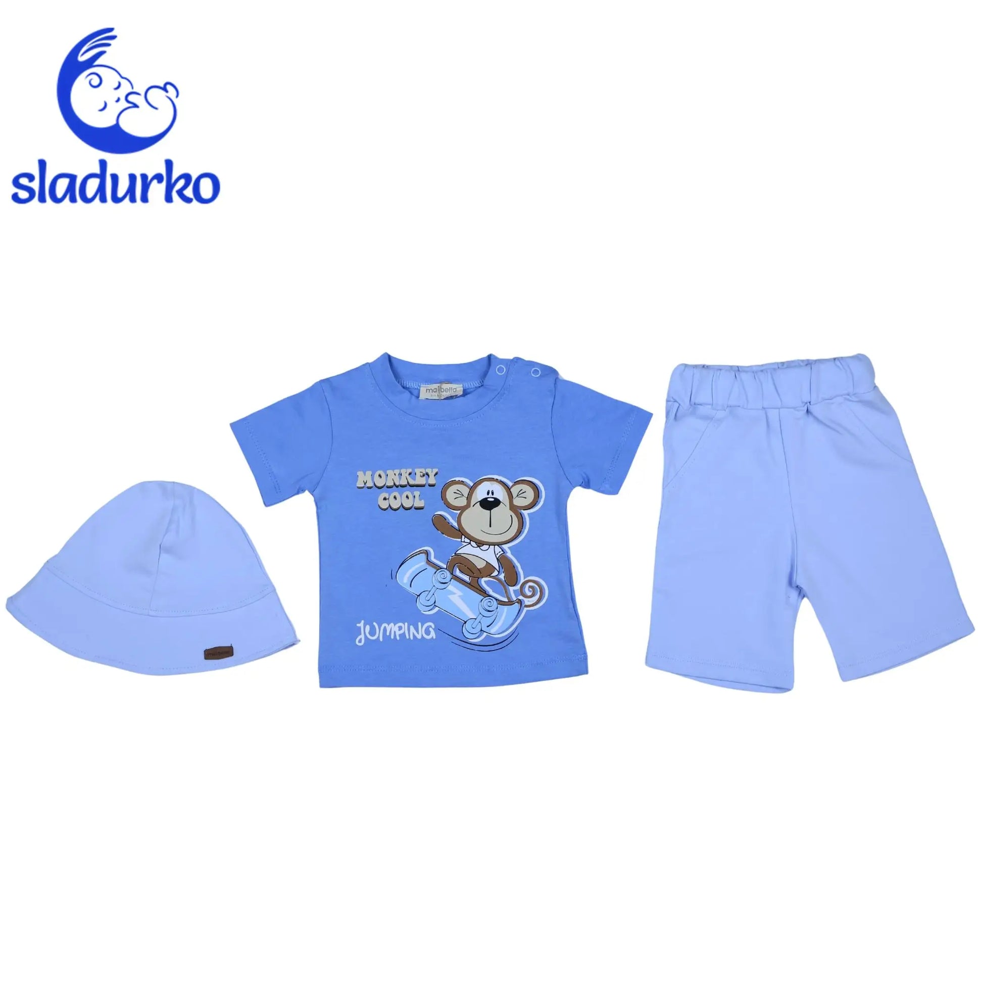 Пригответе вашето малко момче за летни приключения с този забавен и удобен комплект от 3 части! Включваща стилна тениска, практични къси панталонки и симпатична шапка, тази комбинация е идеална за игри на открито и разходки през топлите дни.