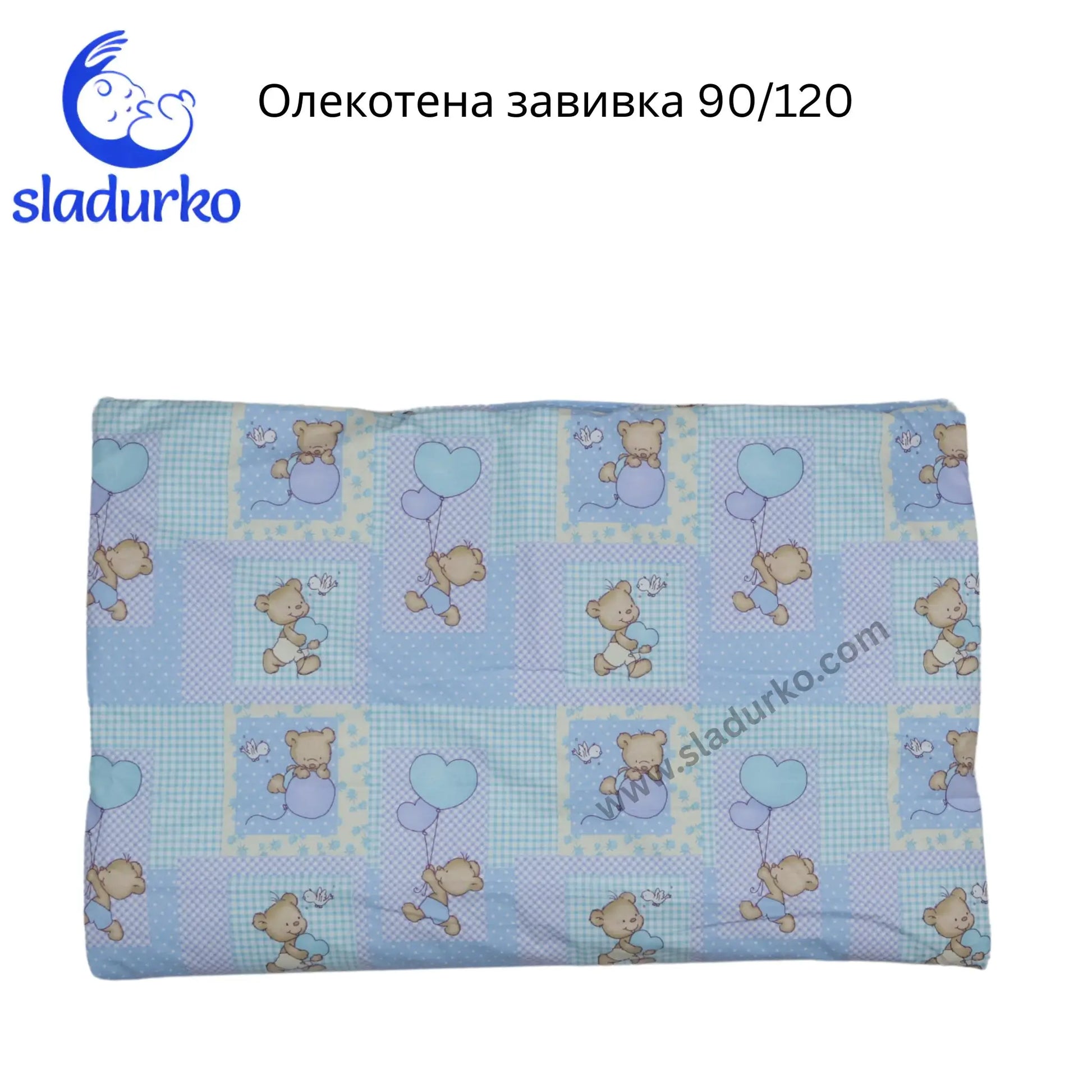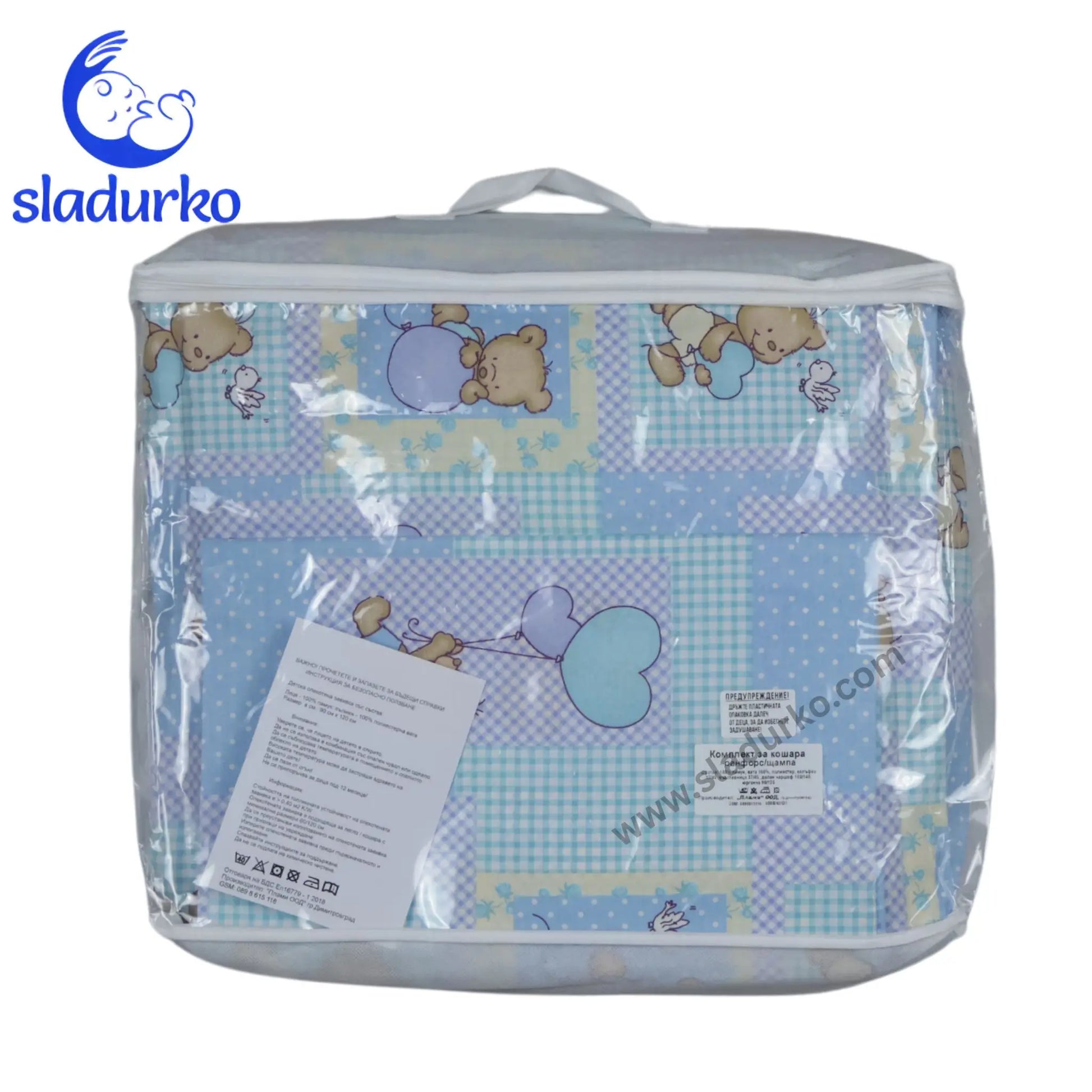 Комплекта включва олекотена завивка, възглавница, долен чаршаф. Олекотената завивка 80 х 120 см (тя е подходяща за легло с минимални размери 60 х 120) . Долен чаршаф 100 х 140 см. Възглавница 45 х 37 см. Калъфка за възглавница 45 х 37 смм.
