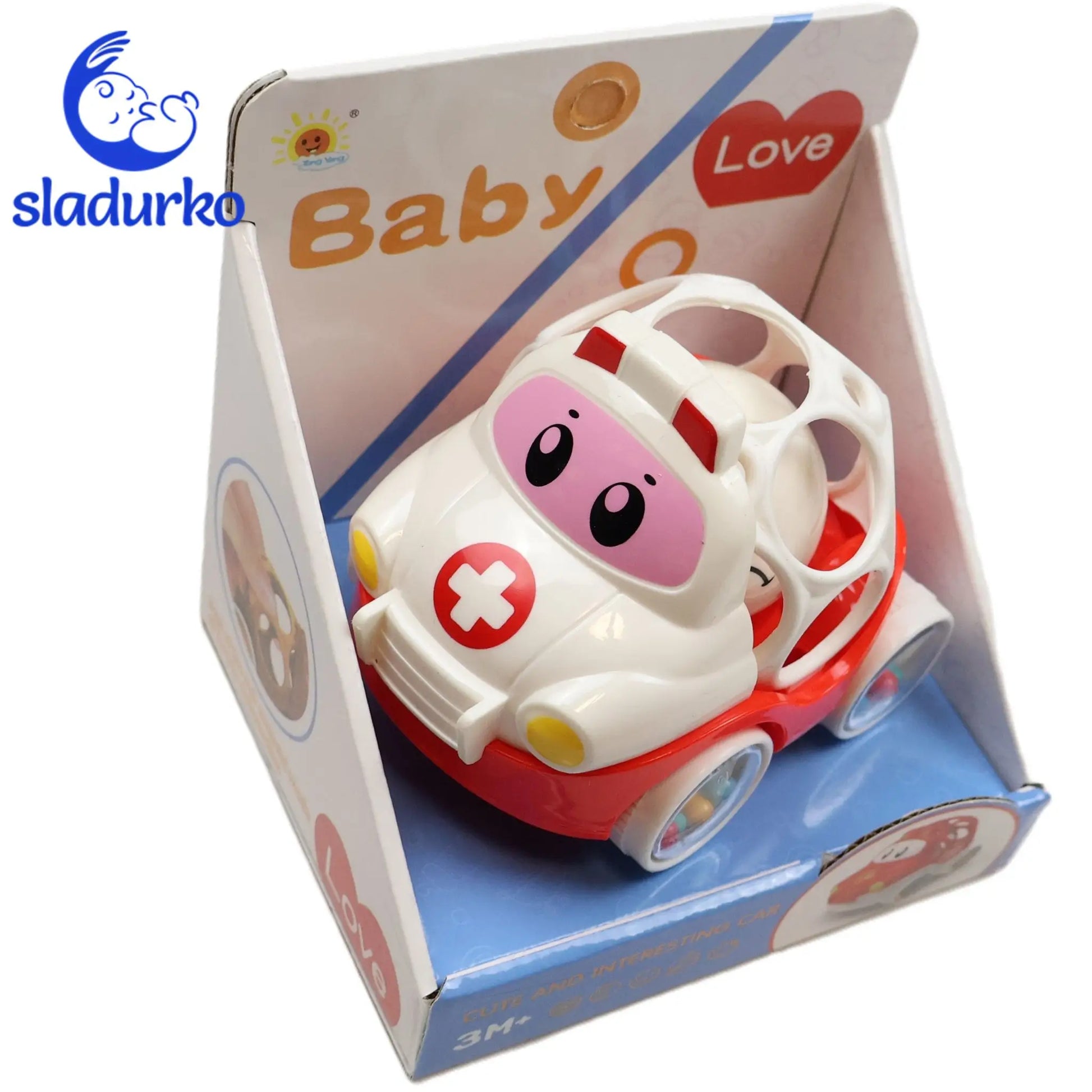 Занимателна дрънкалка - плъзгащо се автомобилче с товар топка с топченца. Мрежестата каросерия на автомобилчето е от мека гума. Дрънкащи топченца има и в колелата на автомобилчето. Играчката развива фината двигателна моторика и координацията у малките деца. Размери - 10 * 8.5 * 8 см.