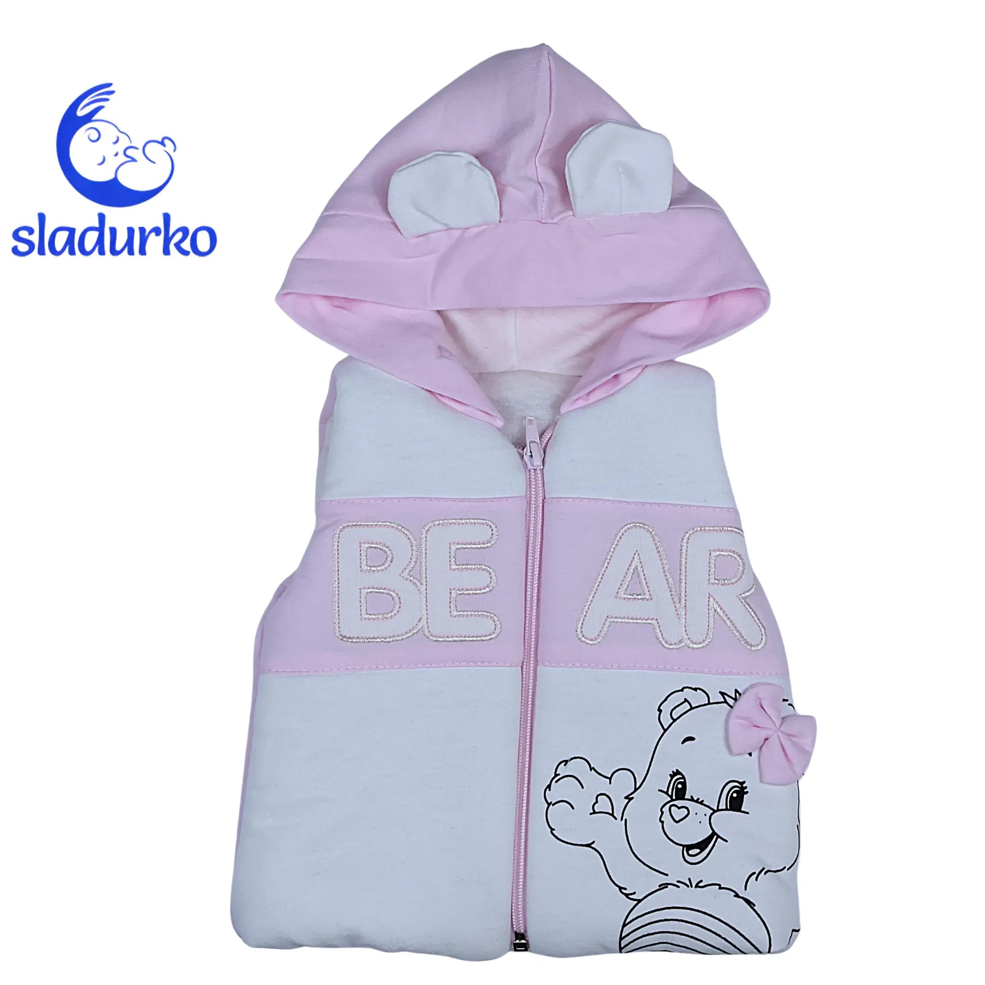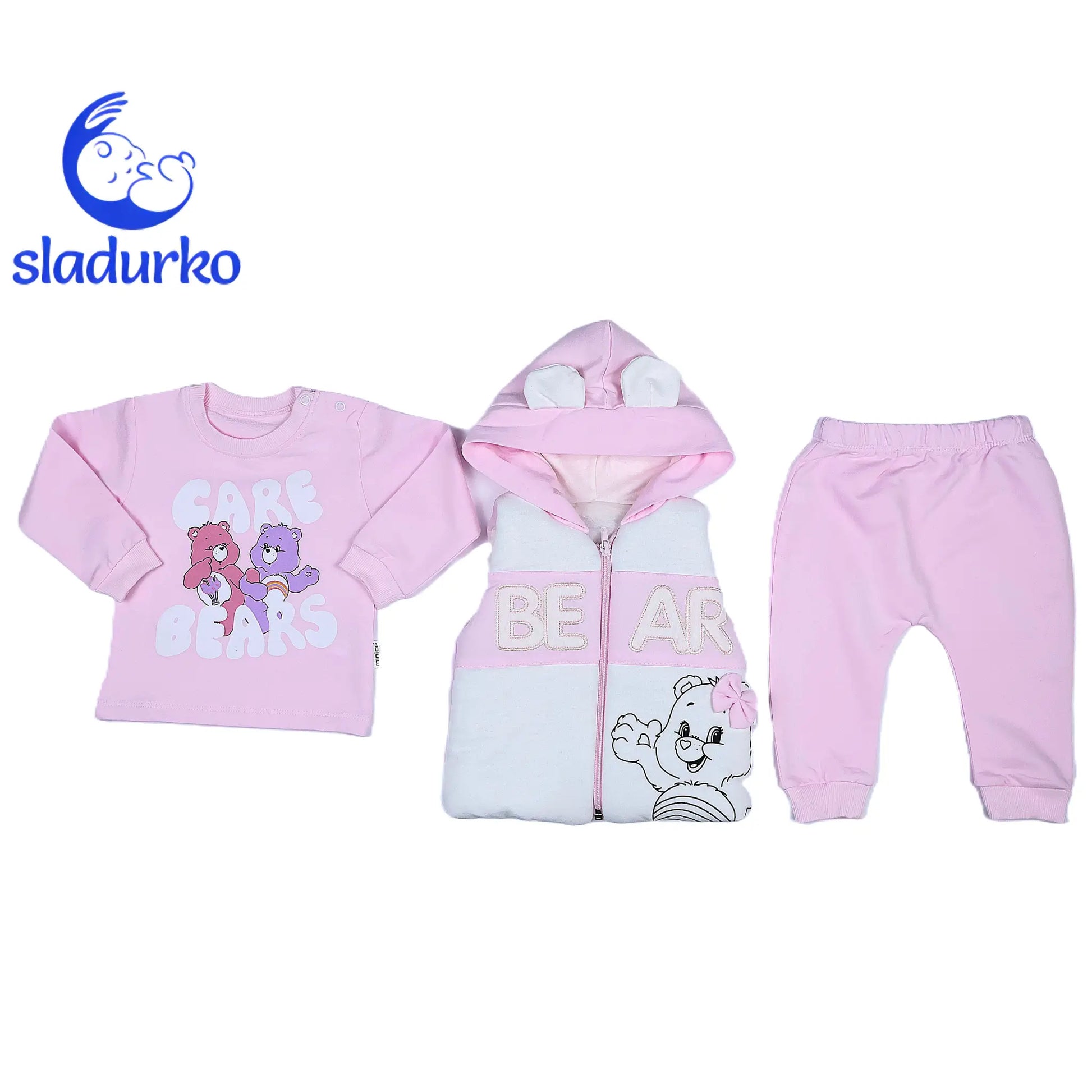 Комплекта е леко умален виж таблицата с размери. Елек с качулка и цип, блузка с дълъг ръкав, панталонки с ластик на колана и маншети на крачолите. Възможно е цвета да се различава в зависимост от екрана и настройките на вашето устройство.