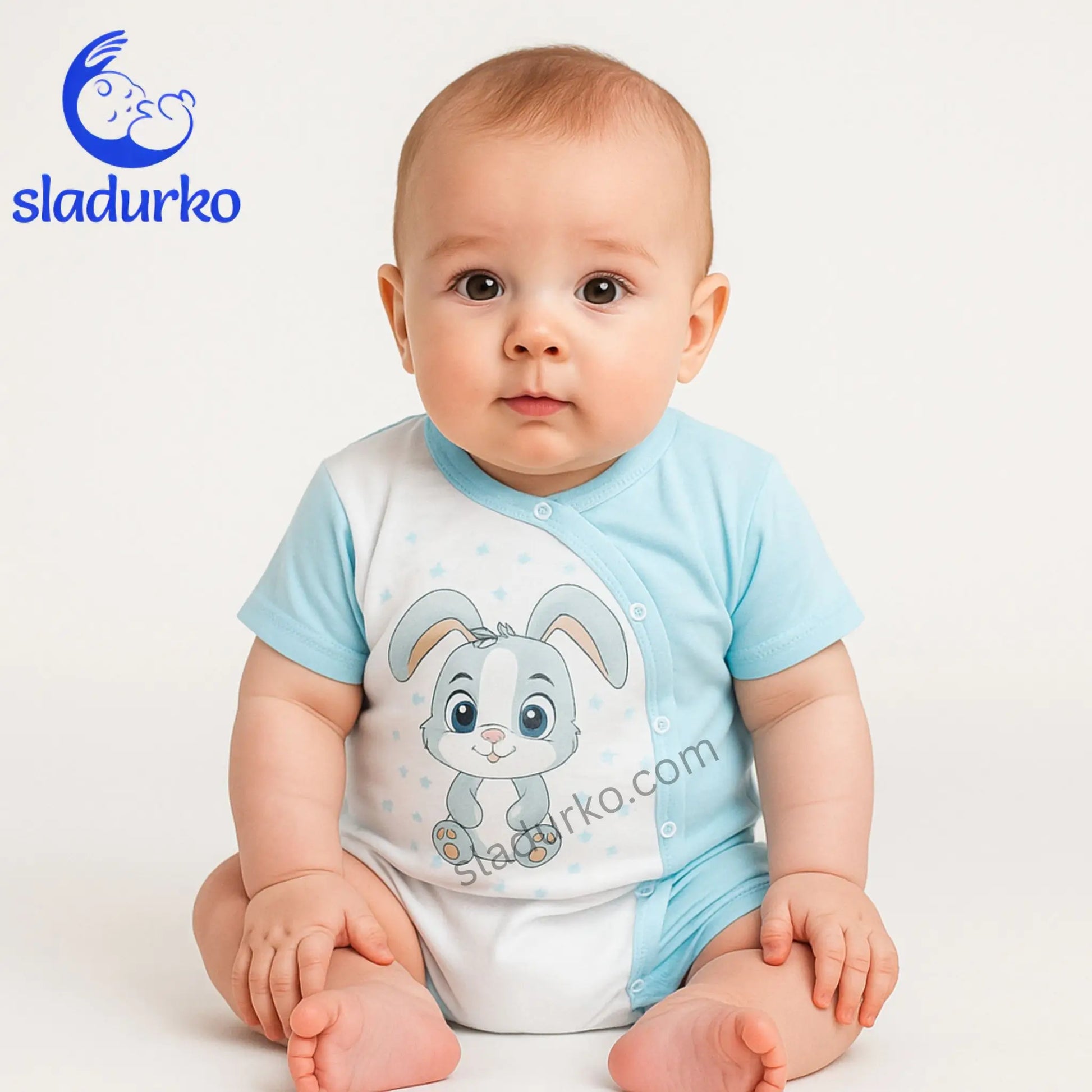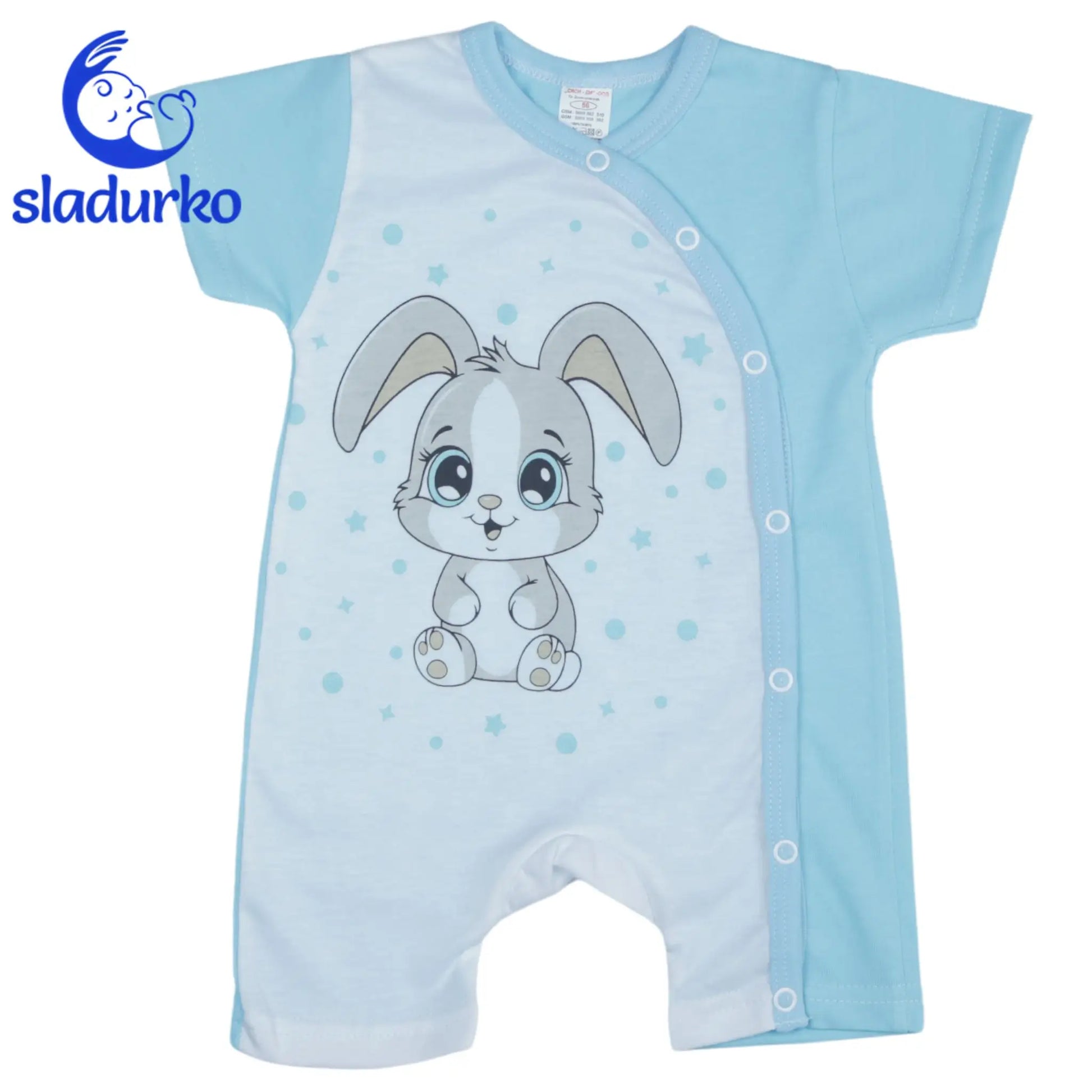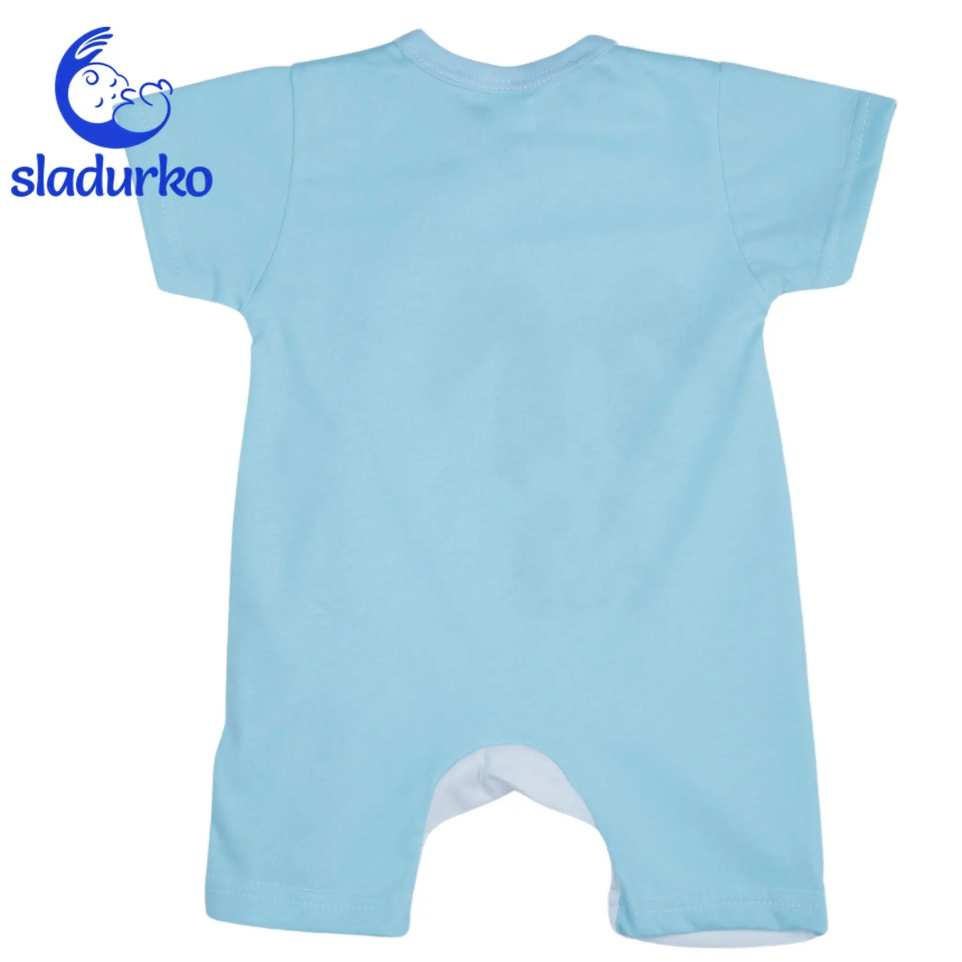 С къси ръкави и къси крачоли, той е идеален за топлите дни. Закопчаването е по цялата дължина отстрани с копчета тип "тик-так", което улеснява преобличането и смяната на пелени.