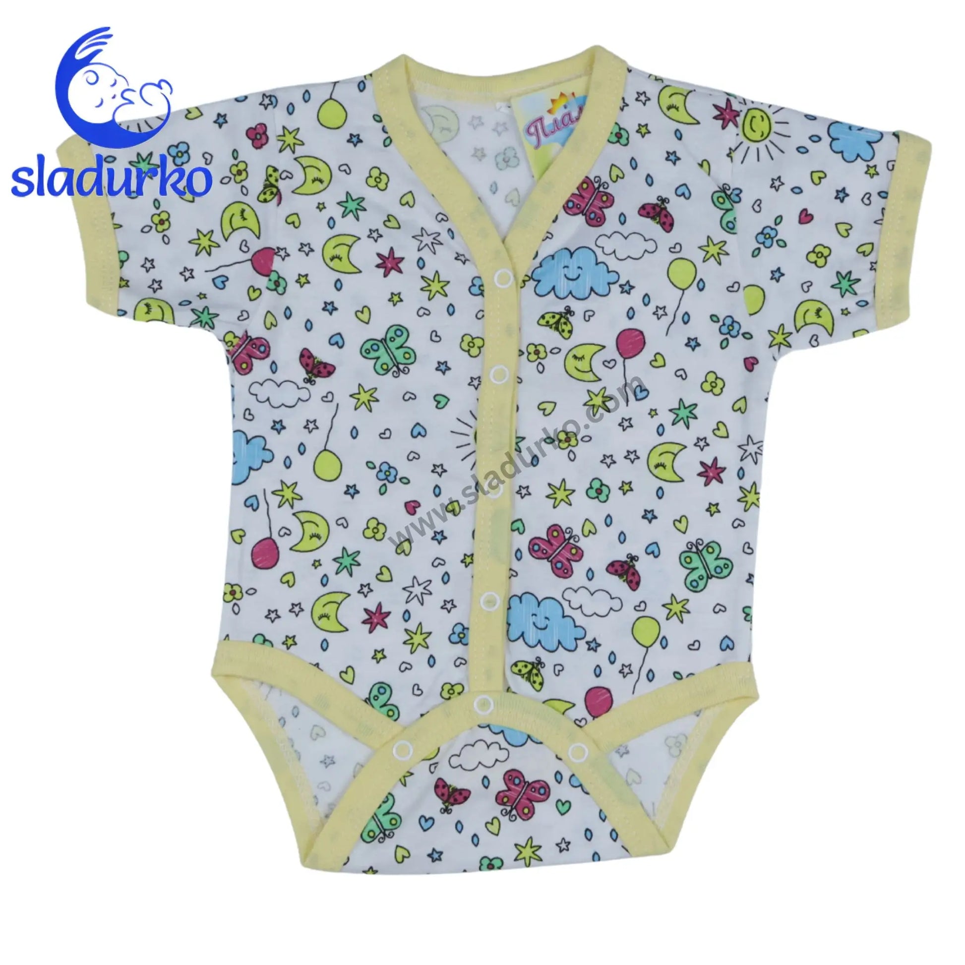 Меко и удобно бебешко боди с къс ръкав, изработено от 100 % висококачествен памучен трико, което нежно гали кожата на вашето мъниче.