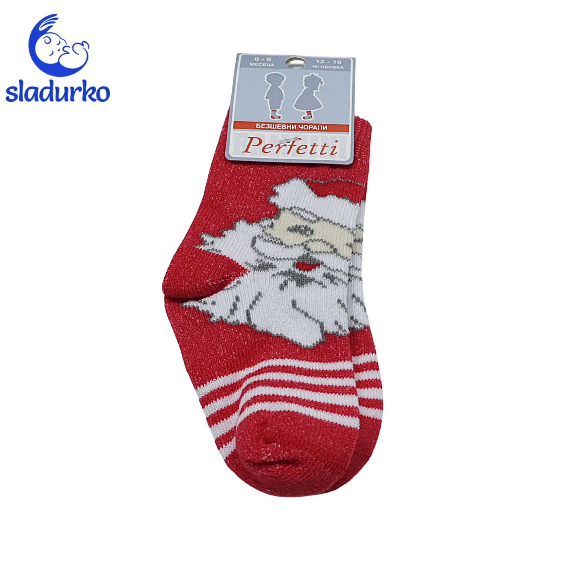Допълнителен елемент на комфорт и стил. Включени са меки бебешки чорапки с тематичен коледен мотив ( Дядо Коледа ), които допълват перфектно гащеризона.