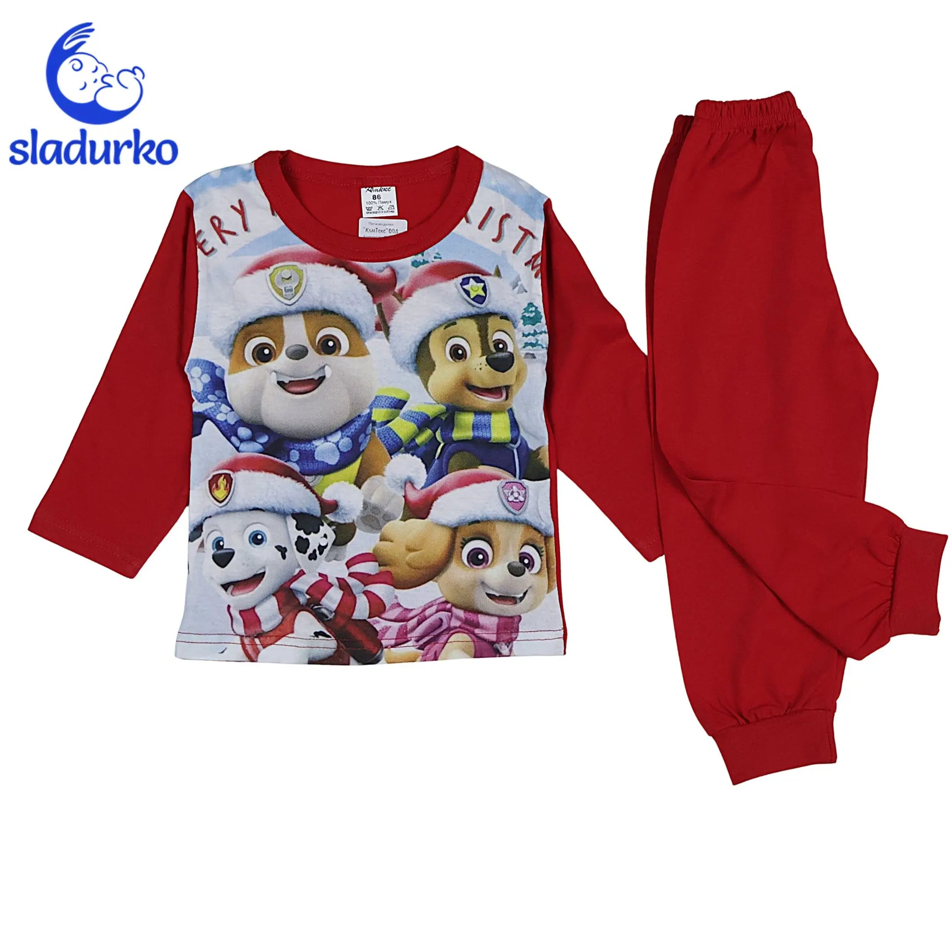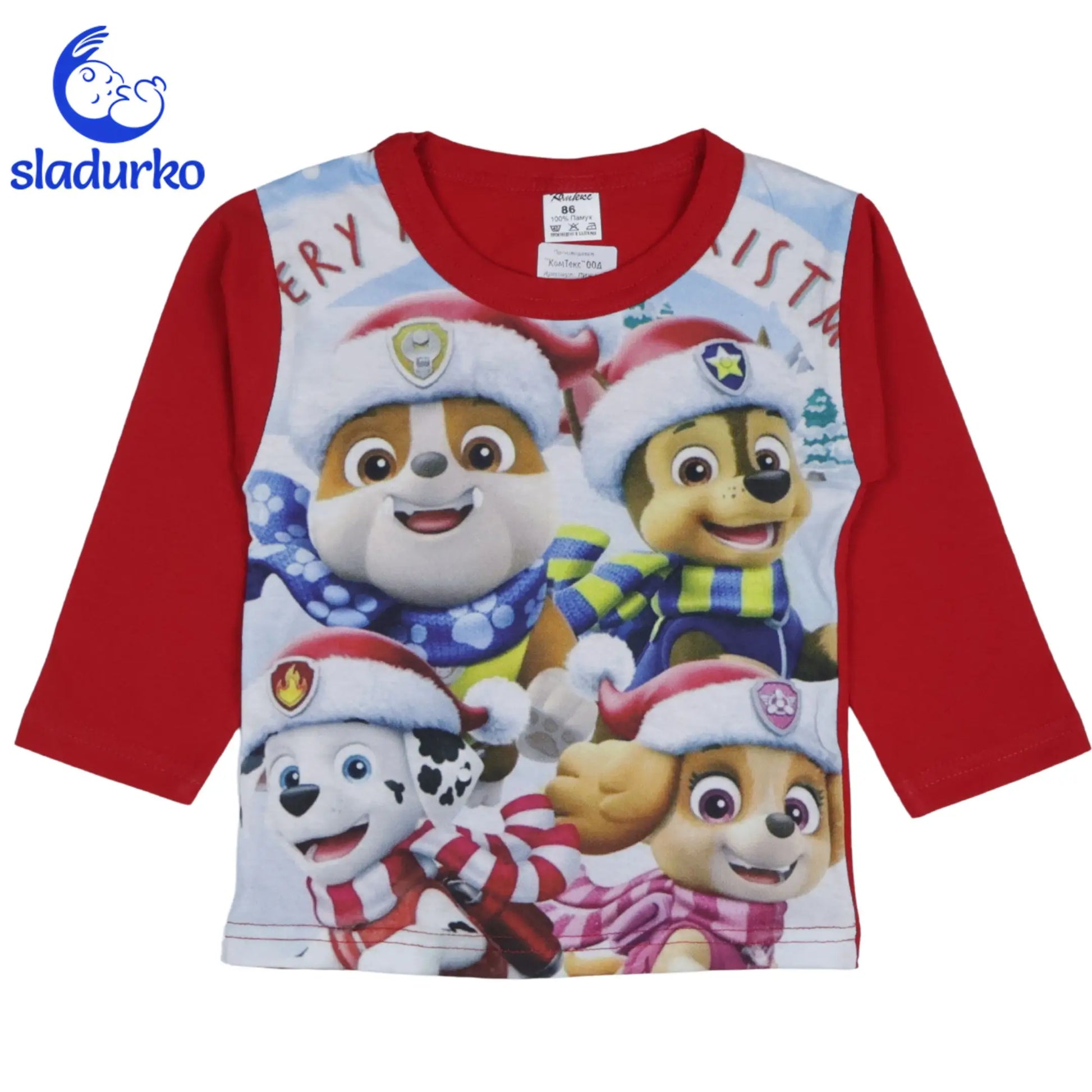 Връхна Част: Блузата е с дълъг ръкав в комбинация от бял преден панел и яркочервени ръкави. Предната част е с голям, цветен принт на кученцата , облечени в коледни шапки и шалове. Надписът "MERRY CHRISTMAS" допълва празничната визия.