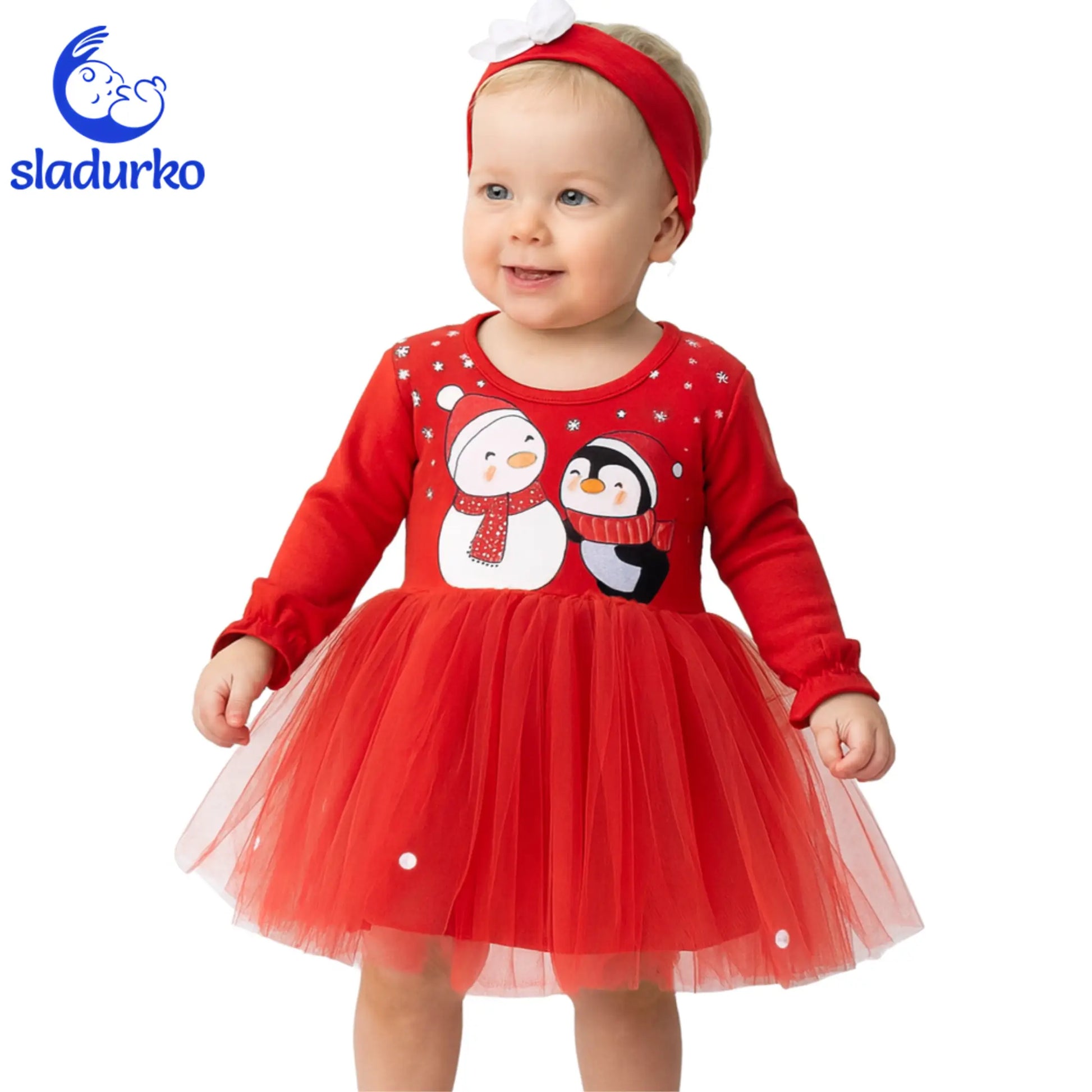 Коледна рокля с лента за глава „Пингвинче и Снежен човек“