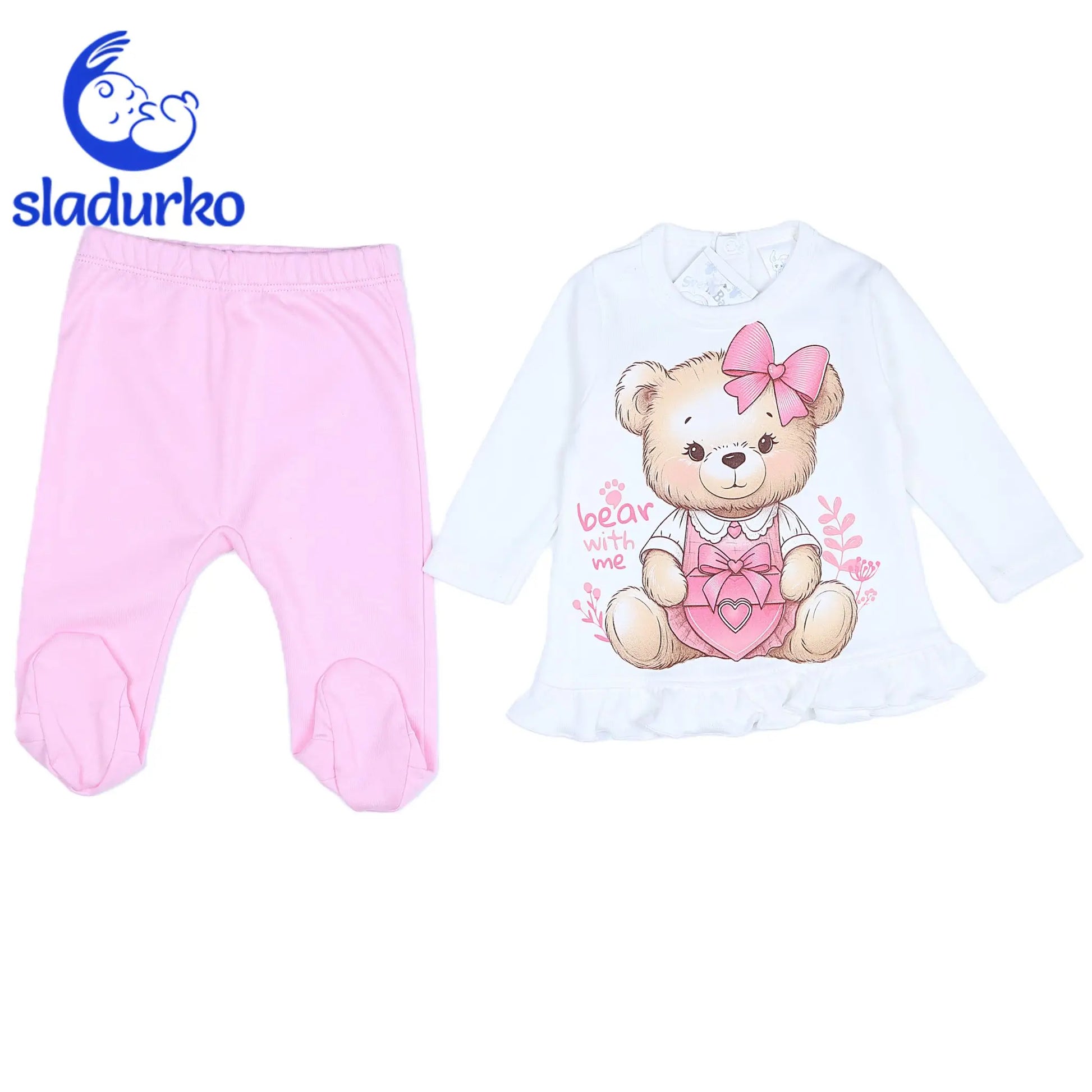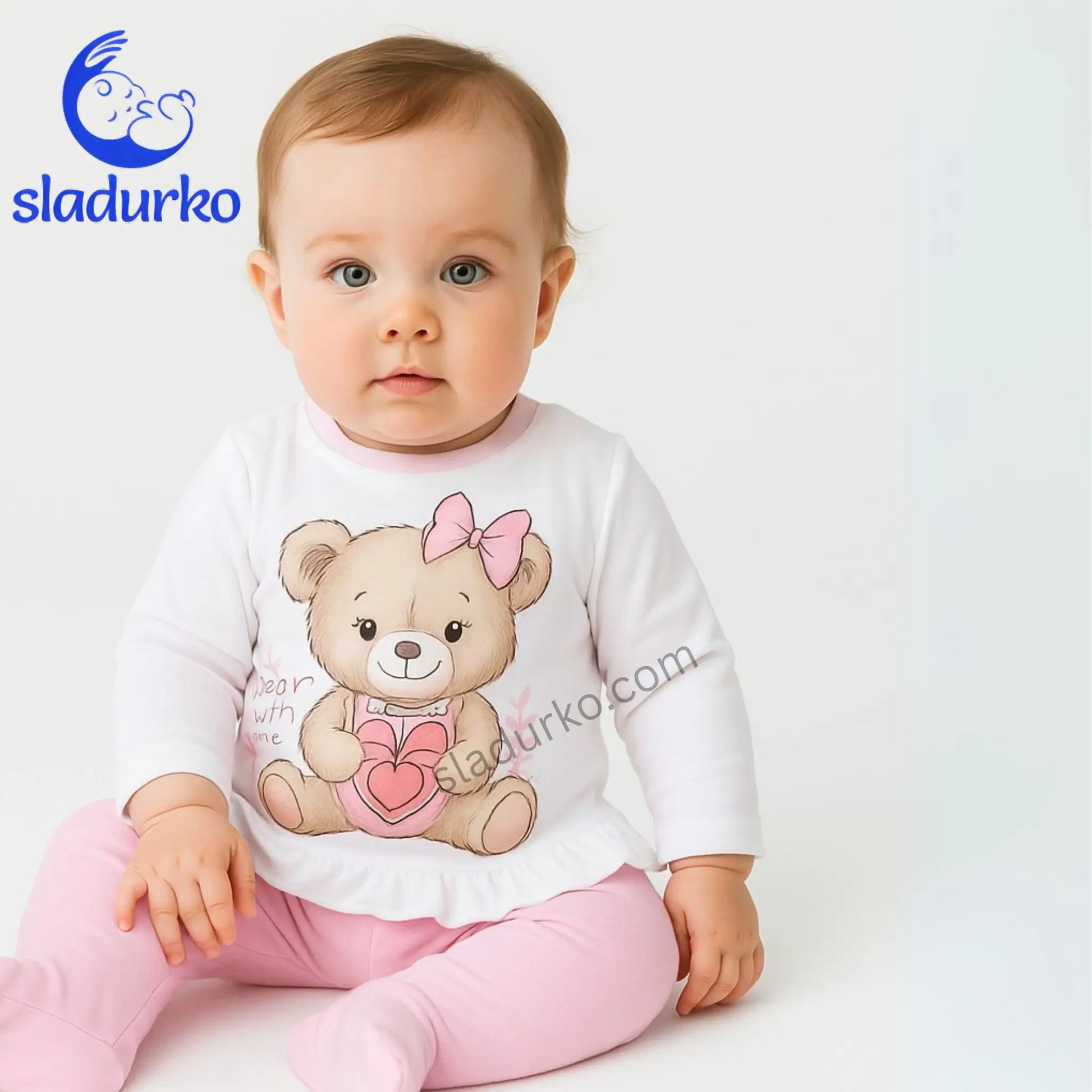 Този нежен и сладък комплект е идеален за вашето малко съкровище. Състои се от удобна блуза с дълъг ръкав и меки ританки, осигурявайки комфорт и очарователна визия през целия ден.