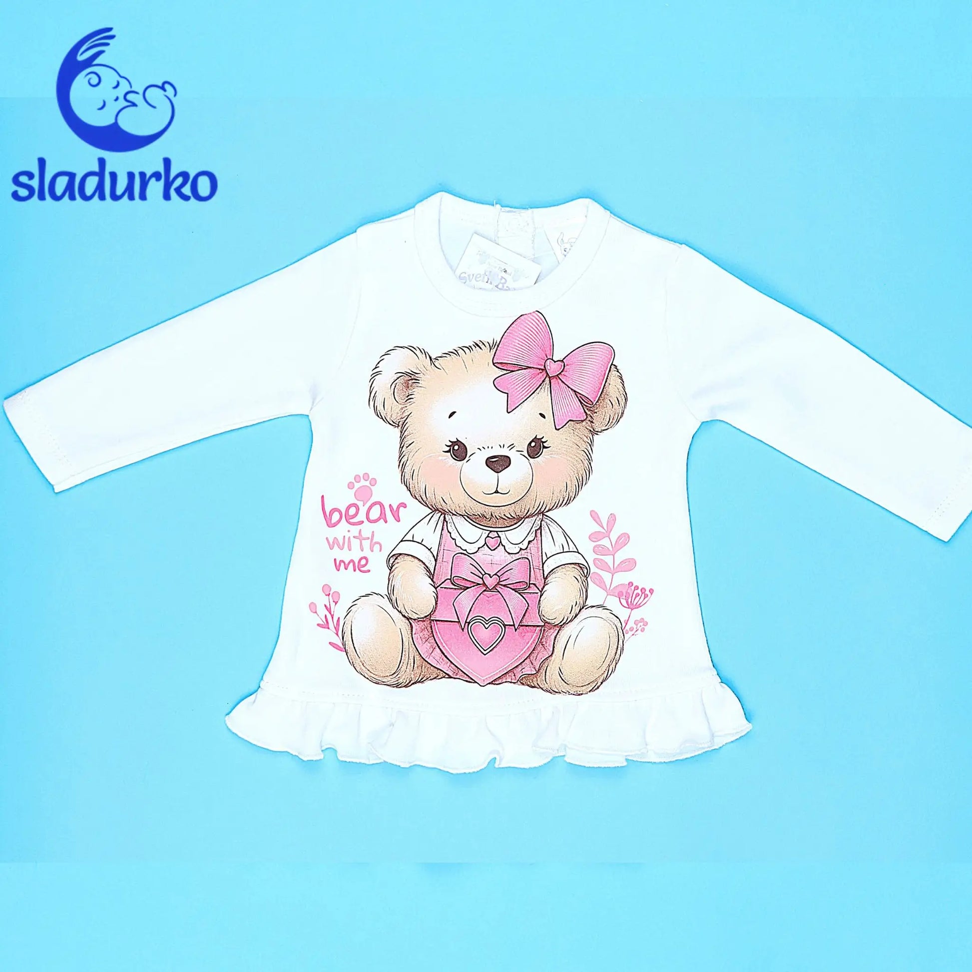 - Блуза: Бяла блуза с дълъг ръкав и нежна апликация на сладко мече с розова панделка на главата и сърце в ръцете. Декорирана с малки розови сърчица и надпис "bear with me". Закопчаване с копчета на гърба за лесно обличане. С къдрички в долната част.