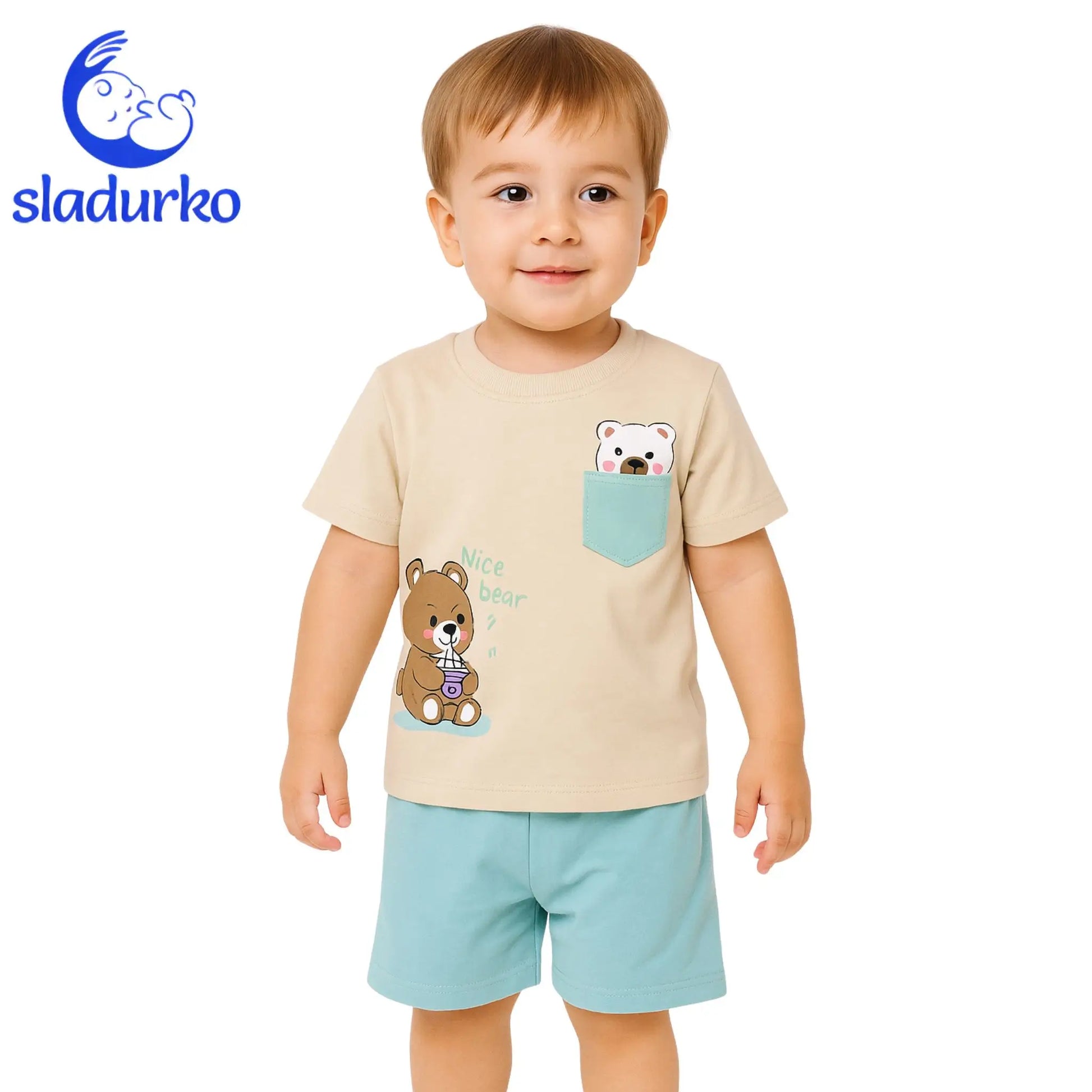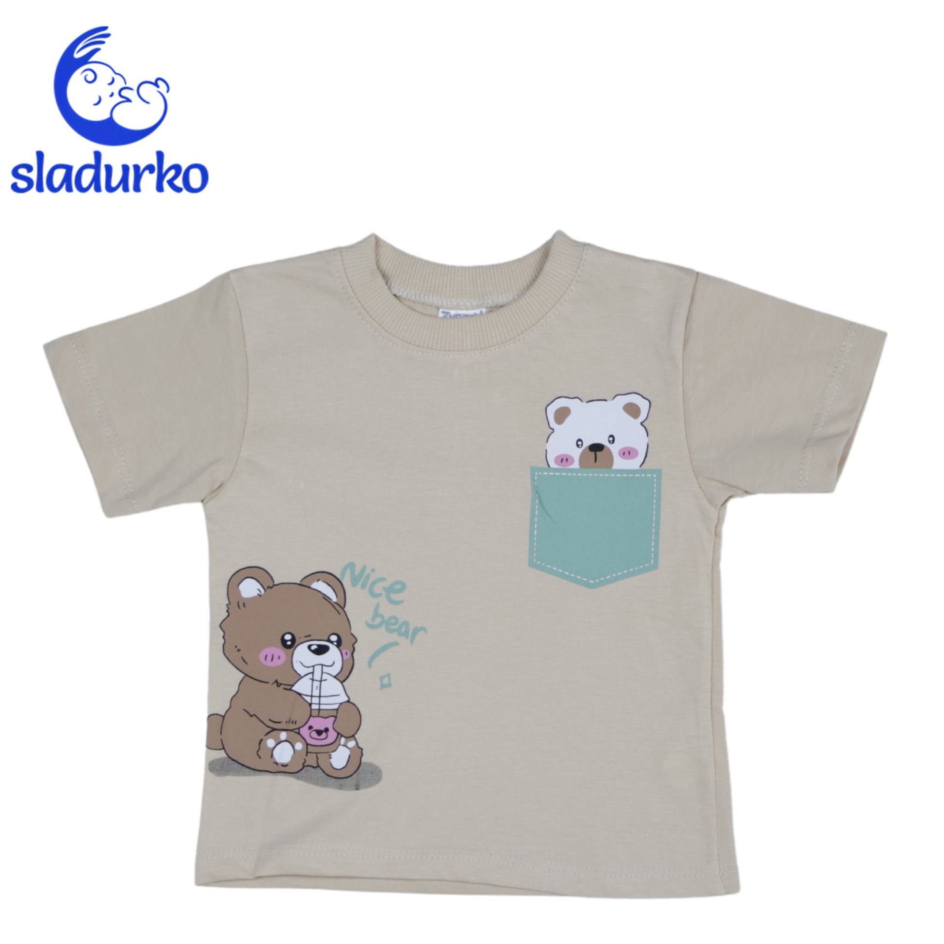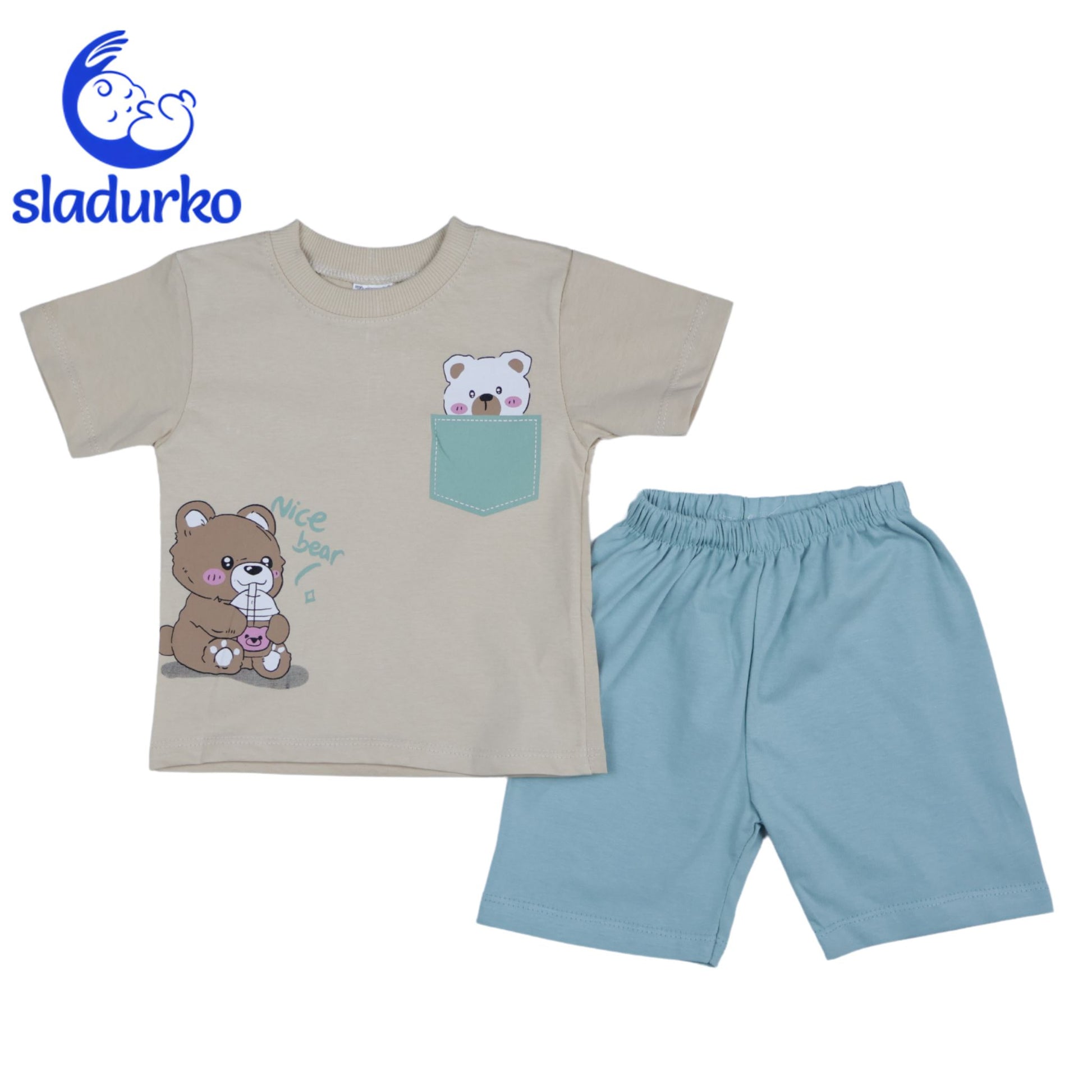 Изработен от мека и висококачествена материя, комплектът е нежен към чувствителната детска кожа. Тениската е в приятен бежов цвят, украсена с две сладки мечета. Късите панталонки са в хармоничен зелен цвят, с ластик на талията за лесно обличане и максимален комфорт.