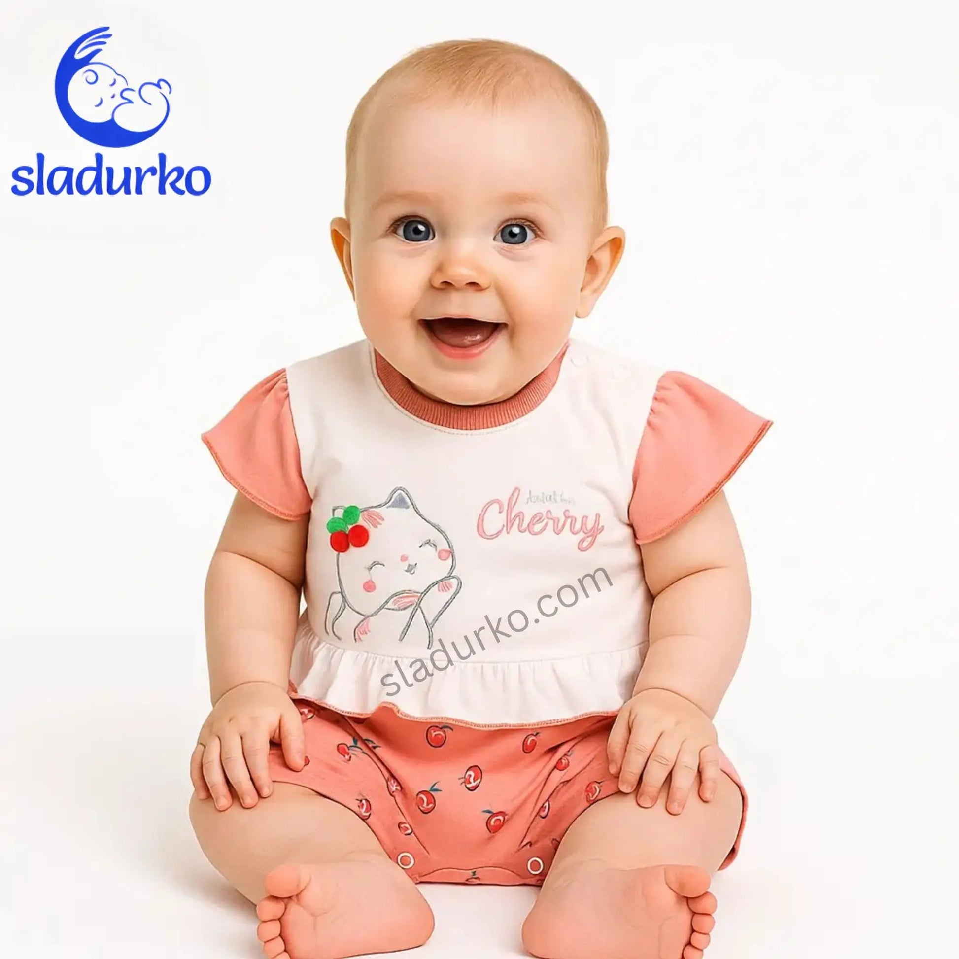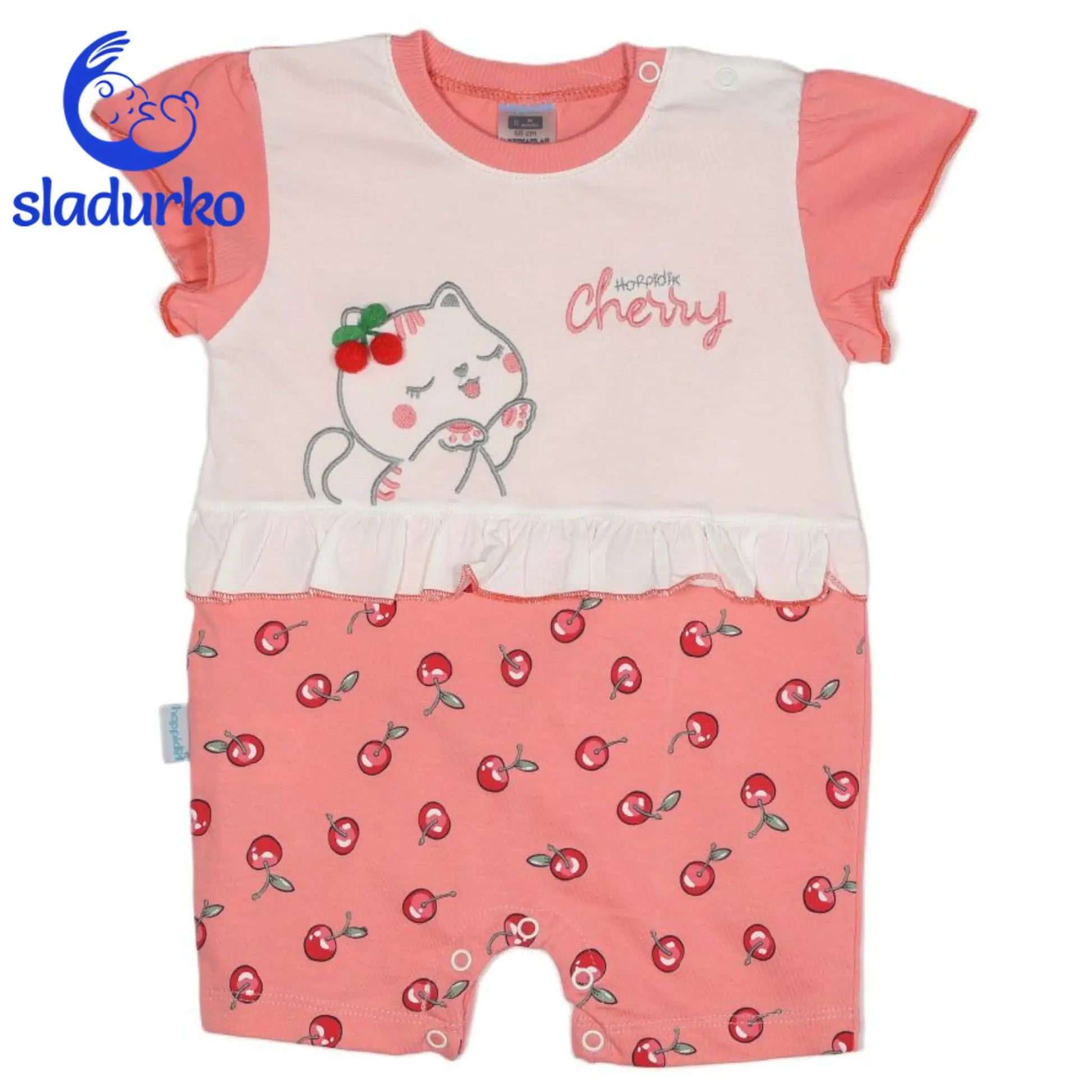 Бебешкият ромпър за момиче с къс ръкав е перфектен избор за топлите дни. Изработен от 100% памук, материята е лека, дишаща и нежна към кожата на вашето бебе, осигурявайки му комфорт през целия ден. Ромпърът е удобен за обличане и събличане, което улеснява родителите. Долната част е в цвят праскова, украсена с весел принт на черешки, добавяйки игрив акцент към визията. Горната част е бяла с красива бродерия на коте, която придава сладък и очарователен вид. Ромпърът се предлага в размери 56, 62 и 68.