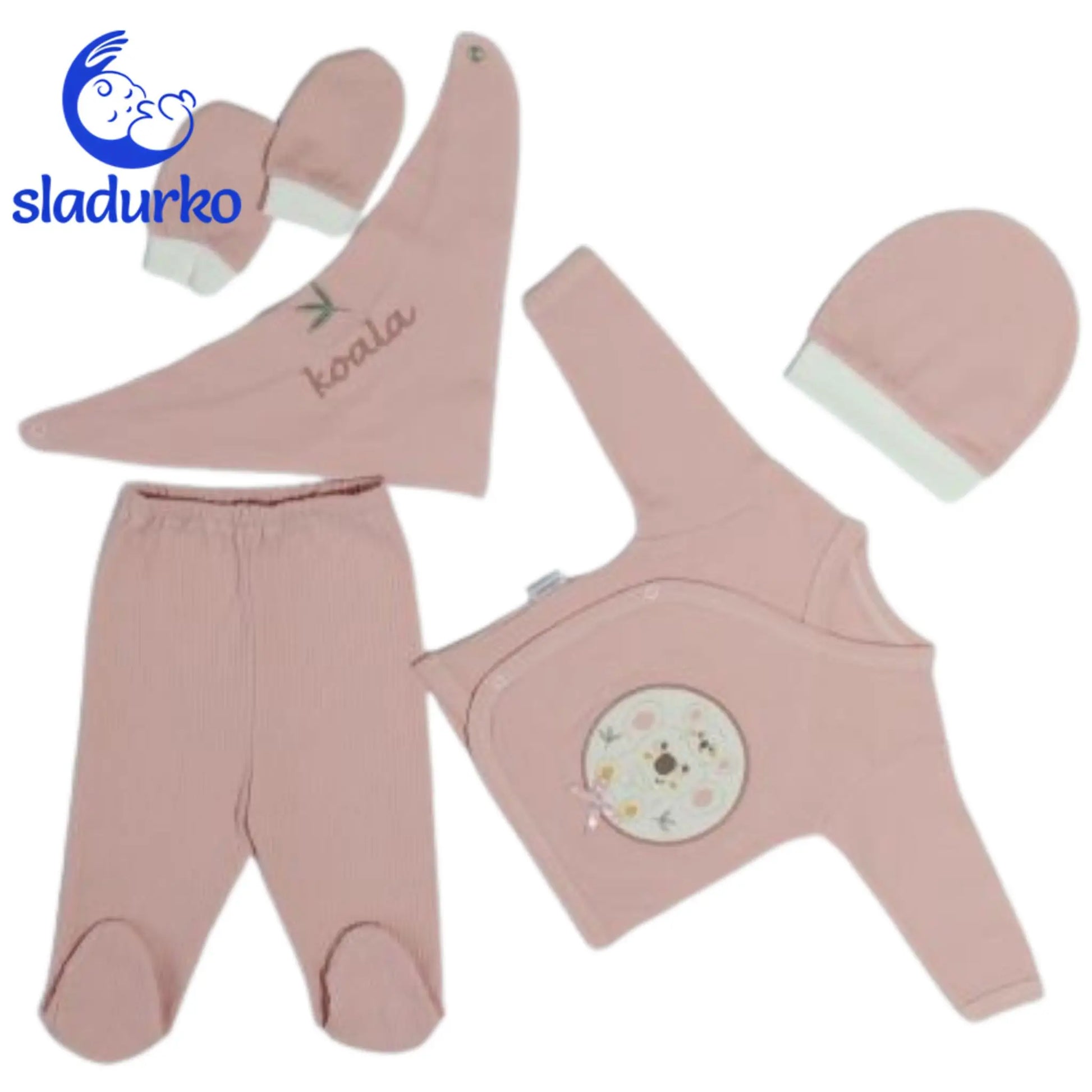 Този комплект от 5 части предлага всичко необходим за да облечете вашето бебе в комфорт и стил при първото му появяване у дома. Комплектът съдържа: - Ританки - меки и удобни, осигуряващи пълна свобода на движение - Жилетка - лесна за обличане и събличане, която поддържа бебето топло -Лигавник - стилен и практичен , който предпазва дрешките от разливания на бебето - Ръкавички - предпазват бебето от надраскване - Шапка - поддържа главичката на бебето топла и защитена Изработен от висококачествен дишащ и хипоалергеннен памук, който е нежен към чувствителната кожа на новороденото. Направете първия ден у дома специален с нашия комплект