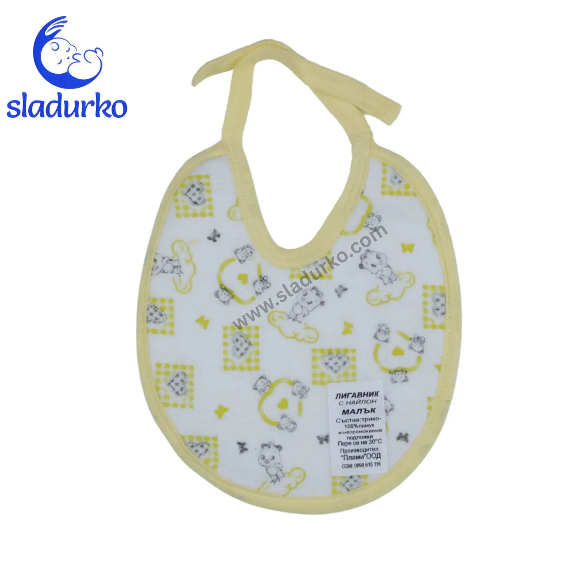 Практичен и нежен бебешки лигавник, изработен от два слоя – външен слой от 100 % мек памучен трико и вътрешен слой от непромокаема плащовка. Осигурява защита на дрешките при хранене .