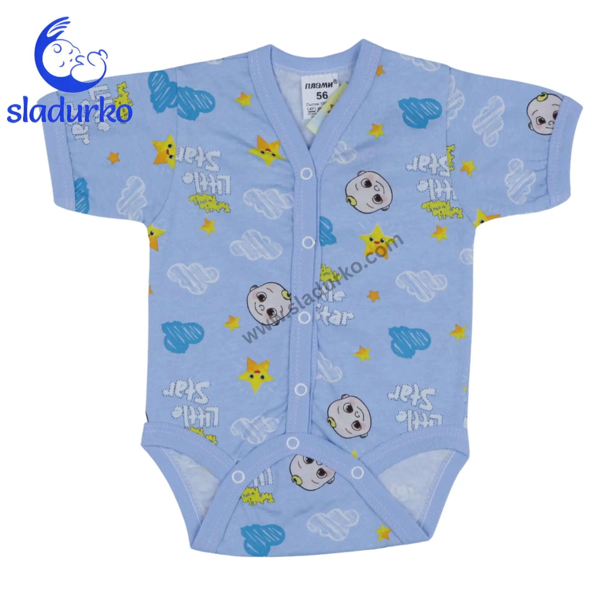 Меко и практично бебешко боди с къс ръкав от 100 % фин памук, подходящо за ежедневна употреба и сън. Деликатната светлосиня основа е украсена с усмихнати звездички, пухкави облачета и милите личица на мъничета, създавайки приказно настроение за всяко малко съкровище.
